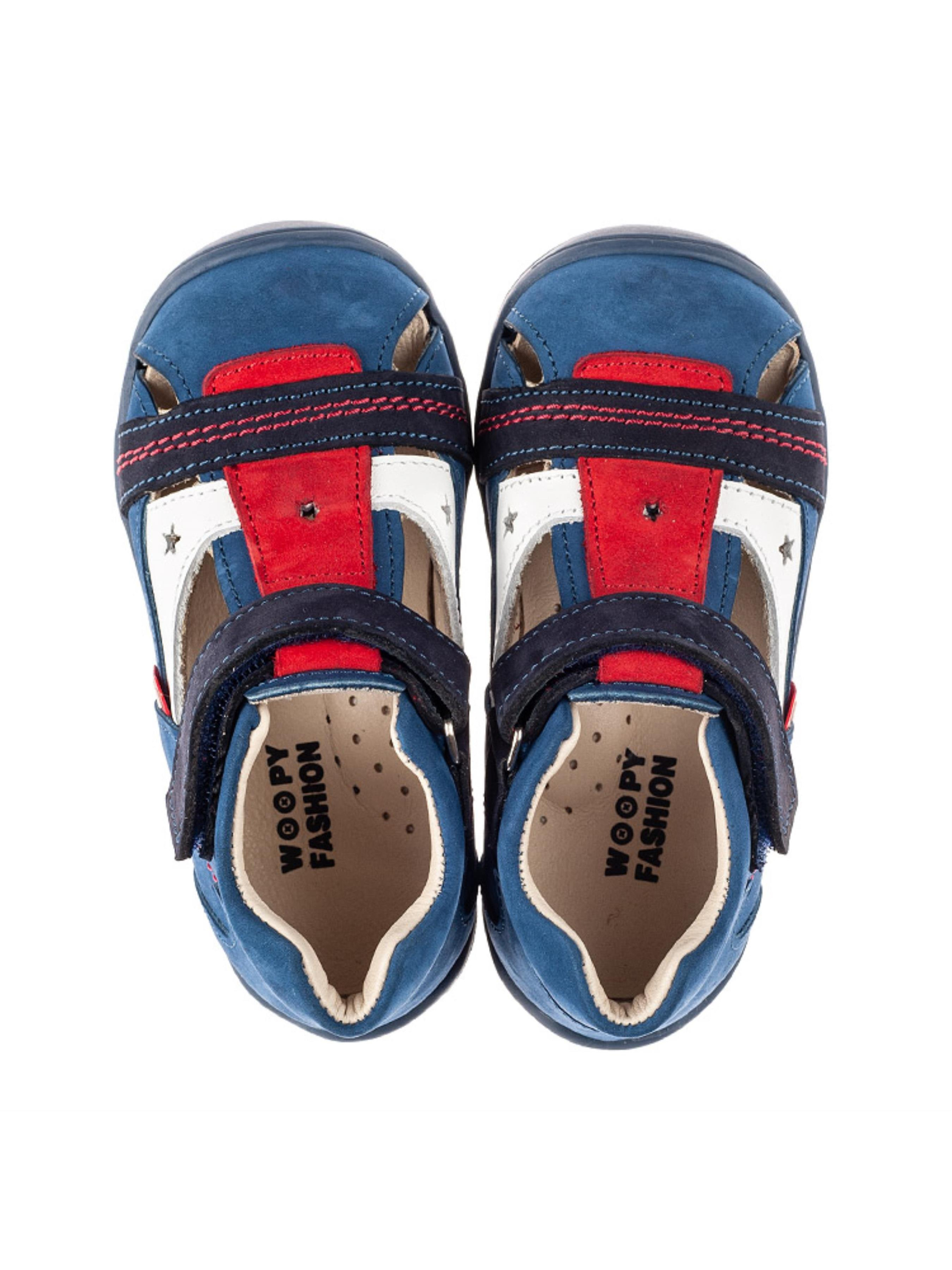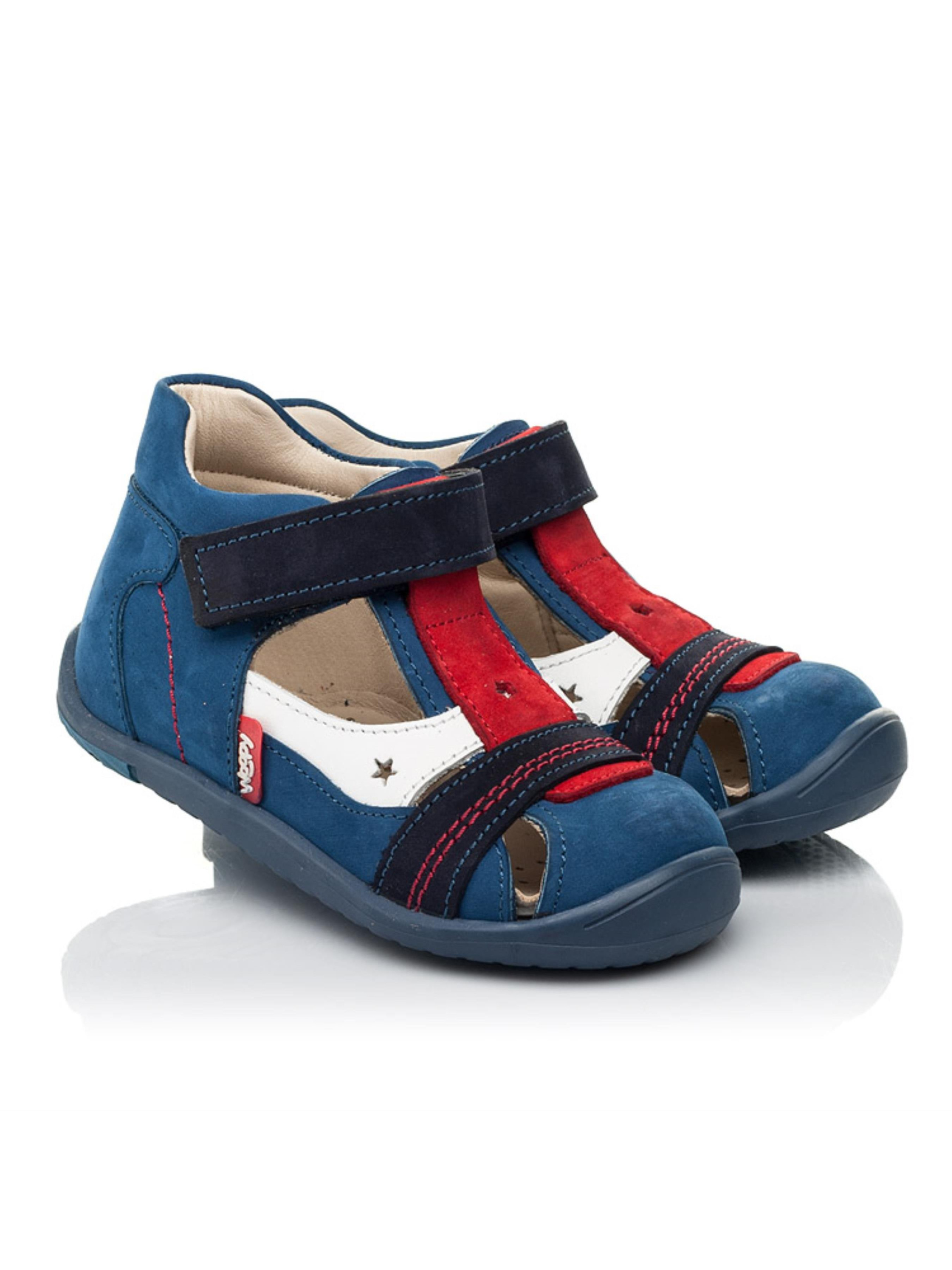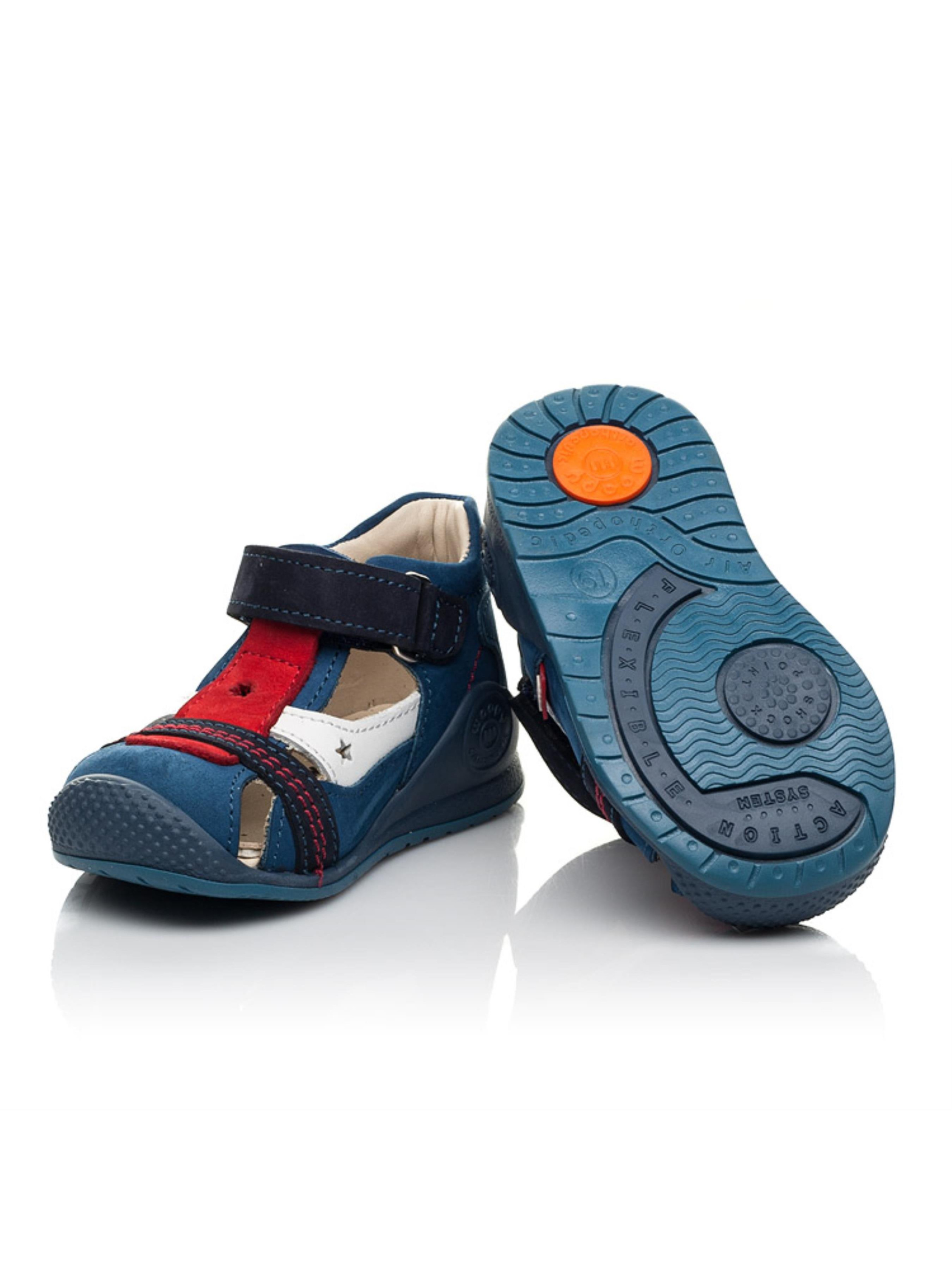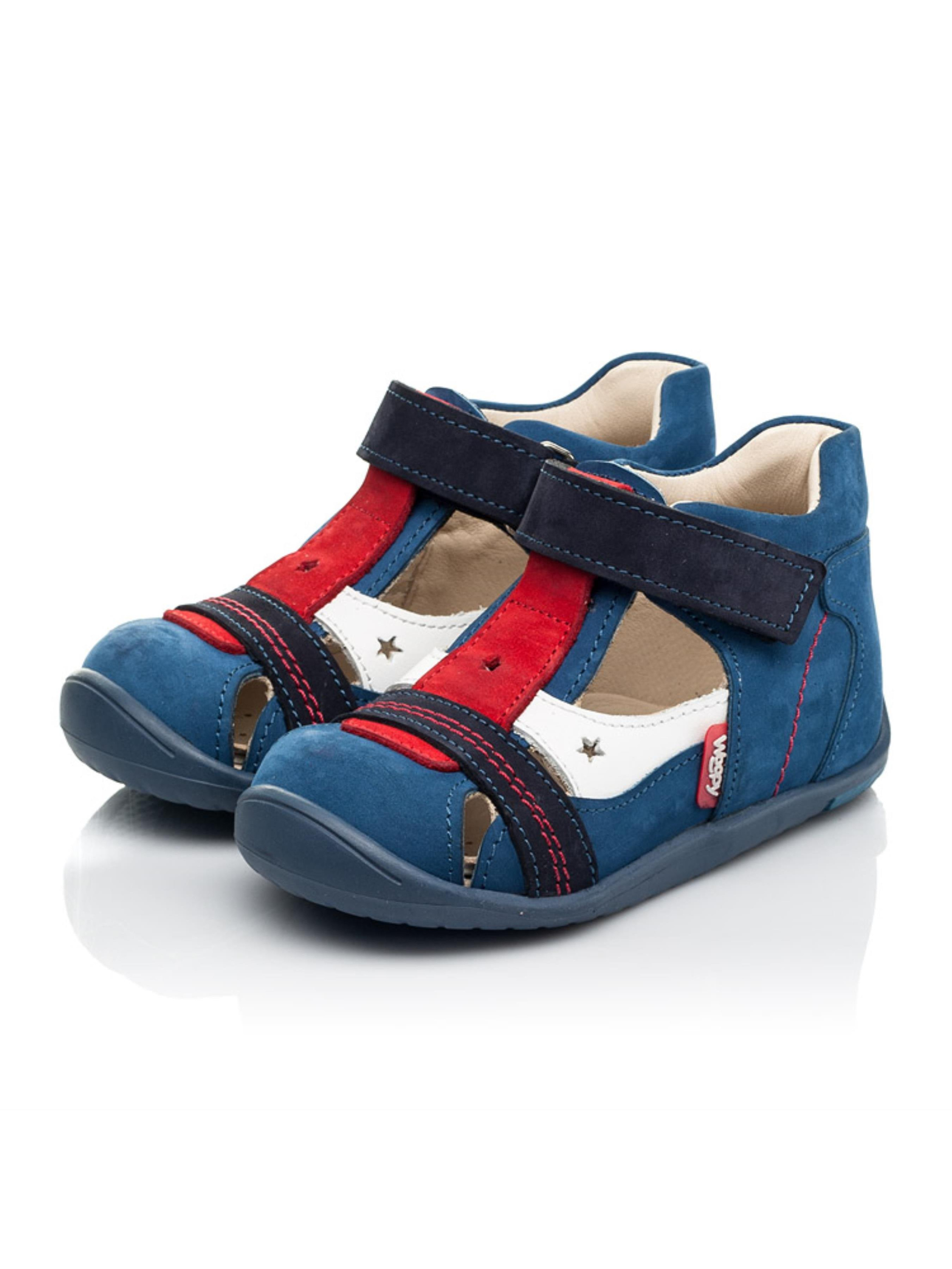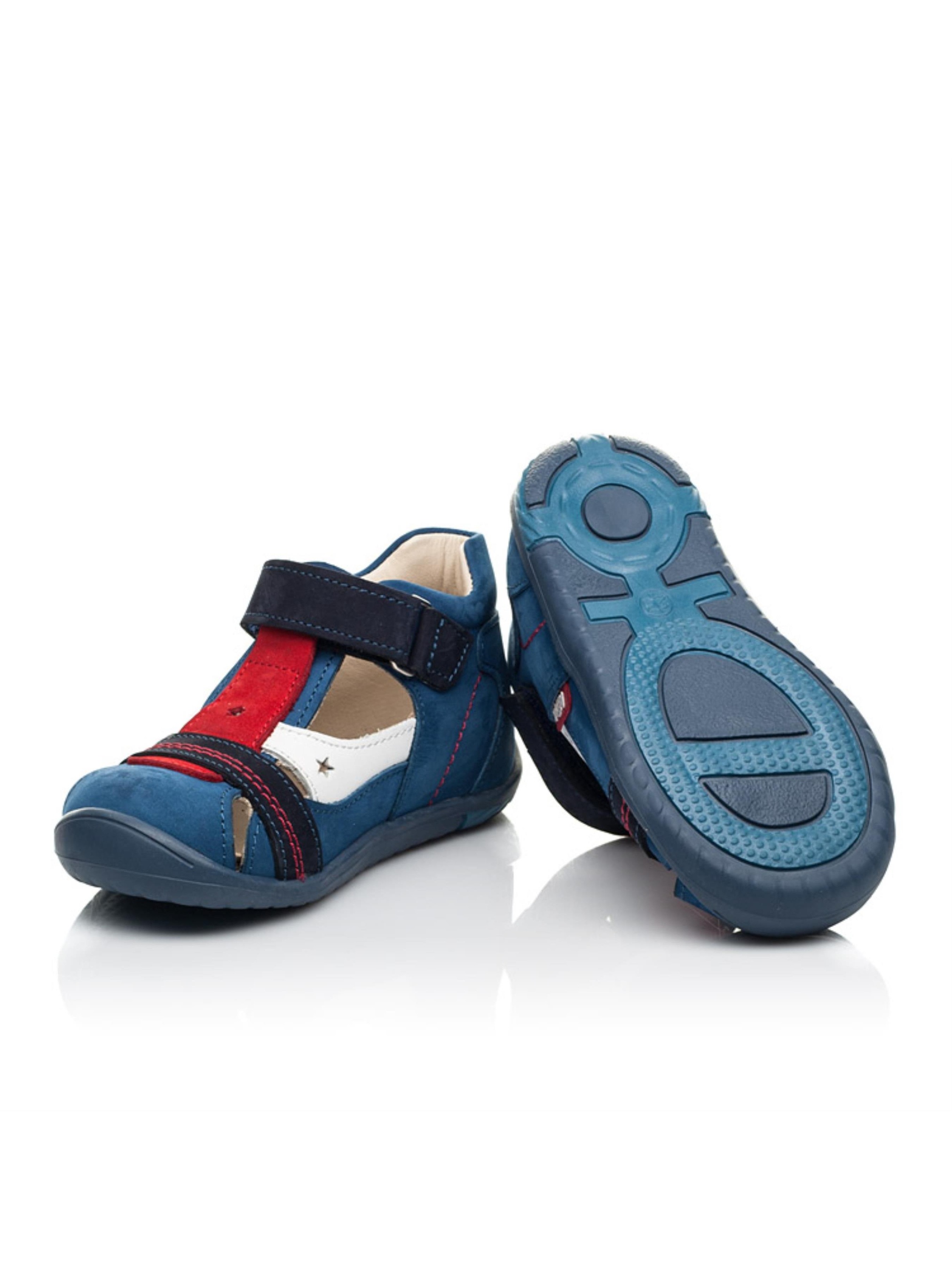 Закрытые детские босоножки для мальчика созданные исключительно из натуральных материалов. Для пошива модели за основу наши дизайнеры взяли натуральный нубук синего цвета, который дополнили вставками насыщенного красного и темно-синего цветов. Материал подкладки и стельки - натуральная кожа. Контрастно на фоне синего нубука выглядит вставка из натуральной кожи белого цвета. Уникальность дизайна поражает стильной прошивкой красного цвета и сквозной перфорацией в виде звездочек. Удобство и скорость обувания обеспечит застежка-липучка. Чтобы детским ножкам было комфортно закрытые босоножки пошиты с учетом важных элементов детской обуви: жесткий задник, супинатор и анатомическая стелька.