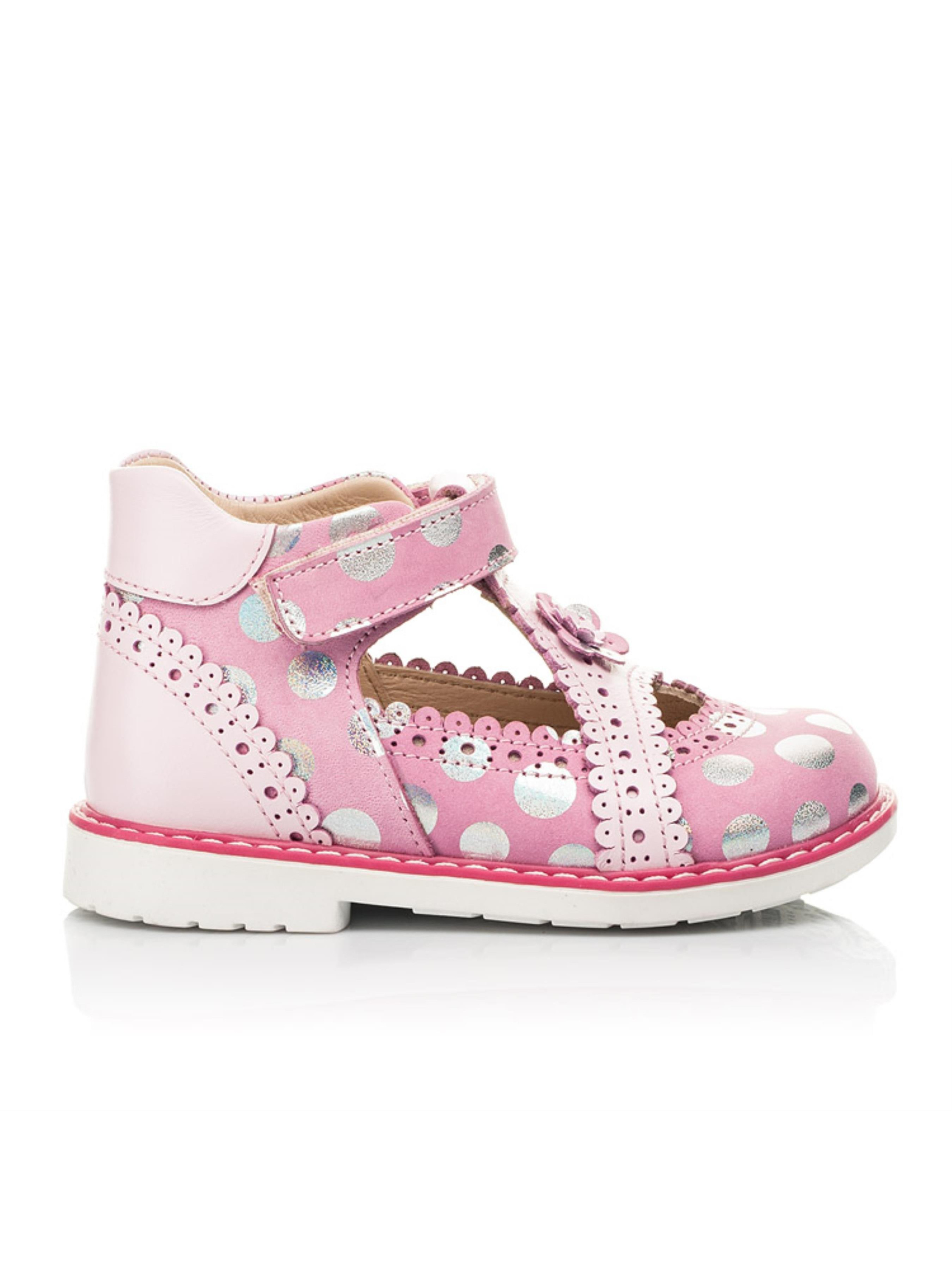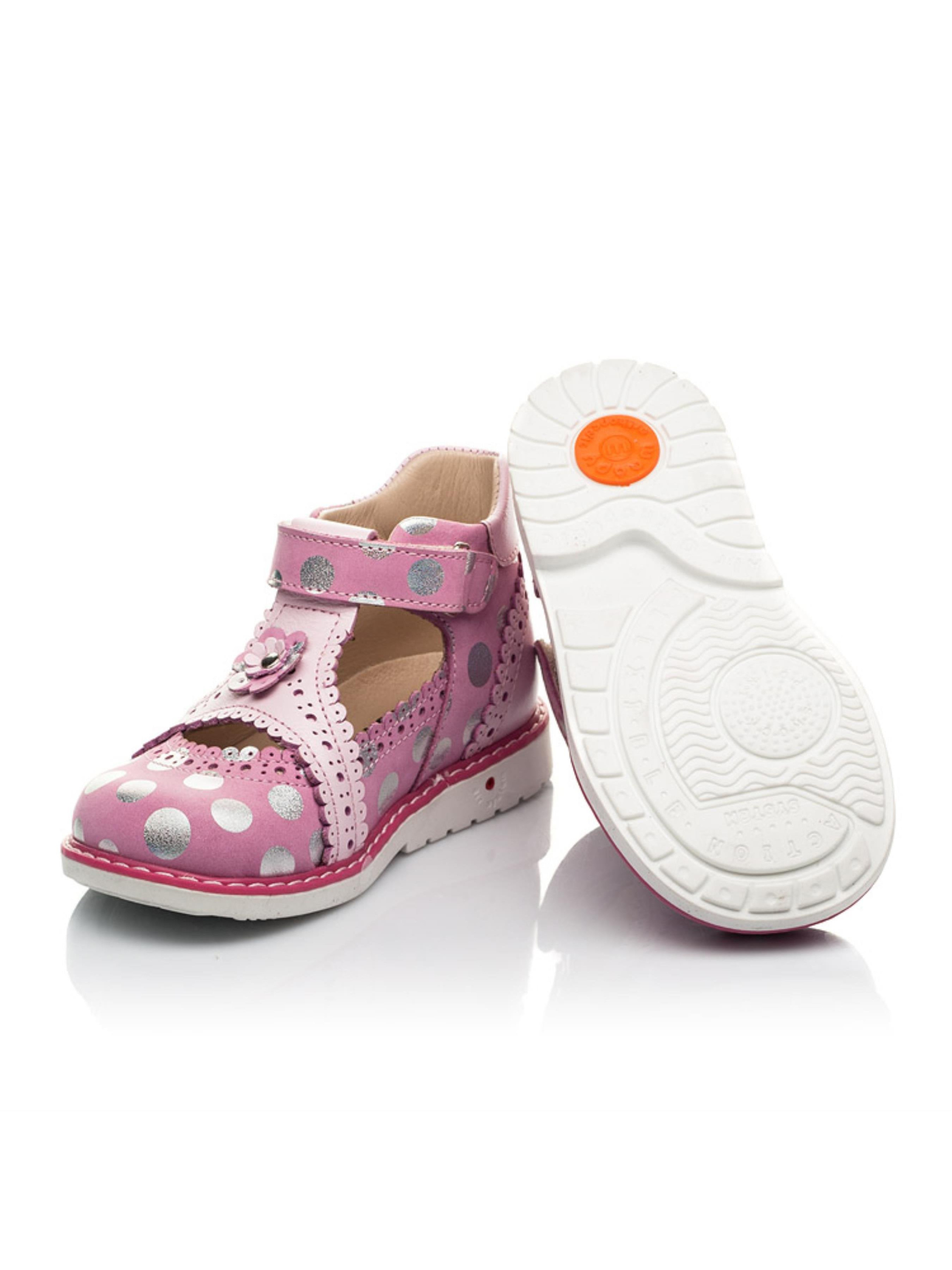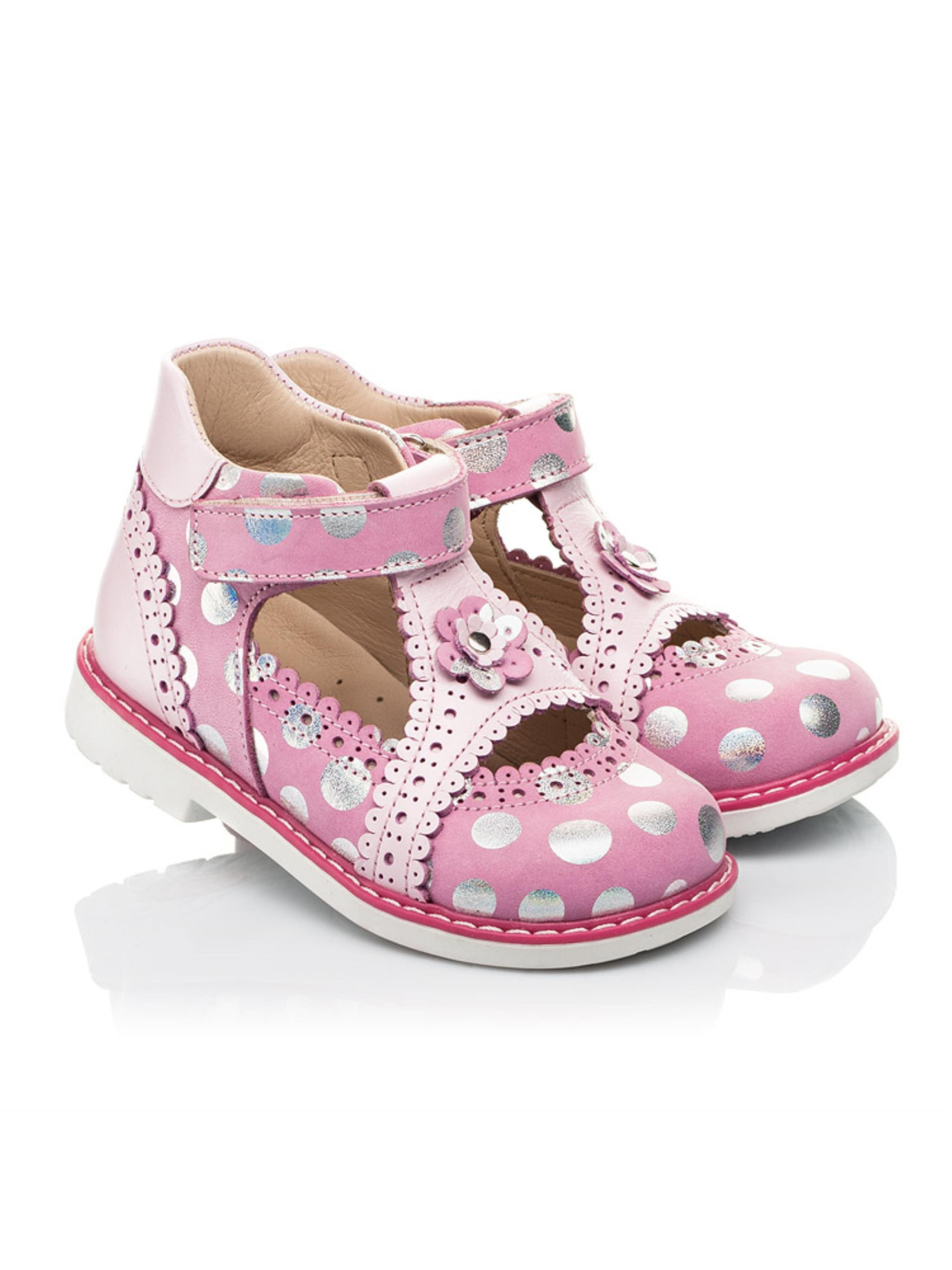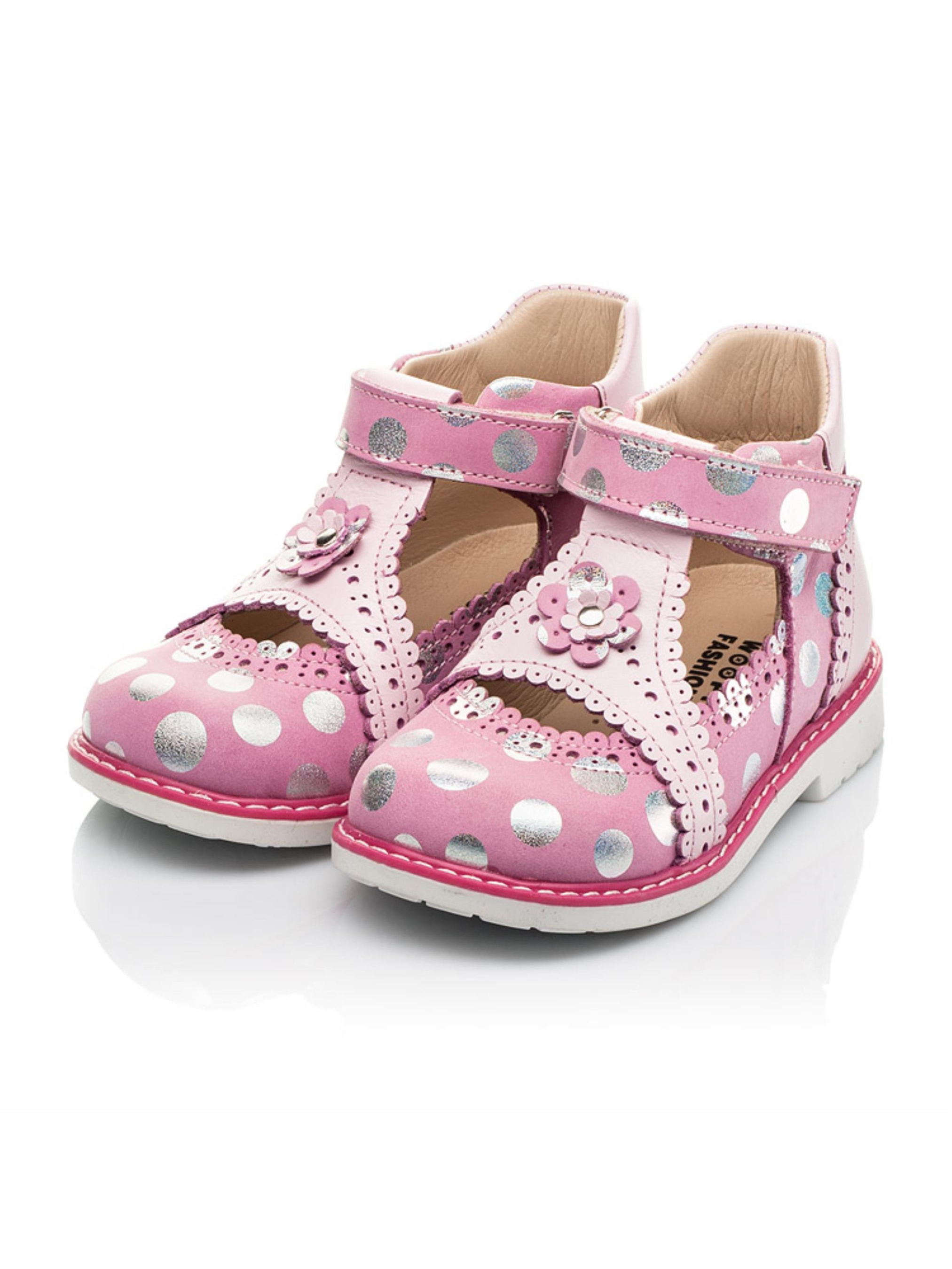 Невероятно нежные и кокетливые закрытые детские босоножки для девочки созданные из натурального нубука розового цвета в серебряный горошек и натуральной кожи светло-розового цвета. Материал подкладки и стельки - натуральная кожа. В этой модели босоножек искусно сочетаются исключительно натуральные материалы и оригинальный дизайн. Безусловно украшением модели выступают фигурные вставки и изысканная отделка края с применением перфорации. Кроме дизайна босоножки поразят маленькую модницу и комфортом, ведь созданные с учетом всех ортопедических элементов детской обуви: каблук Томаса, жесткий задник, супинатор и анатомическая стелька. Скорость обувания обеспечит липучка-застежка. Милым дополнением дизайна выступает оригинальный цветочек, который украшает центральную часть обуви.