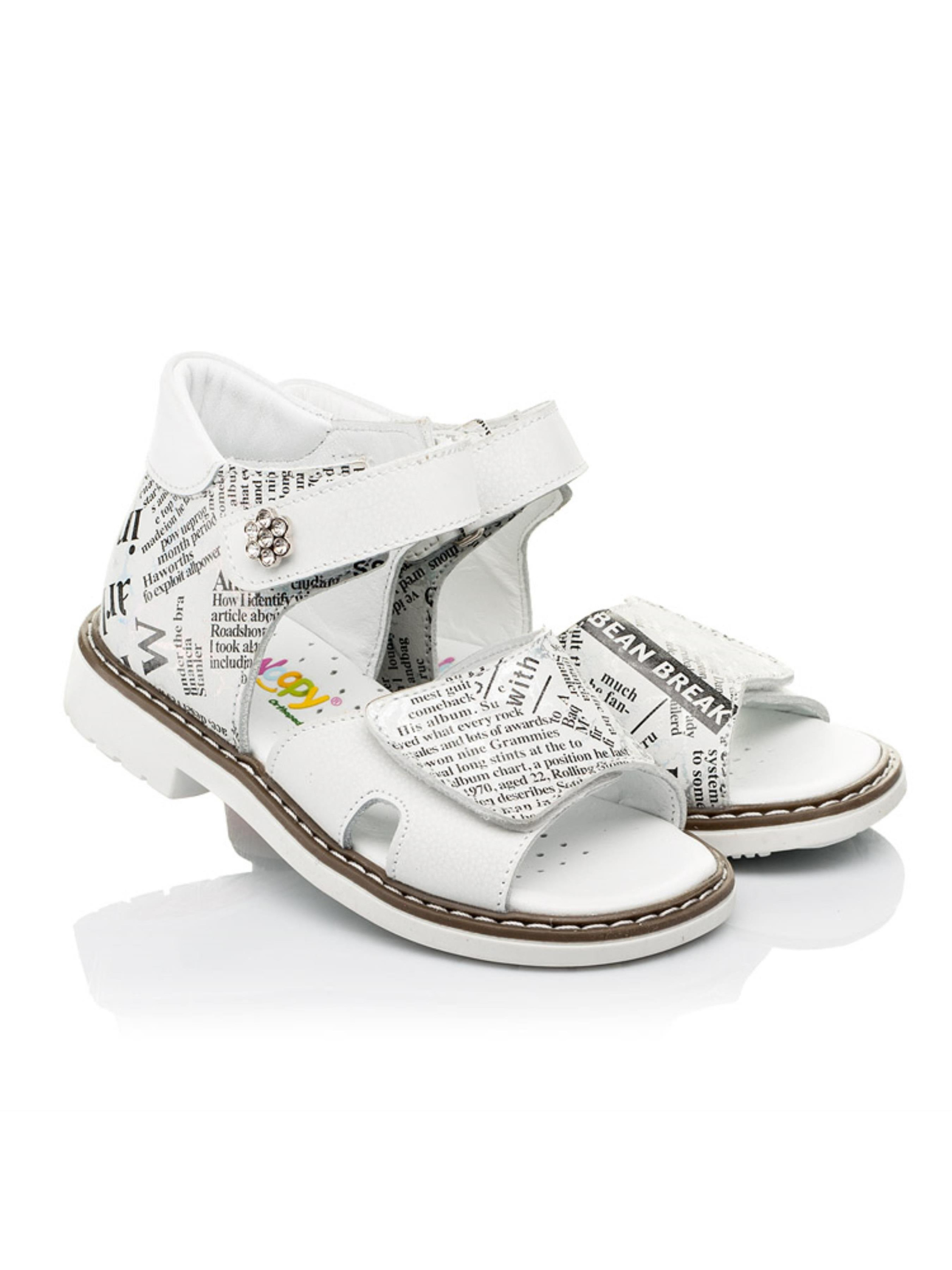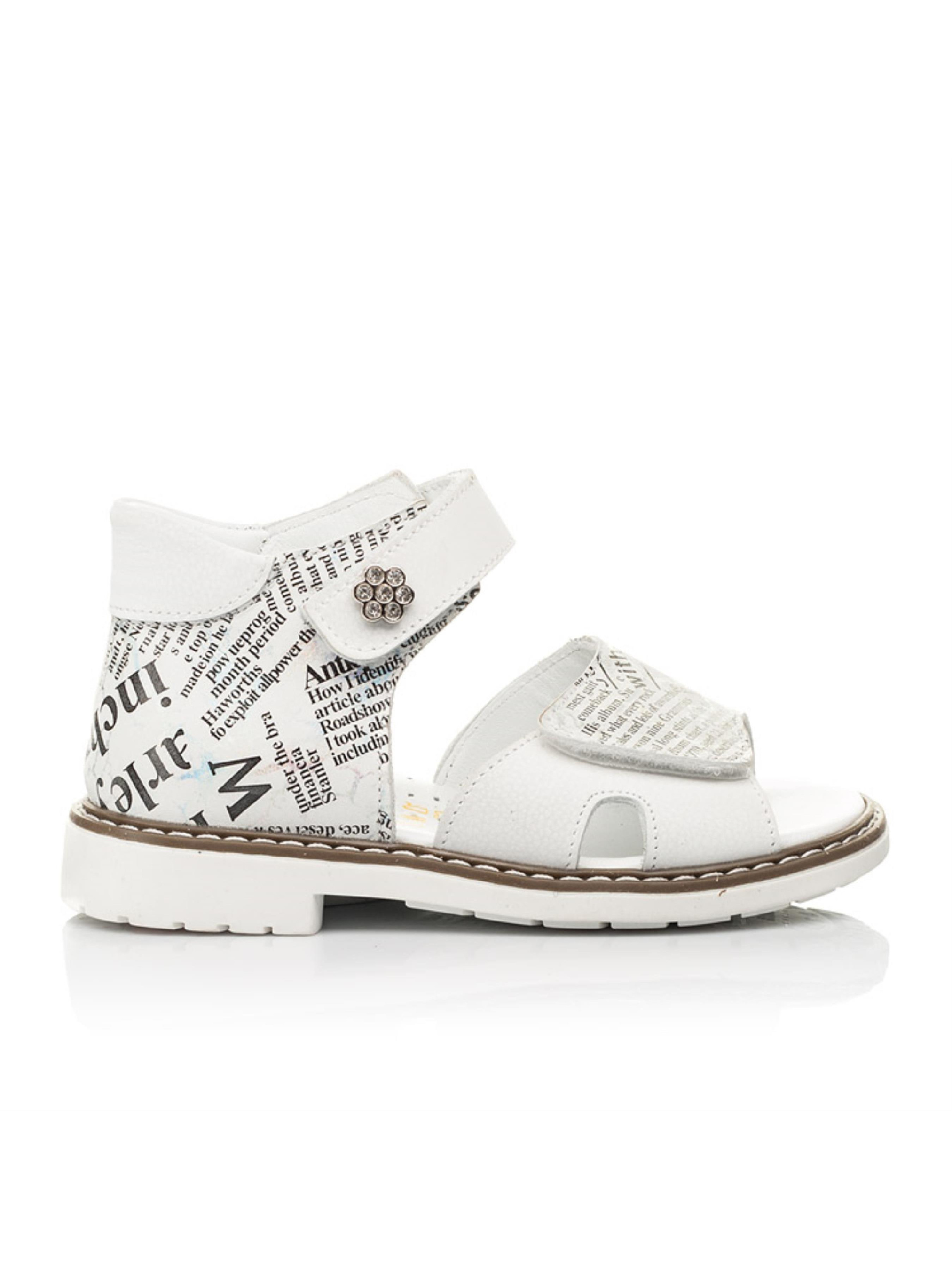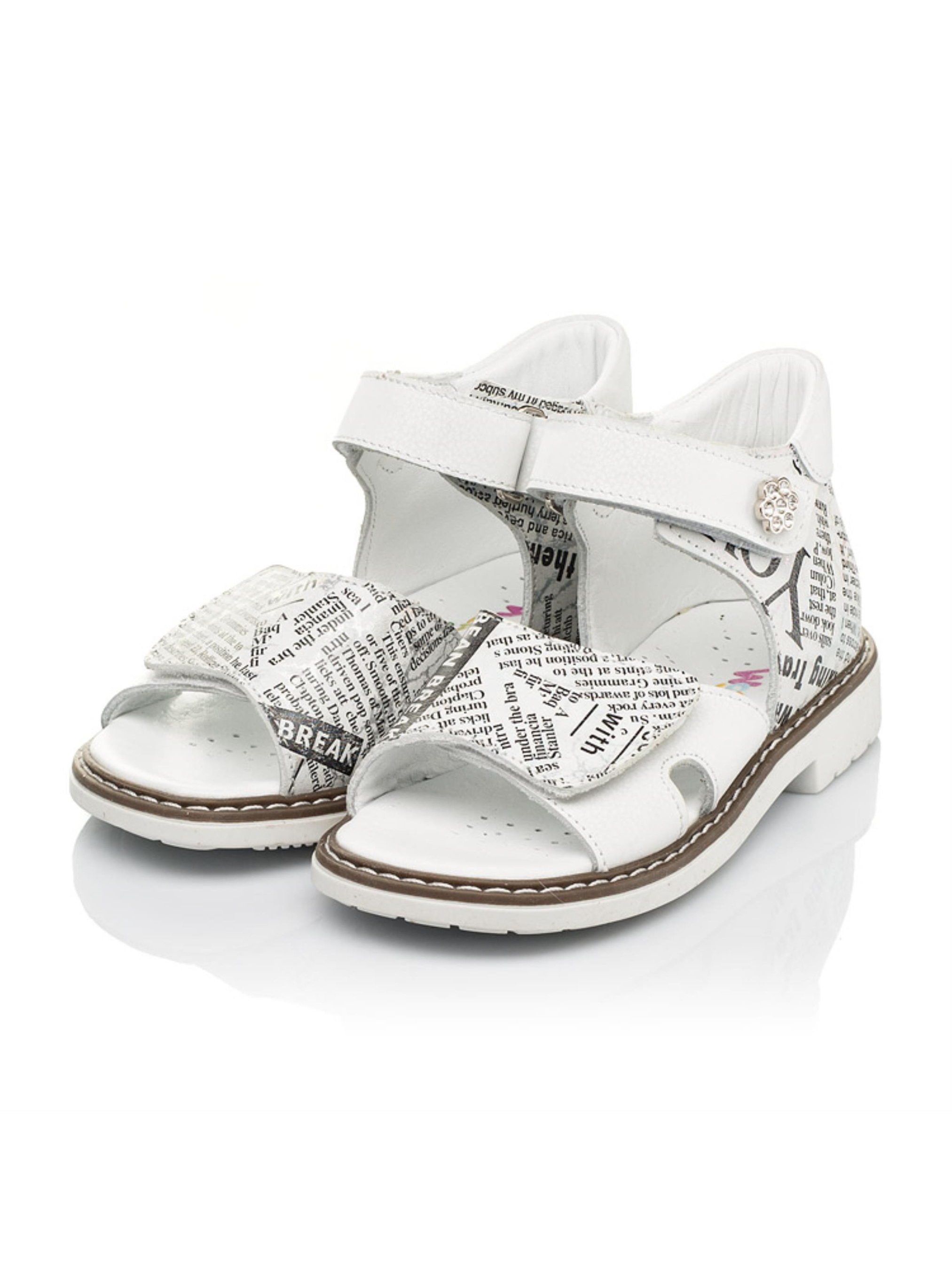 Сдержанные детские босоножки для девочки созданные из исключительно натуральных материалов с учетом ортопедических элементов детской обуви. Материал верха - натуральный нубук с оригинальным современным принтом, материал подкладки и стельки - натуральная кожа. Применение напыления позволило создать современный "газетный" принт с большими и маленькими буквами. Широкая липучка-застежка позволит отрегулировать полноту ножки, а верхняя липучка-застежка ускорит процесс обувания. Каблук Томаса, жесткий задник, супинатор и анатомически правильная стелька - это важные ортопедические детали детской обуви, которые позволяют контролировать правильное положение стопы.