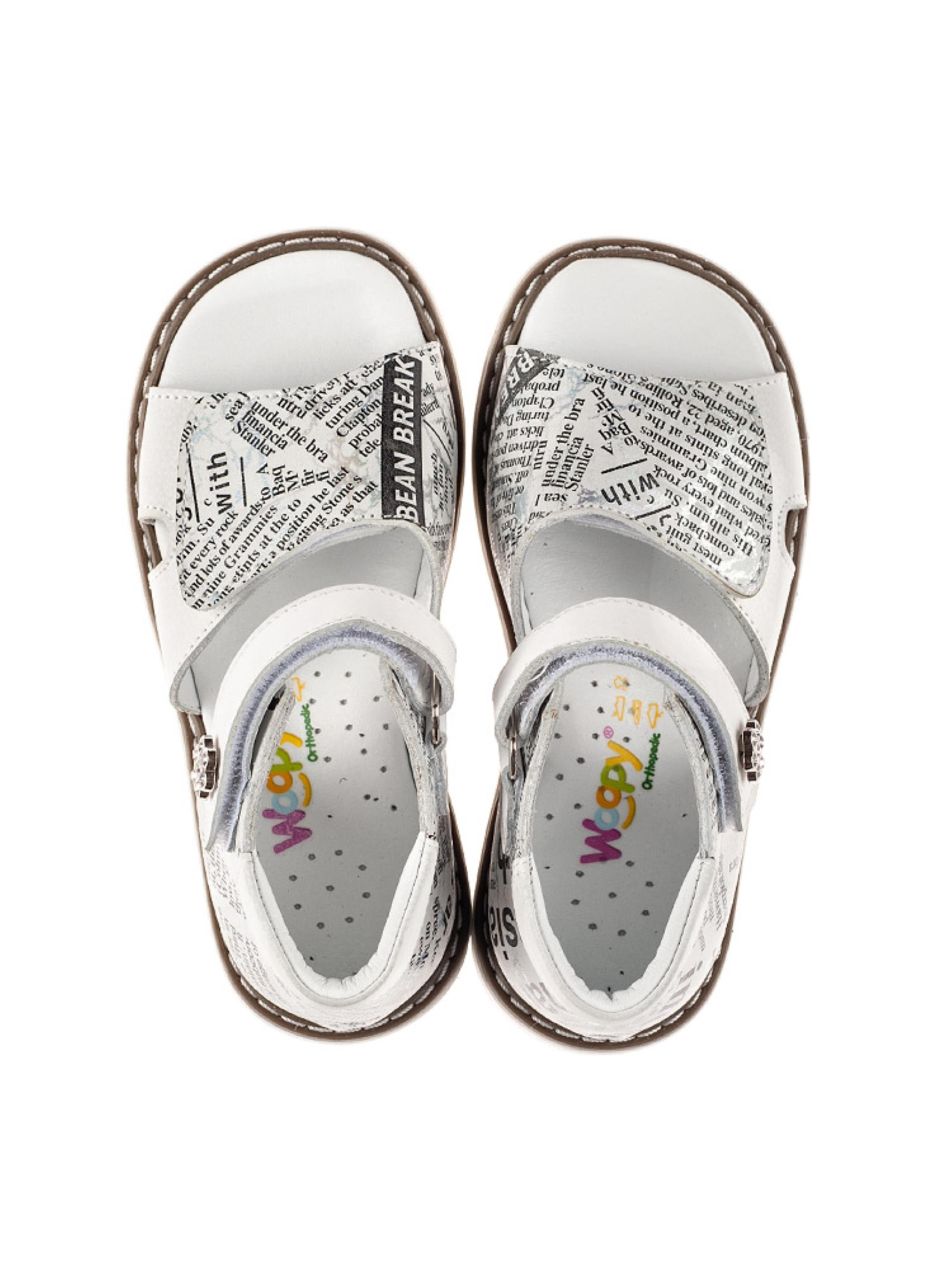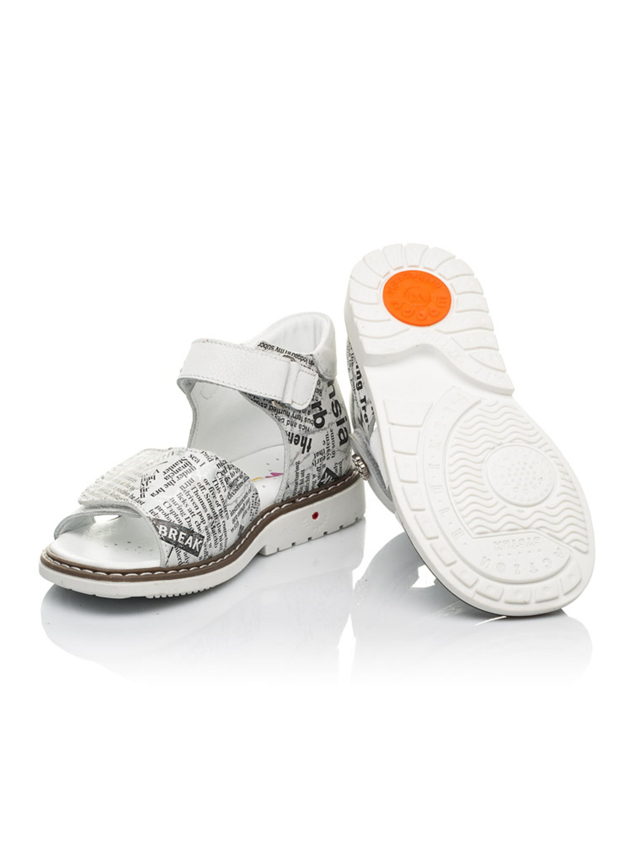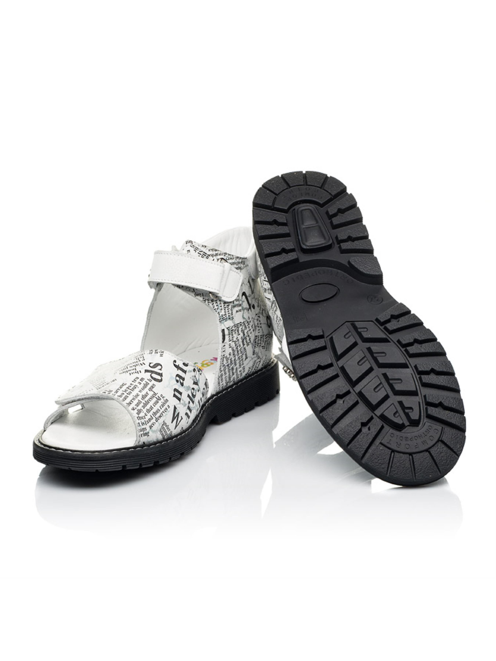 Сдержанные детские босоножки для девочки созданные из исключительно натуральных материалов с учетом ортопедических элементов детской обуви. Материал верха - натуральный нубук с оригинальным современным принтом, материал подкладки и стельки - натуральная кожа. Применение напыления позволило создать современный "газетный" принт с большими и маленькими буквами. Широкая липучка-застежка позволит отрегулировать полноту ножки, а верхняя липучка-застежка ускорит процесс обувания. Каблук Томаса, жесткий задник, супинатор и анатомически правильная стелька - это важные ортопедические детали детской обуви, которые позволяют контролировать правильное положение стопы.