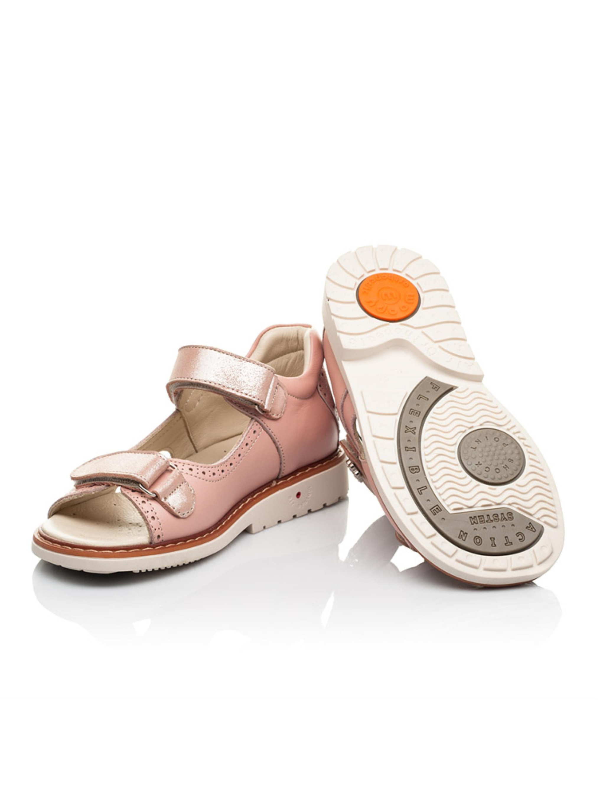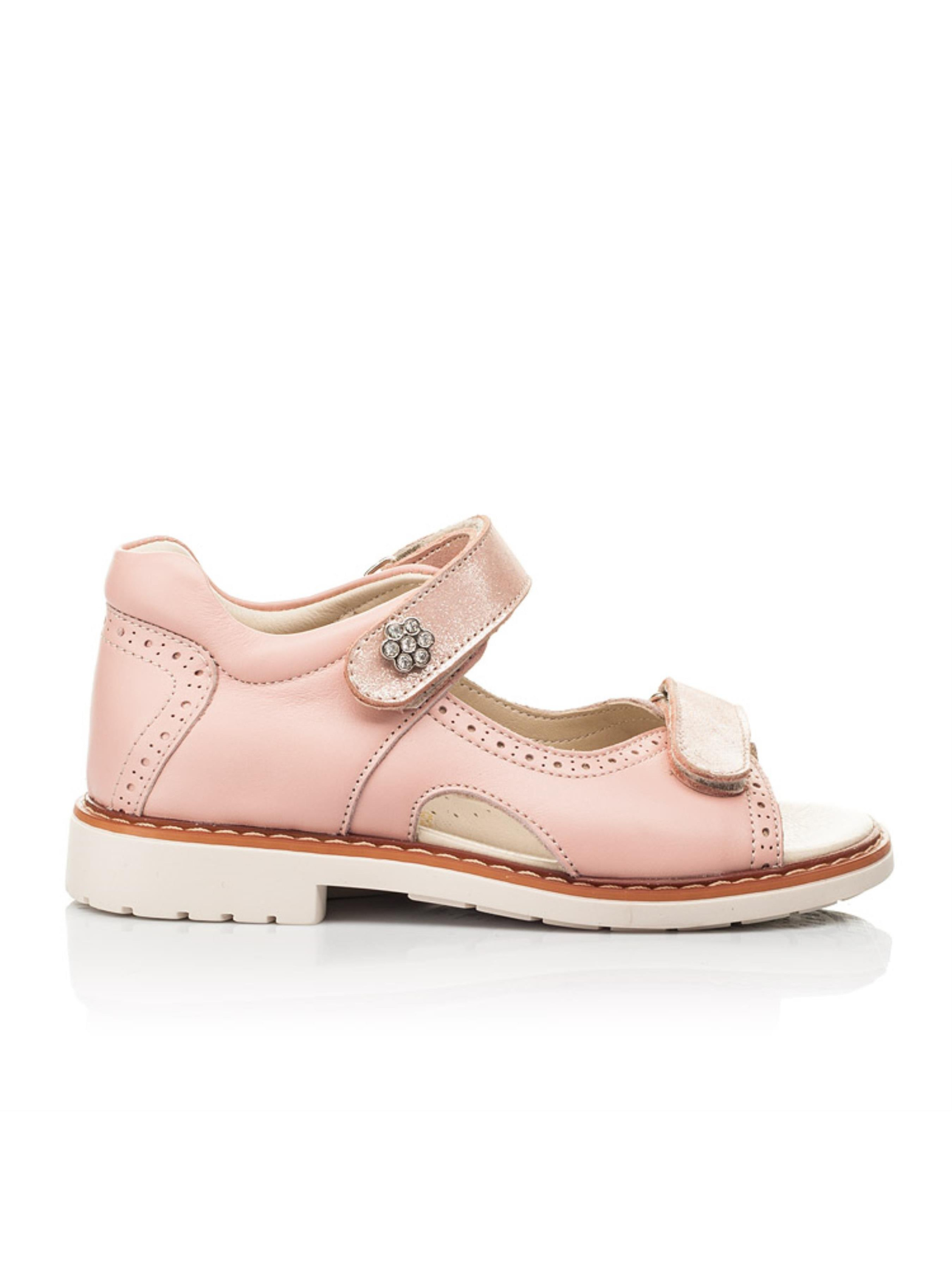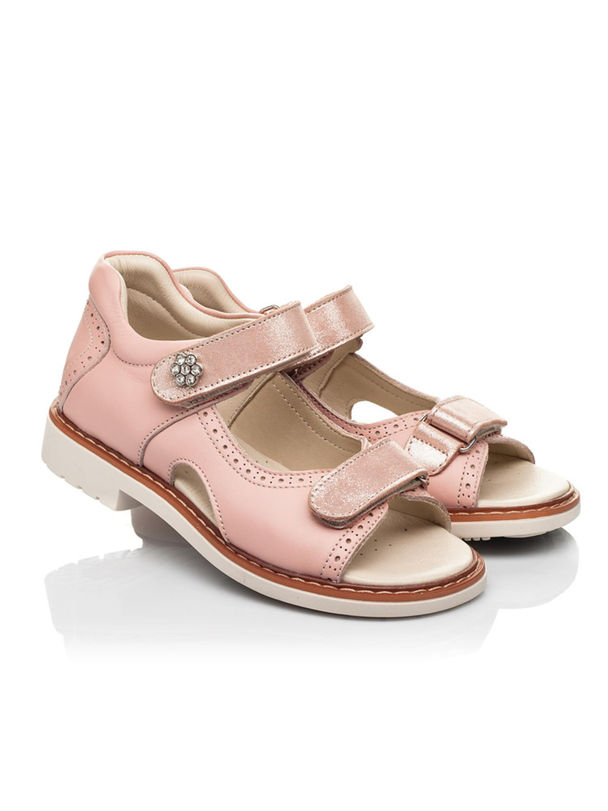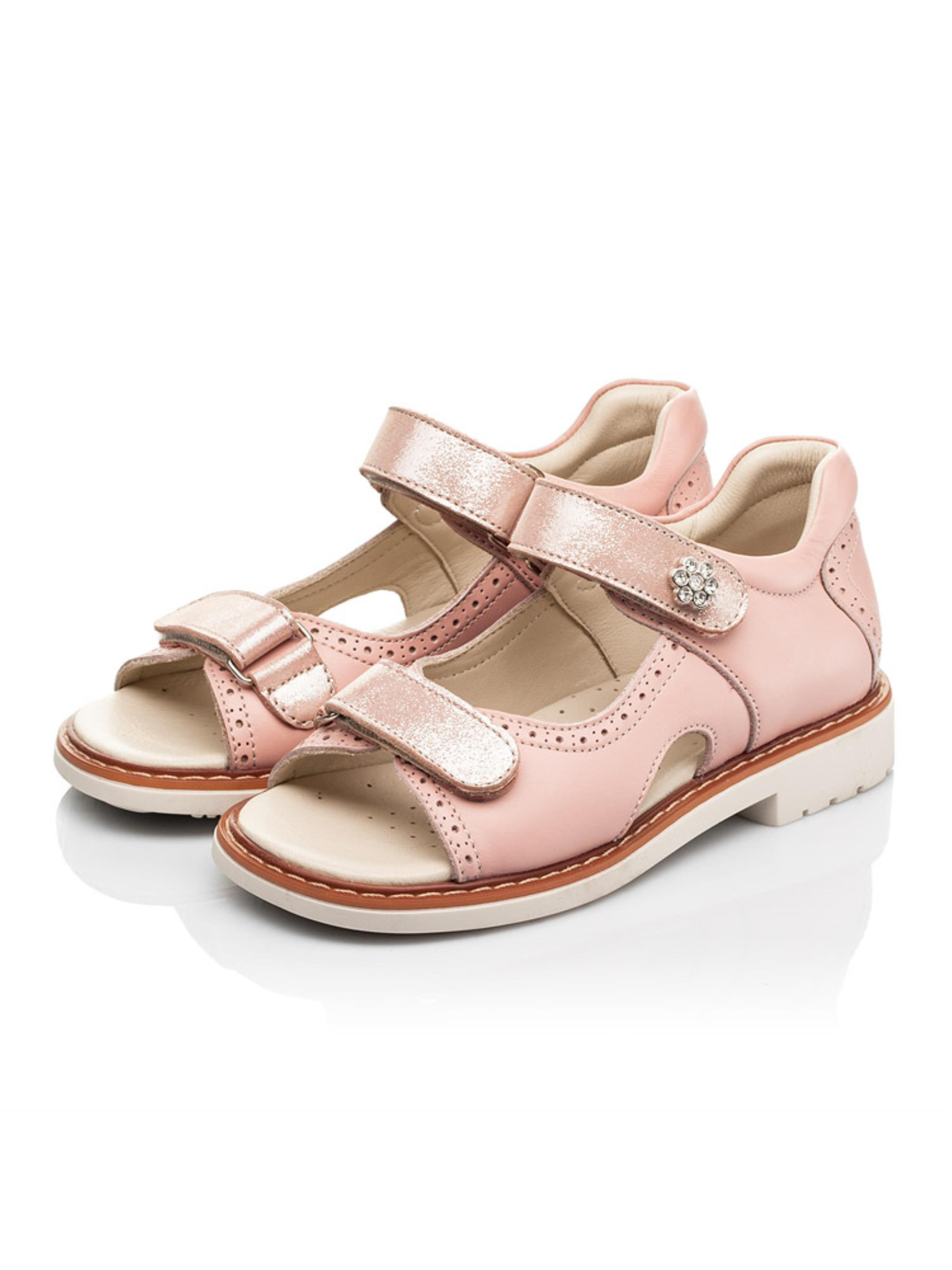 Такая модель детских босоножек имеет ряд неоспоримых преимуществ: исключительно натуральные материалы и важные ортопедические элементы детской обуви. Детские босоножки для девочки пошиты из натуральной кожи впечатляющего пудрового цвета. Материал подкладки и стельки - натуральная высококачественная кожа. Комфорт детским стопам обеспечит каблук Томаса, жесткий задник, супинатор и анатомическая стелька. Все эти элементы очень важны для правильного формирования и положения ножки в обуви. В качестве застежки в этой модели босоножек предусмотрены две надежные застежки-липучки, которые ускорят процесс обувания. Детские босоножки для девочки декорированные перфорированным узором и четкими декоративными швами. Верхняя застежка-липучка украшенная цветочком из камней. Качественные и стильные босоножки подарят яркие впечатления от увлекательных летних прогулок. Такую пару Вы можете смело выбрать и для создания праздничного образа.