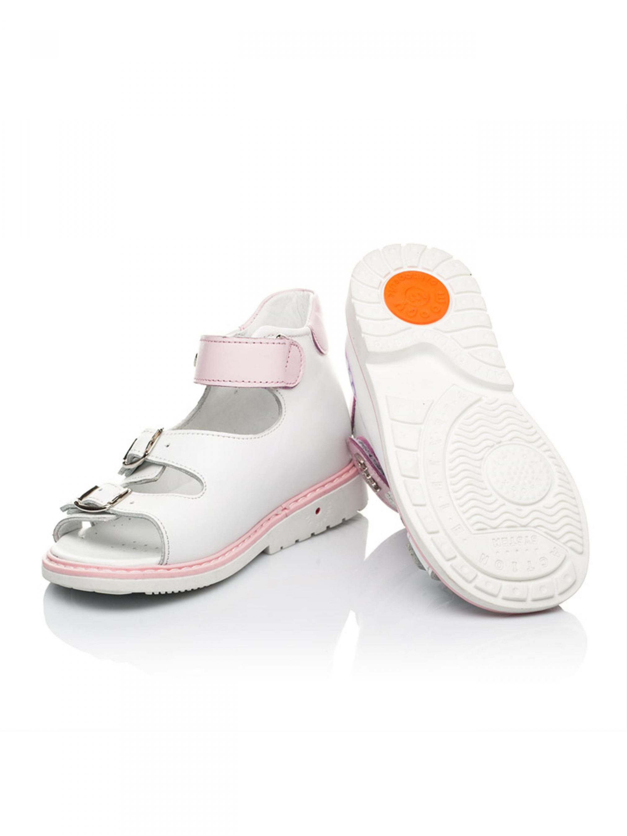 Эксклюзивные детские босоножки для девочки внесут нотку нежности в образ маленькой крохи и подарят ощущение длительного комфорта от прогулки. Детские босоножки для девочки пошиты из натуральной кожи белого цвета. Дизайн дополнено изображением маленького слоника. Ну разве не милая пара на лето? Как можно будет отказаться от таких нежных, а главное ортопедически правильных босоножек? Босоножки для девочки созданные с учетом всех составляющих детской обуви: каблук Томаса, жесткий задник, супинатор и анатомическая стелька. Все эти элементы обеспечат физиологически правильное положение ножки в обуви. Надежную фиксацию стопы обеспечат две металлические застежки, а для ускорения обувания в такой модели предусмотрена застежка-липучка. Для контраста цвета застежку-липучку пошито из натуральной кожи нежного розового цвета.