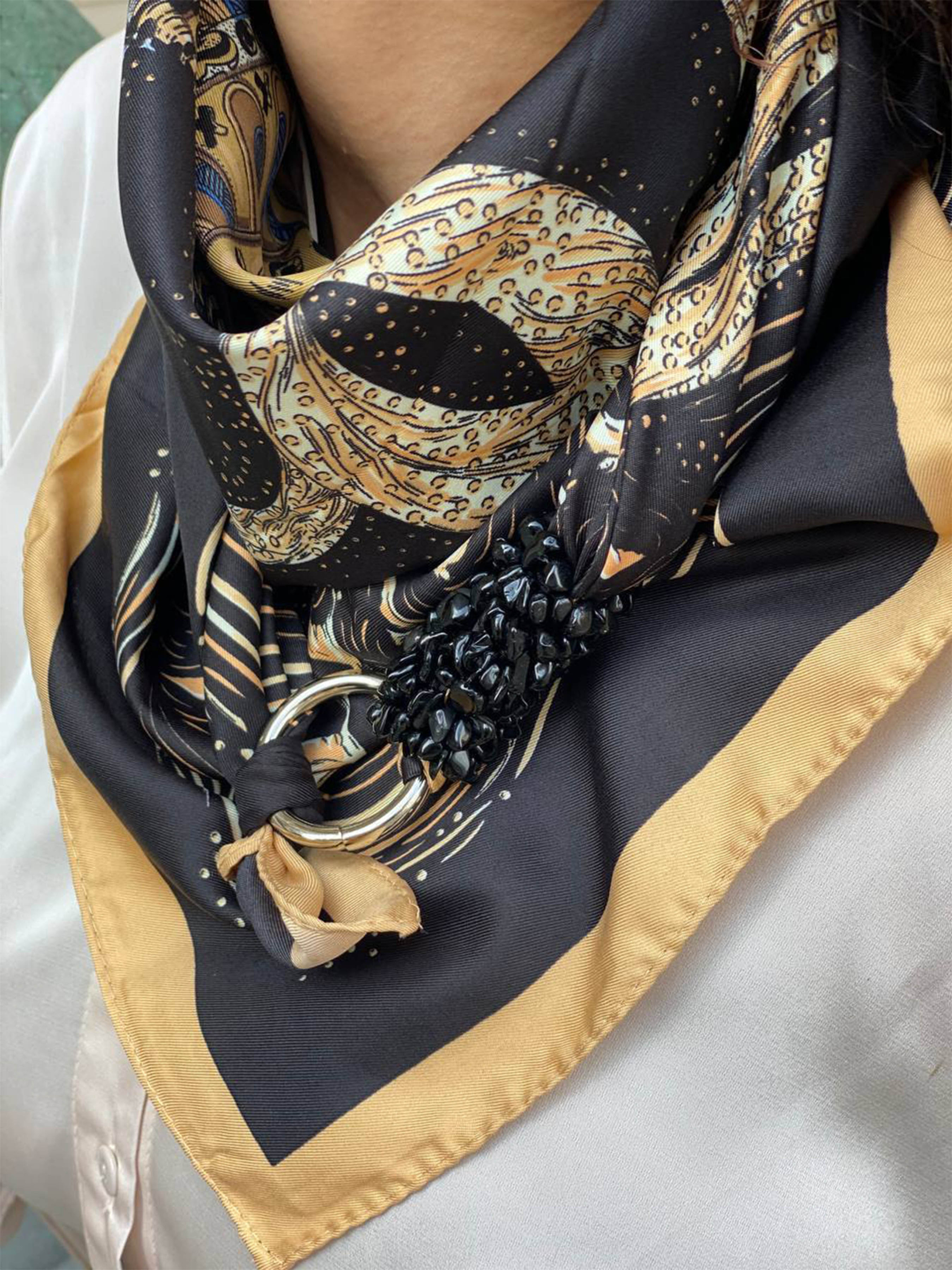 Дизайнерский платок с роскошным принтом. Украшен агатом и большой металлической фурнитурой цвета серебро. Подарочная коробочка. Размер 90х90 см. Состав: 70% вискоза, 30% шелк.