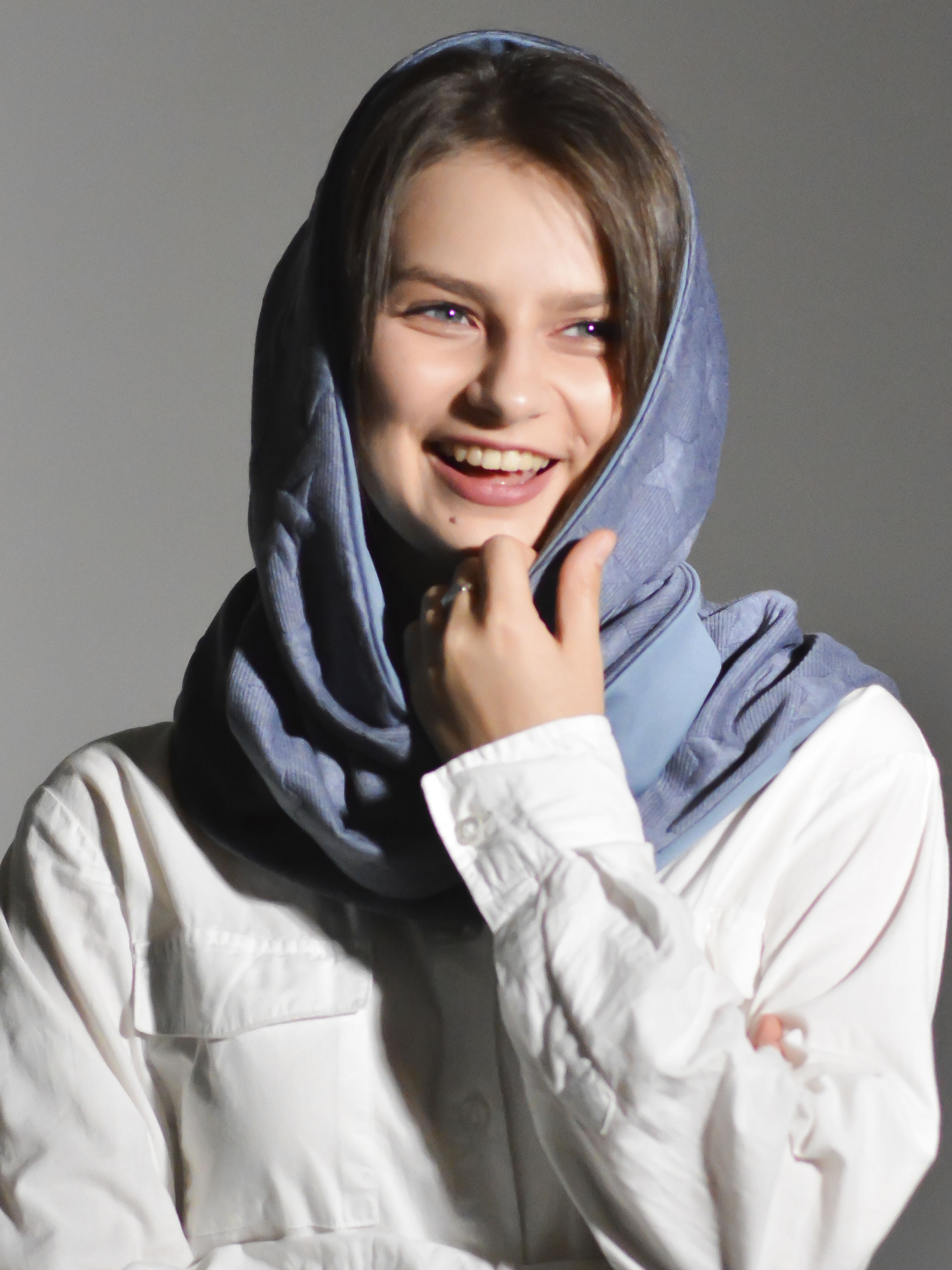 Дизайнерский шарф украшен металическим декором и узором на одной стороне в виде звезд, вторая сторона гладкая. Шарф двусторонний. Размер 100х100х150см. Одна сторона: 75% вискоза, 25% полиэстер Другая сторона 100% вискоза Унисекс Универсальный аксессуар. Можно носить как накидку на голову + шарф. Прекрасная идея для подарка.