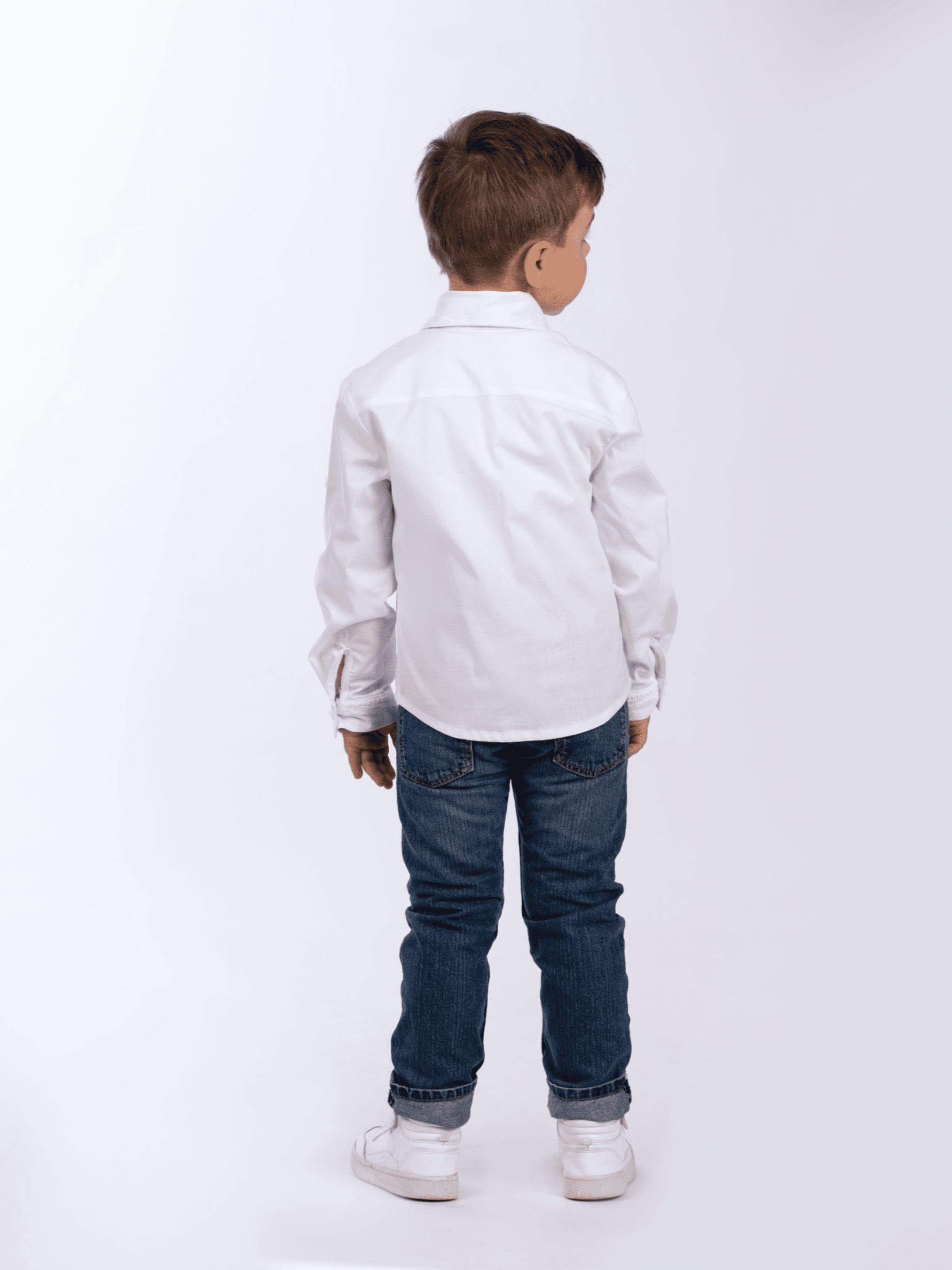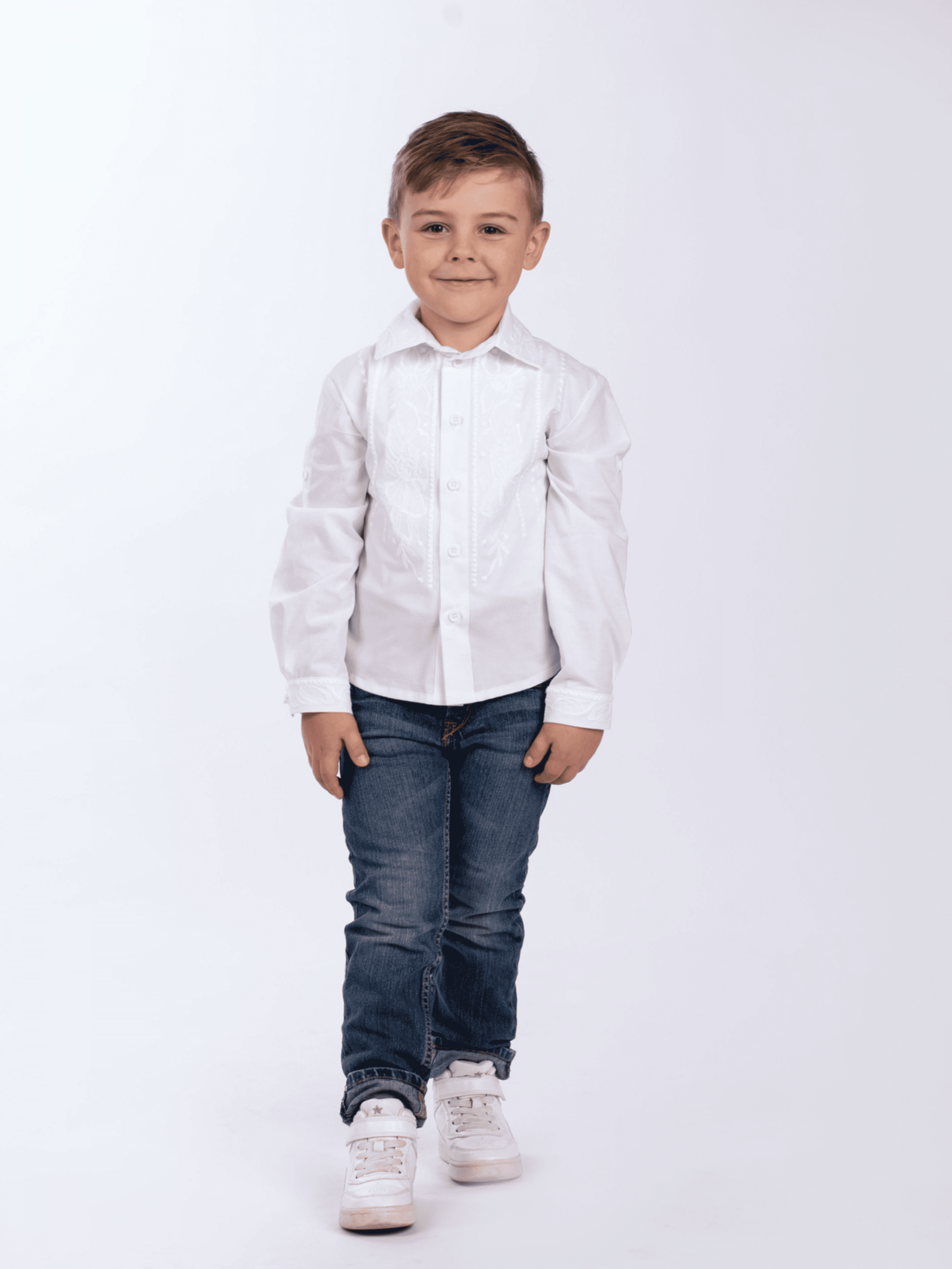 Вишита сорочка білим по білому - must have в дитячому гардеробі. Вона буде завжди актуальною, адже з нею можна створити безліч яскравих образів у casual та в класичному стилі. Сорочка створена з натуральної тканини, вона огорне тіло дитини ніжністю та турботою, а виражений рослинний орнамент слугуватиме надійним оберегом для вашого янголятка. Вишиванка прямого крою, по всій довжині виробу застібка з ґудзиків та вишитий узор по обидві сторони. Манжети та комір також містять орнамент вишитий гладдю. Особливістю сорочки є рукави, які підгортаються та застібаються на ґудзик, це робить їх практичними. Завітавши до нас, ваша дитина порине в глибокий світ народних звичаїв та безповоротно закохається в широкий простір традиційної української вишивки з унікальним дизайнерським почерком.