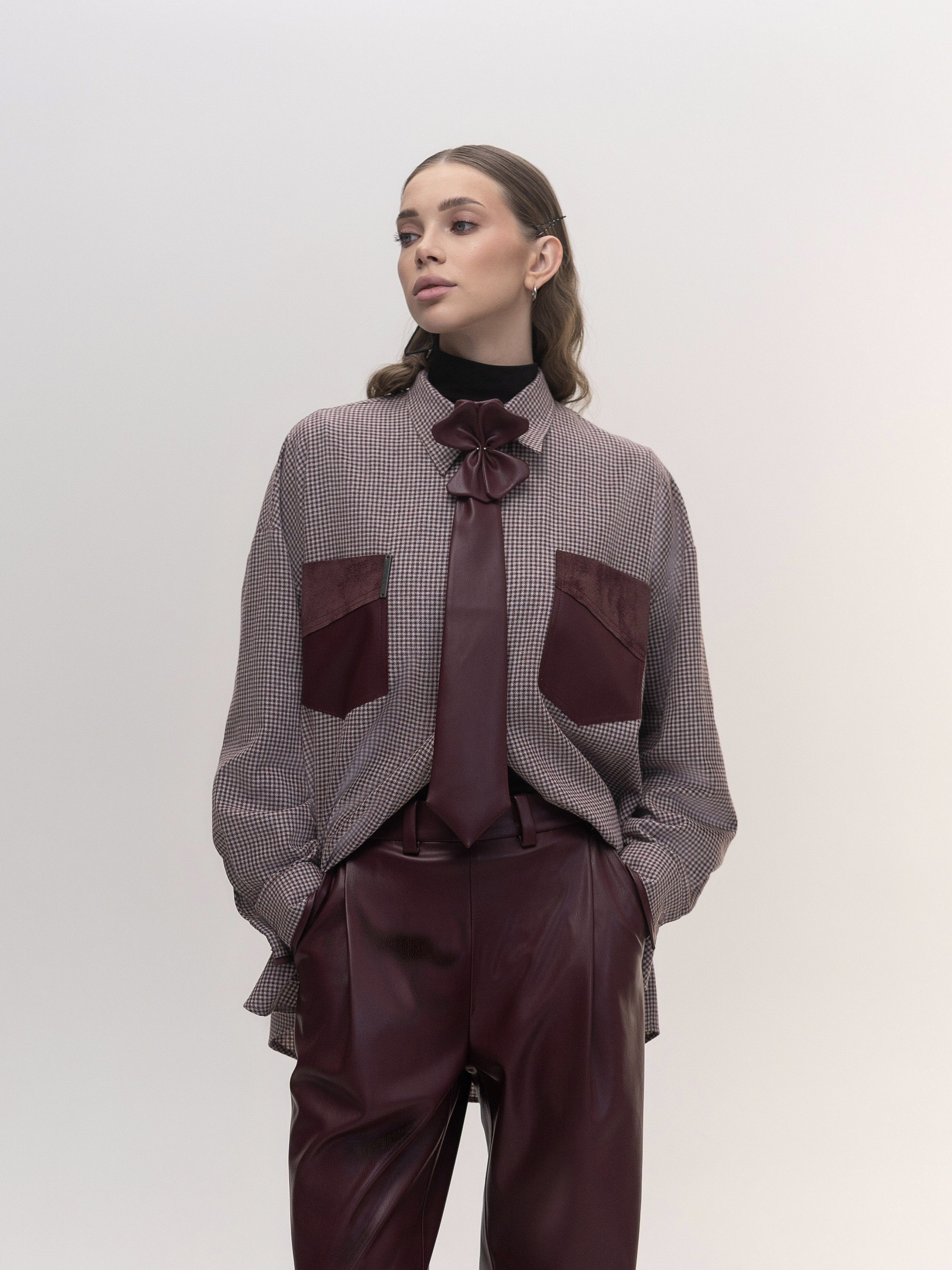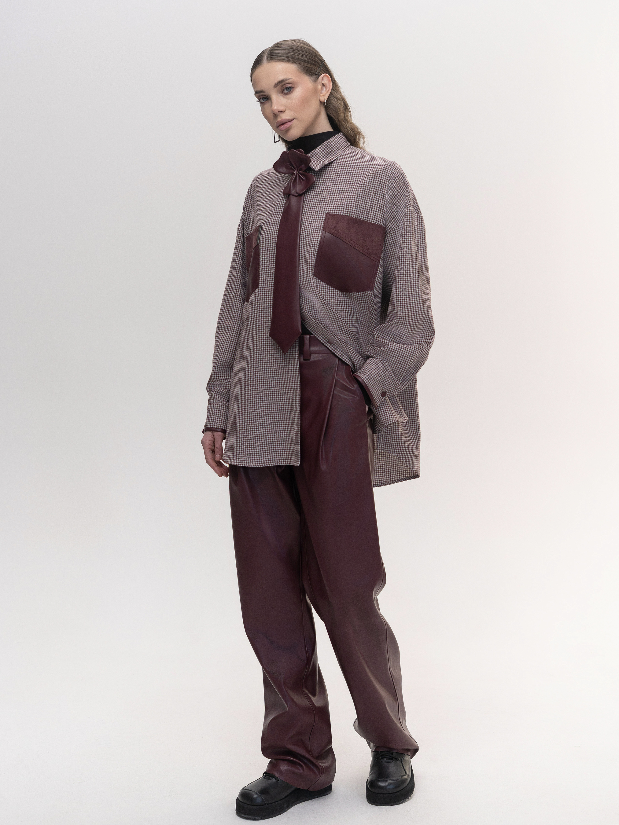 Стильная клетчатая рубашка оверсайз, выполненная в унисекс-крое, обеспечивающая комфортную посадку и современный вид. Рубашка имеет двойную кокетку, что улучшает посадку и добавляет структурности. Функциональные накладные карманы из экокожи создают контрастный акцент, а манжеты с кожаной окантовкой придают изысканные детали. Эта модель отлично сочетается с джинсами, брюками или юбками, позволяя создавать как casual, так и стильные streetwear-образы. Параметры изделия: Длина по спинке 88 см. Длина рукава с манжетом: 62 см. Крой: оверсайз, унисекс Материал: фланель + экокожа Подробности: двойная кокетка, боковые разрезы, экокожные карманы, окантовка манжетов Сезон: Осень / Весна / Лето Состав: 80% хлопок, 20% полиэстер Уход за изделием: Стирка: • Машинная стирка в деликатном режиме (до 30°C). • Используйте жидкий гель для сохранения цвета. • Не отбеливать. Сушка: • Не используйте машинную сушку. • Сушить в расправленном виде. Глажка: • Гладить при средней температуре, избегая прямого контакта с экокожией.