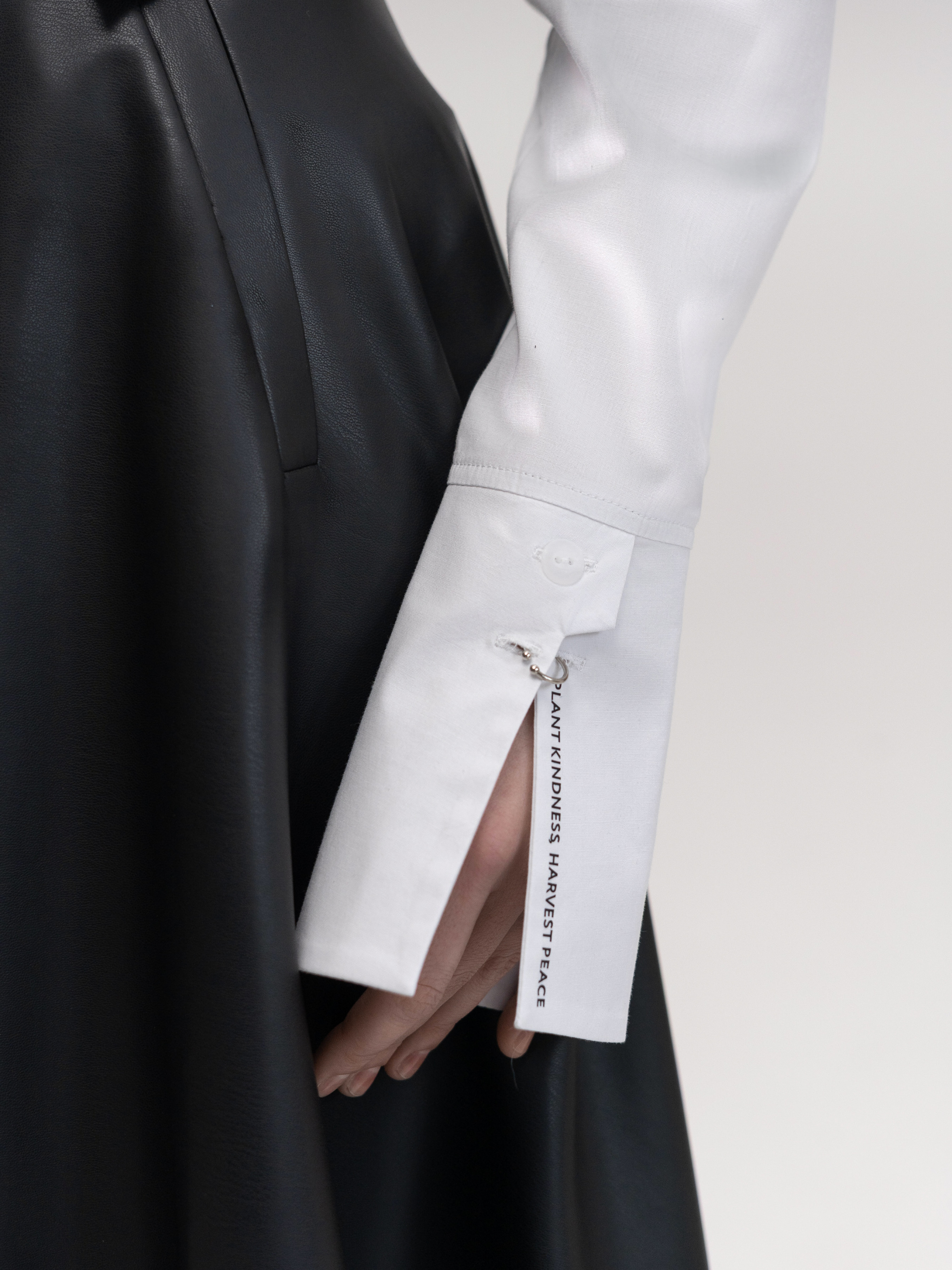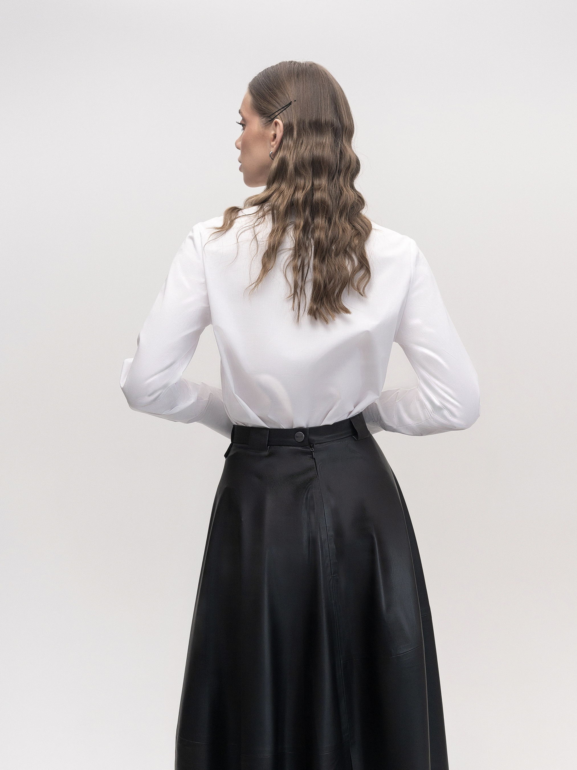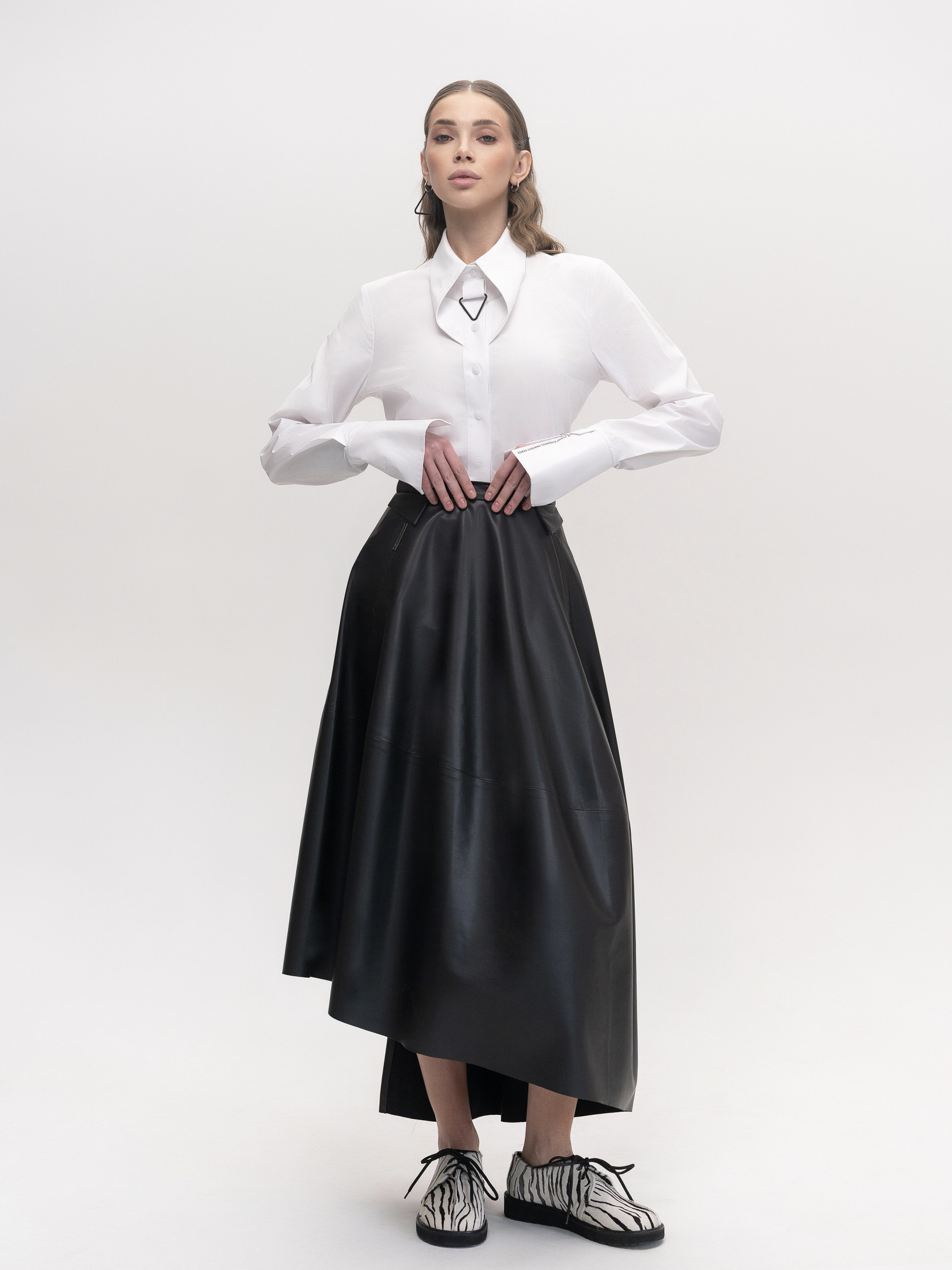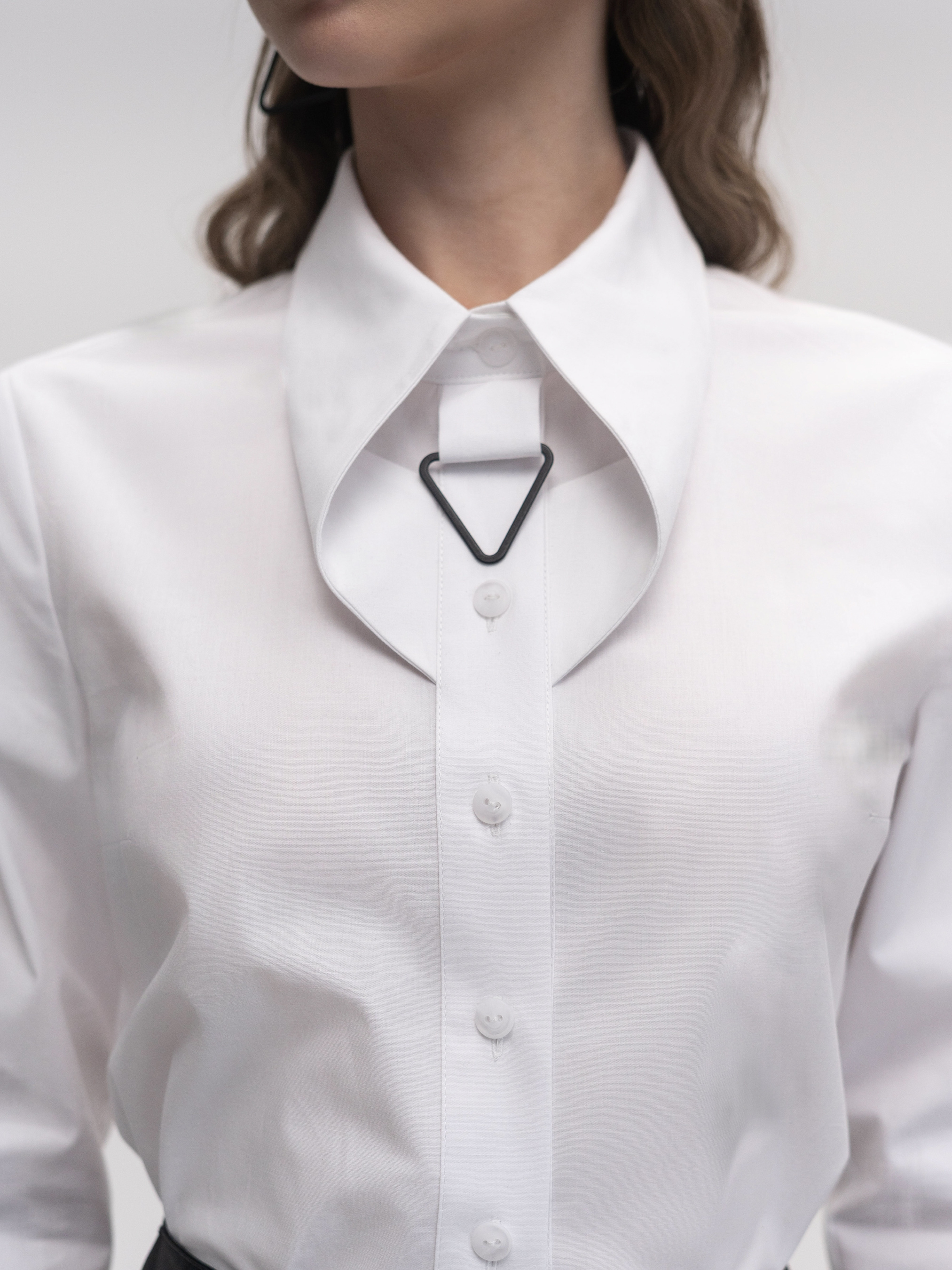 Приталенная рубашка изготовлена из рубашечной ткани с эластаном белого цвета. Основной особенностью модели является декоративный воротник, придающий рубашке стильный вид. Рубашка имеет акцентные манжеты с принтом, оформленные пирсингом, что подчеркивает модные тенденции и придает образу оригинальности. Эта модель отлично сочетается с брюками, юбками или шортами, позволяя создавать как классические, так и стильные кэжуал-образы. Параметры изделия: Длина по спинке: 66 см Длина рукава без манжета: 59 см Рост модели: 175 см Сезон: Весна/Лето/Осень Состав: 97% Хлопок, 3% Эластан Уход за изделием: Машинная стирка: 40°C Отжим: 600-800 об/мин • Не используйте режим сушки в стиральной машинке. Глажка: высокая температура. Рекомендуется использовать подкрахмалитель для сохранения формы изделия.