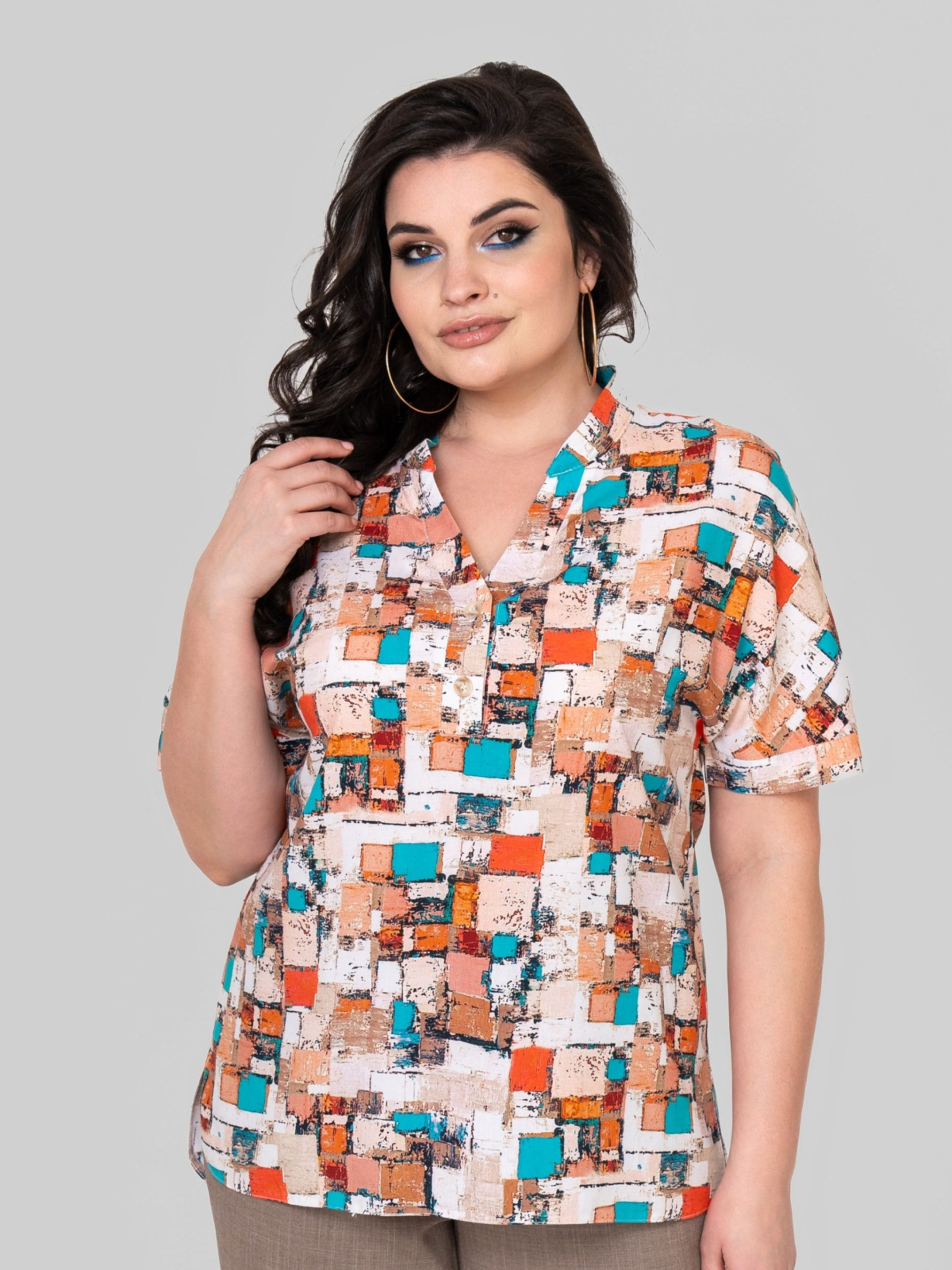 Блуза прямого силуету без підкладки. Виконана зі штапелю. Тканина легка і тактильно приємна, а також володіє підвищеною міцністю і практичністю. Рукав суцільнокроєний на манжеті. Комір - прилегла стійка. Застібка на укорочену планку на двох ґудзиках. Спинка подовжена, в бічних швах розрізи. Підійде для повсякденно-ділових літніх образів. Доступні розміри: 50-60. Характеристики: Тип тканини: штапель - легка, гігроскопічна тканина. Склад тканини: віскоза 80%, поліестер 20%. Довжина рукава: р.50,52 - 20см, р.54,56 - 21см, р.58,60 - 22см. Довжина виробу по спинці: р.50,52 - 75см, р.54,56 - 78см, р.58,60 - 80см. Орієнтовні заміри готового виробу: 50 розмір: Обхват грудей - 108 см, обхват талії - 108 см, обхват стегон - 114 см; ширина рукава - 20 см. 52 розмір: Обхват грудей - 112 см, обхват талії - 112 см, обхват стегон - 118 см; ширина рукава - 20 см. 54 розмір: Обхват грудей - 116 см, обхват талії - 116 см, обхват стегон - 122 см; ширина рукава - 21 см. 56 розмір: Обхват грудей - 120 см, обхват талії - 120 см, обхват стегон - 126 см; ширина рукава - 21 см. 58 розмір: Обхват грудей - 124 см, обхват талії - 126 см, обхват стегон - 132 см; ширина рукава - 22 см. 60 розмір: Обхват грудей - 128 см, обхват талії - 130 см, обхват стегон - 136 см; ширина рукава - 22 см.