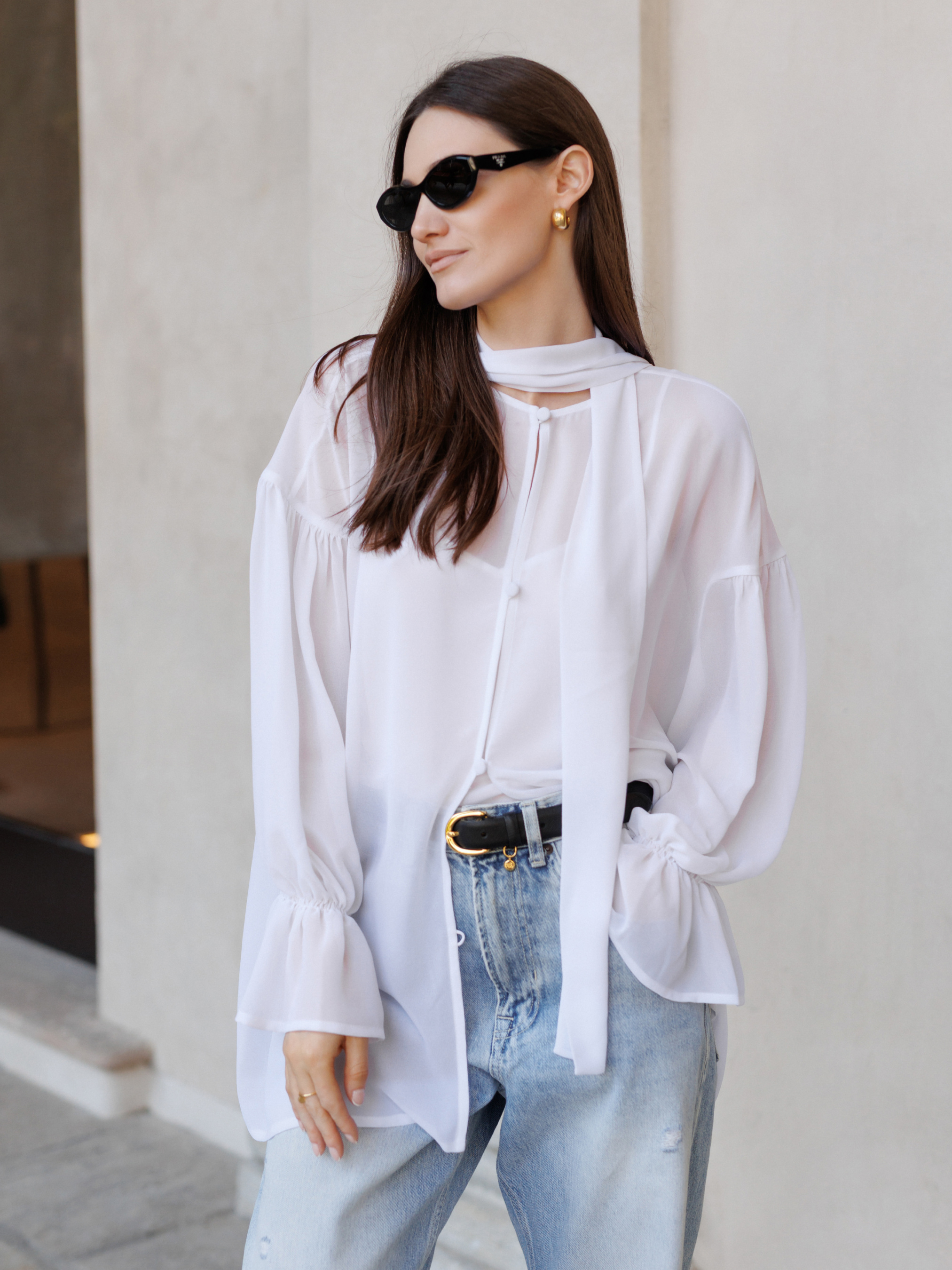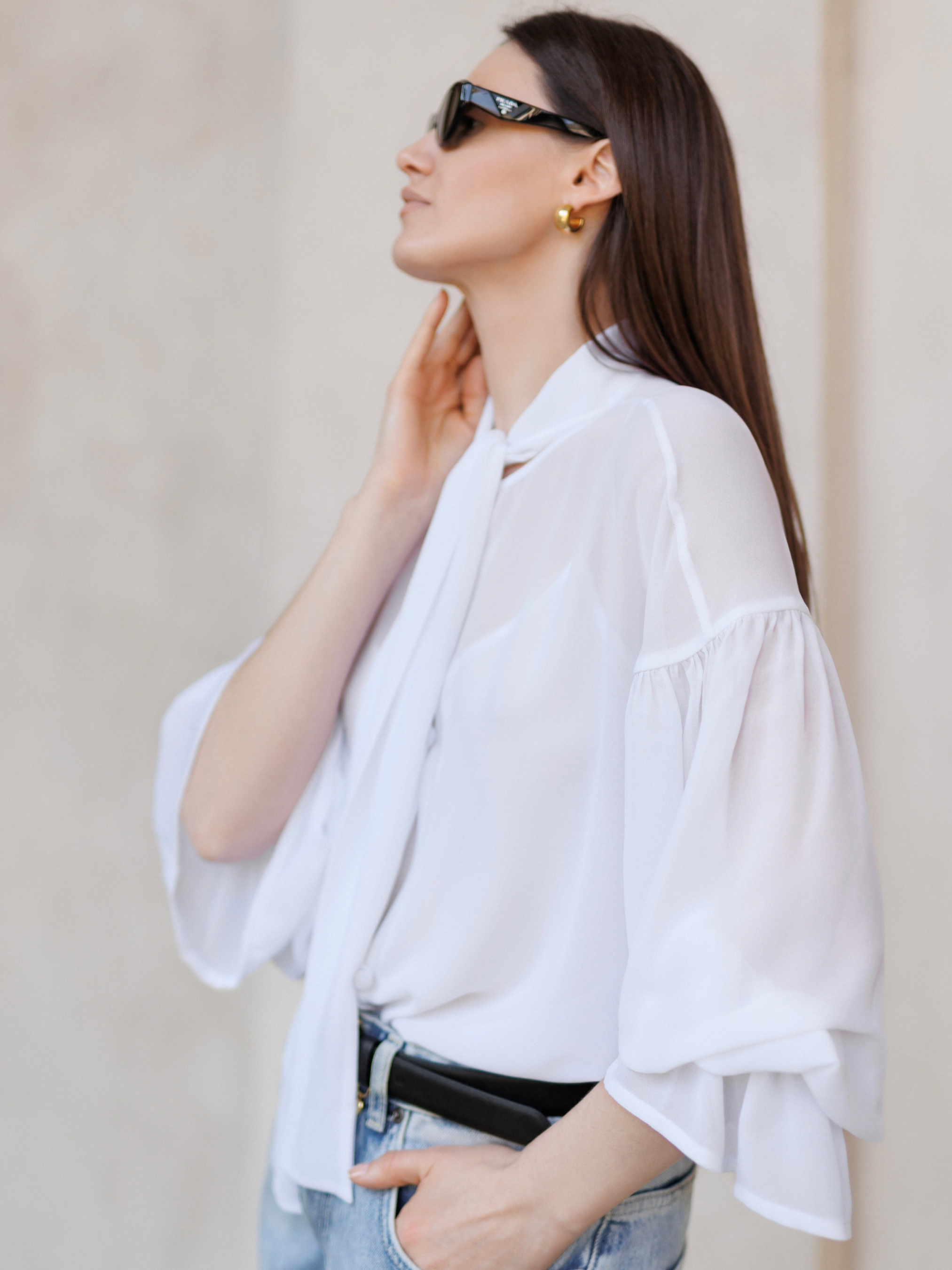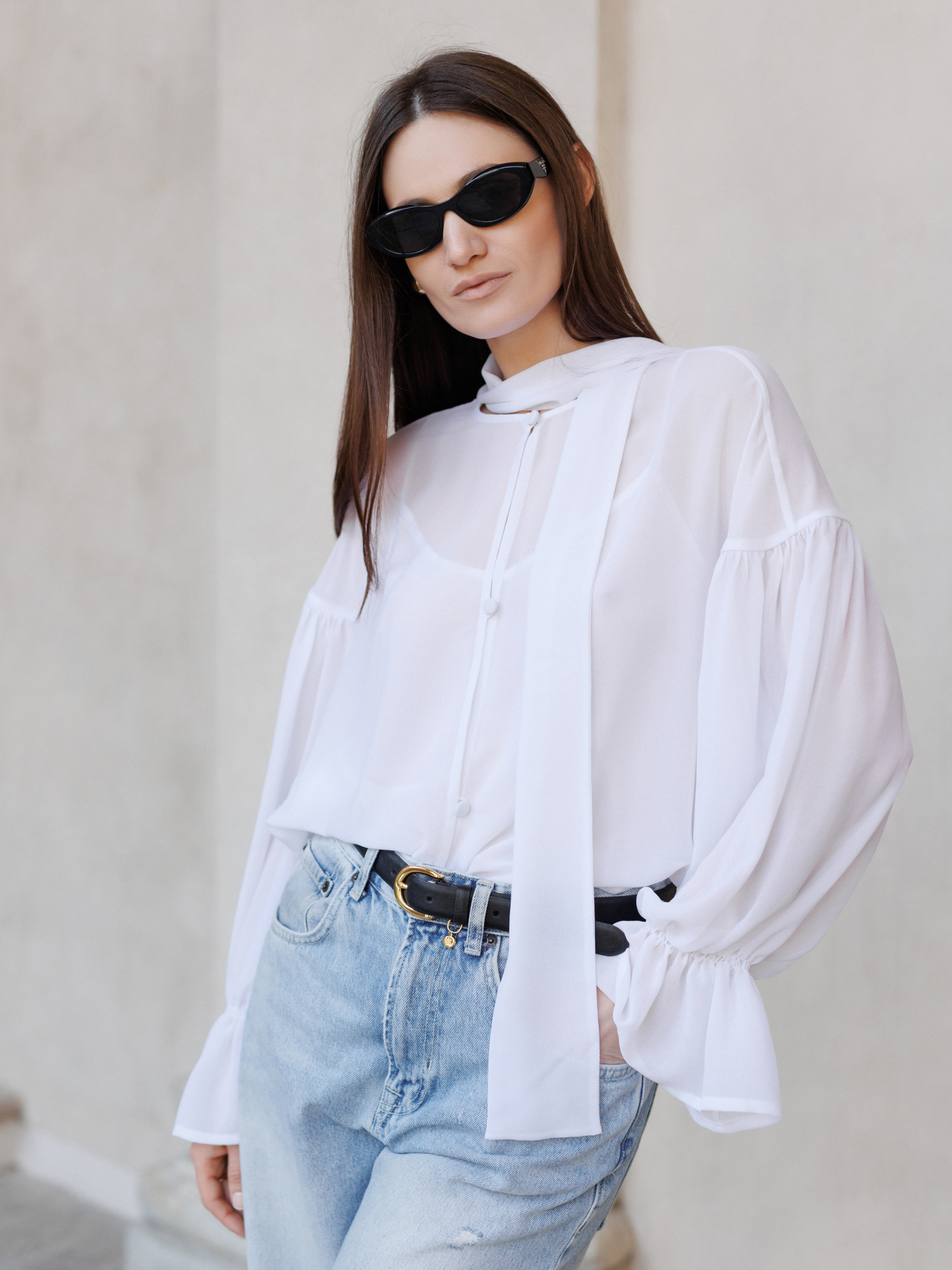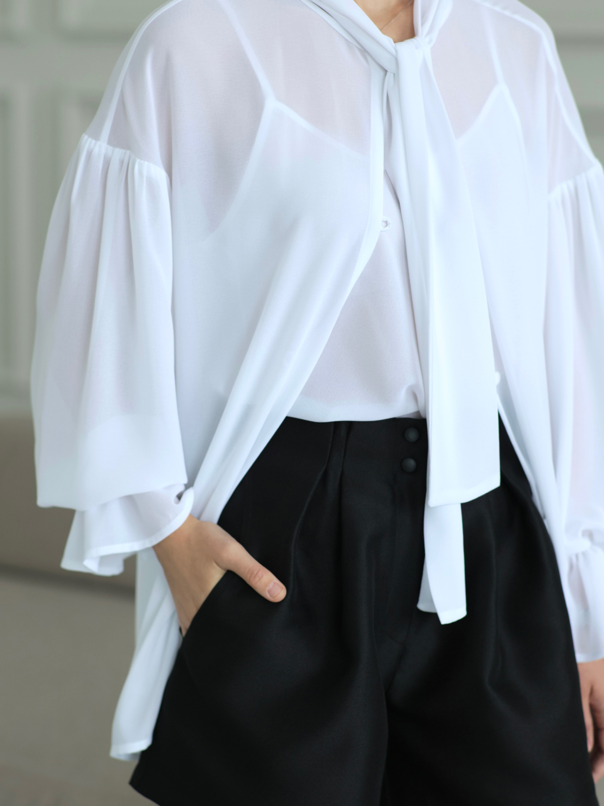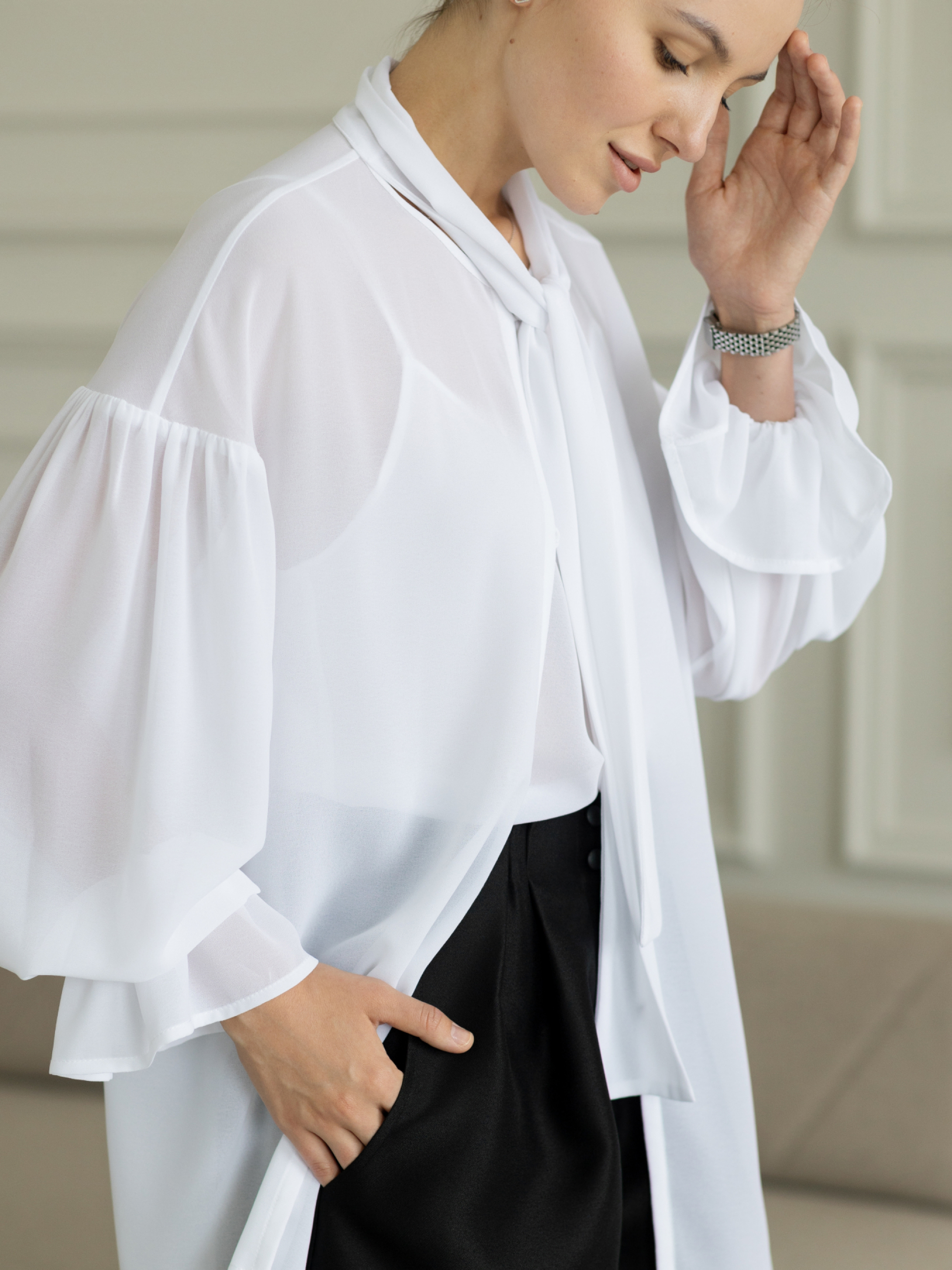 Белая блуза из стрейчевого креп-шифона дарит простор и свободу в каждом движении. Объёмные рукава, тонкая игра прозрачности, нежность, не требующая украшений. В комплекте к ней идёт майка также из шифона, которую можно носить и отдельно. Сочетайте с шортами, юбкой или классическими брюками. При пошиве использована премиальная обработка: все внутренние швы — французские и окантованные. Всё это обеспечивает долговечность изделия и эстетическое удовольствие.