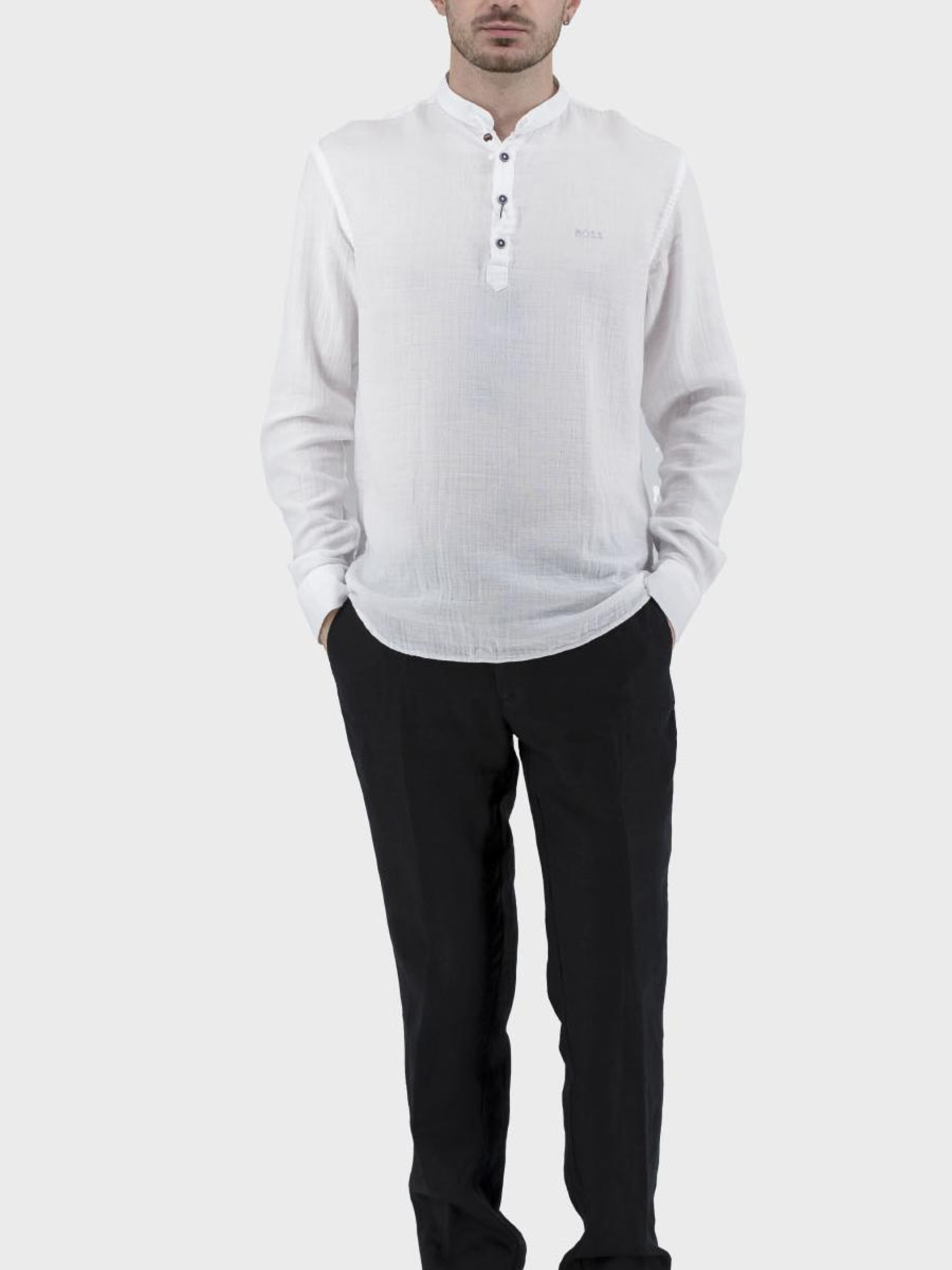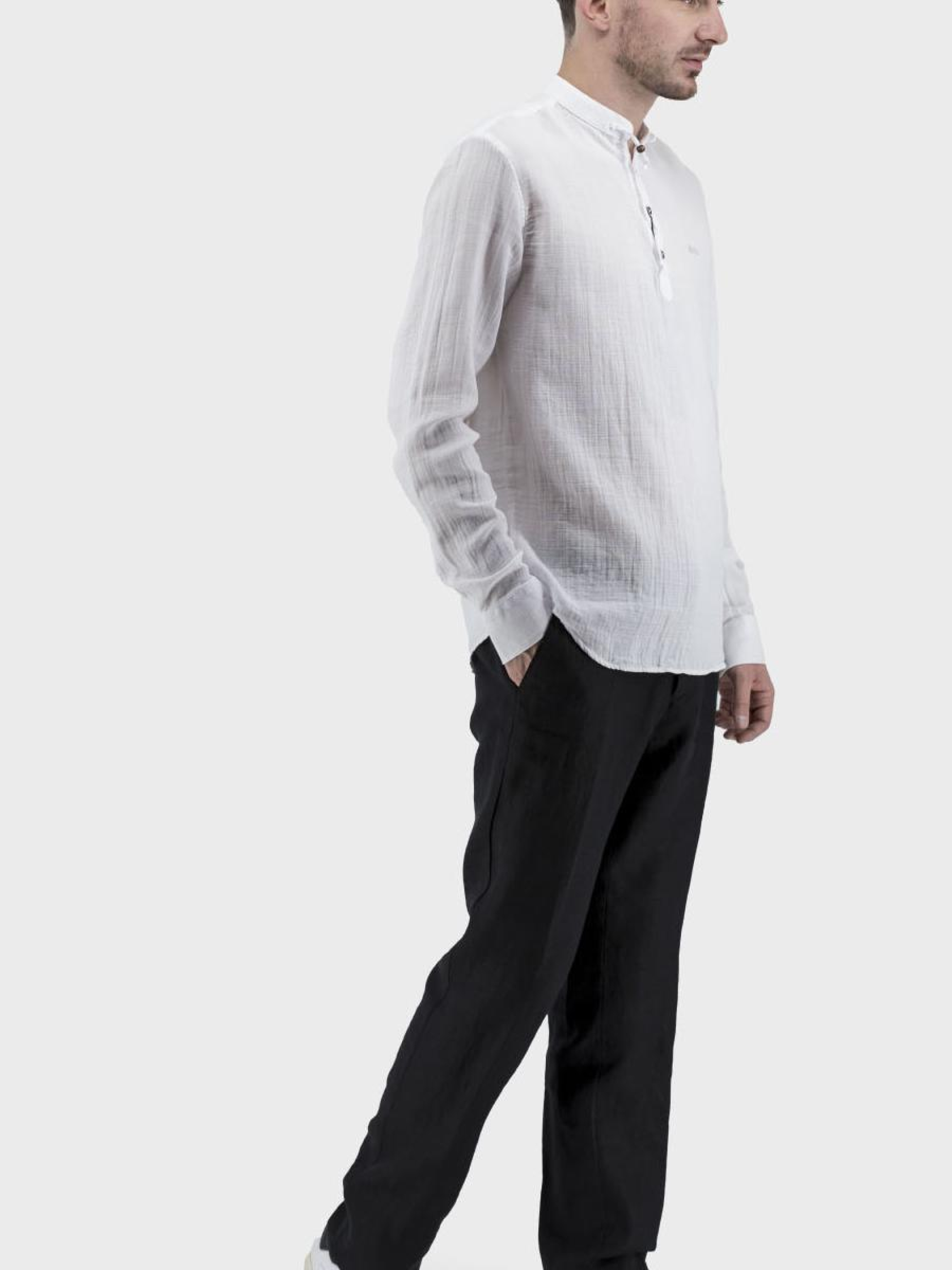 Представляем вашему вниманию стильную мужскую рубашку в casual-стиле, которая подчеркнет вашу индивидуальность в любой ситуации. Идеальная для летнего сезона, эта рубашка изготовлена из качественного легкого материала, без подкладки, что обеспечивает максимальный комфорт даже в жаркие дни. Втачный длинный рукав придает элегантности, тогда как прямой силуэт и воротник-стойка создают непринужденный, современный образ. Рубашка оснащена классической застежкой на пуговицы и представлена в универсальных оттенках – бежевом, белом и черном. Однотонный узор делает ее идеальной для совмещения с любым гардеробом. Отсутствие карманов акцентирует внимание на минималистическом дизайне. Не упустите возможность создать безупречный образ этим летом!
