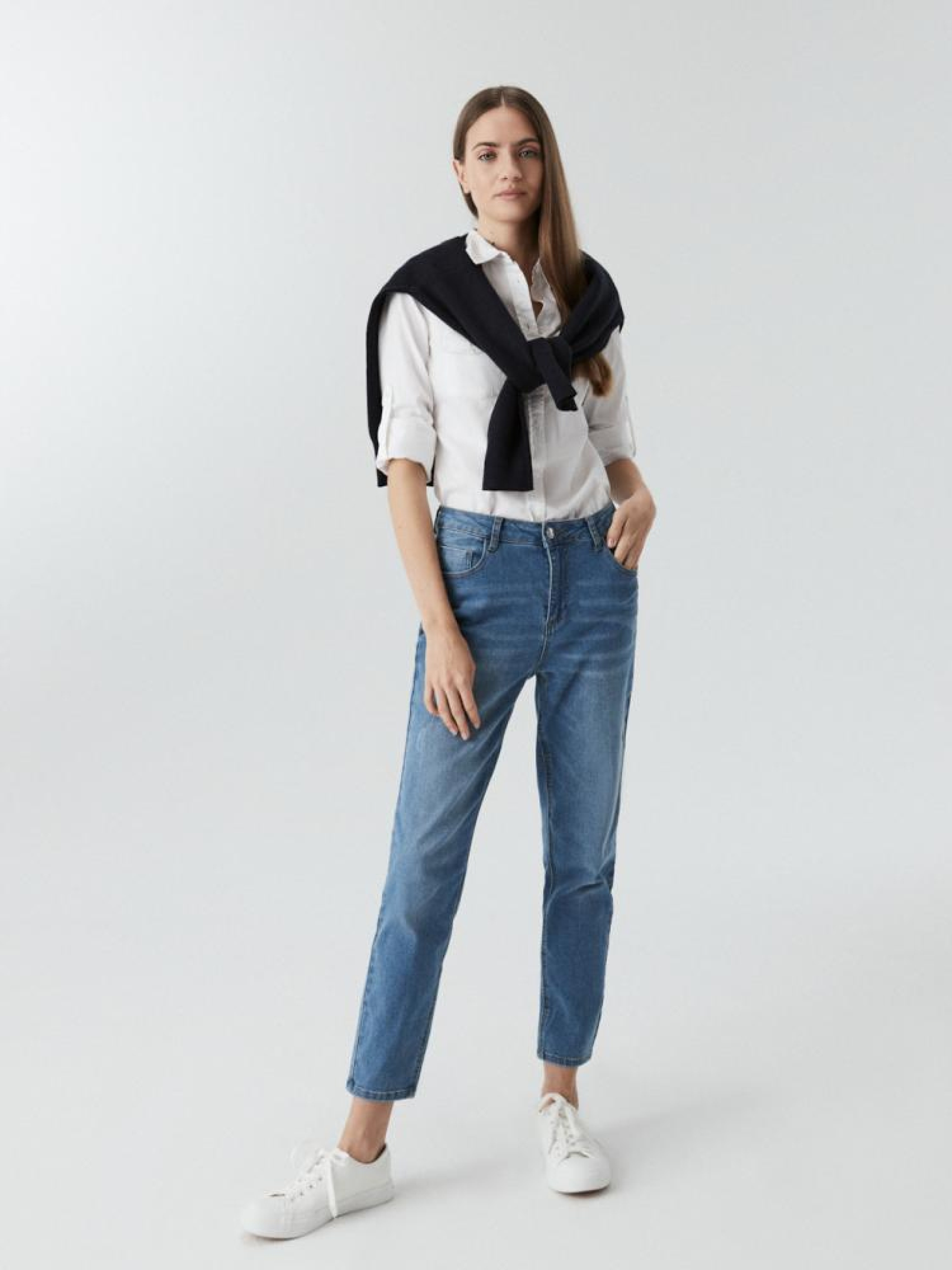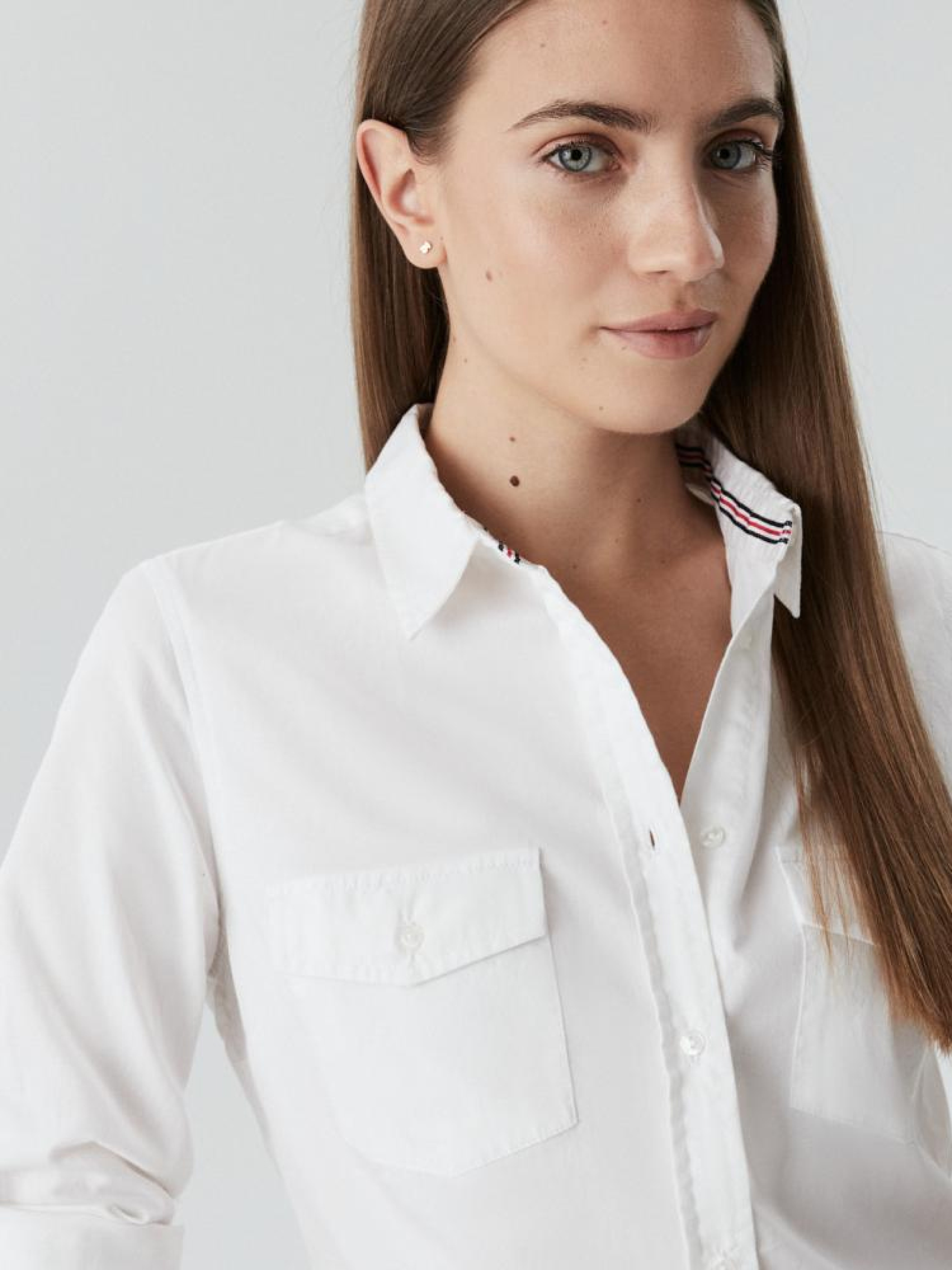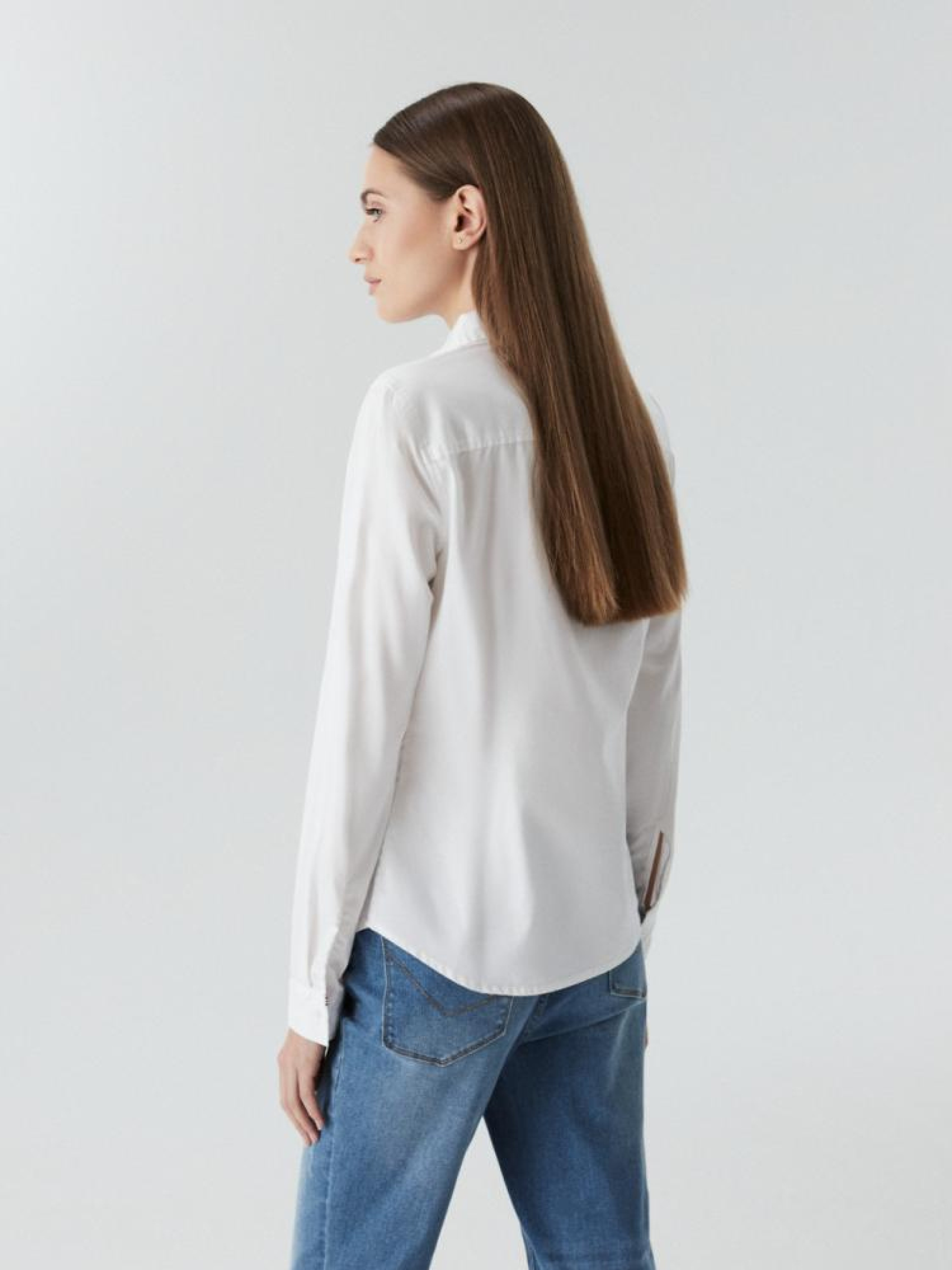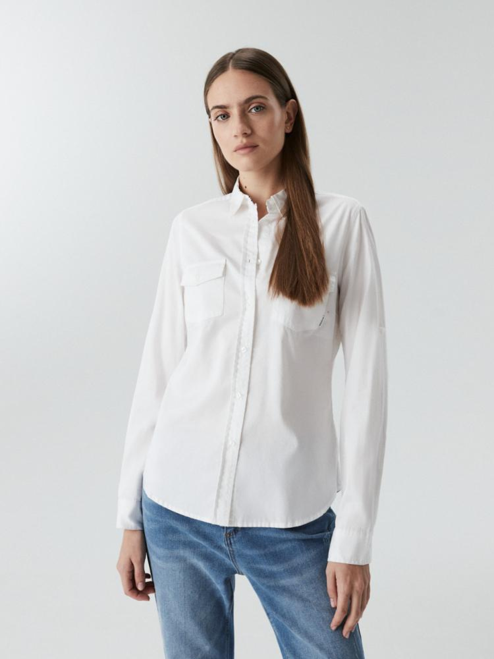 Женская рубашка: - приталенного кроя, – из хлопковой ткани, - застегивается спереди на пуговицы, - с классическим воротником, - передние карманы, - с длинным рукавом, – белого цвета. Сезон: осень/зима. Состав: 100% хлопок. Уход: - стирка при максимум 30 °С - не отбеливать - не сушить в сушильной машине - гладить максимум при темп. 150 °С - не химчистка Размер на модели – S Рост модели – 176 см