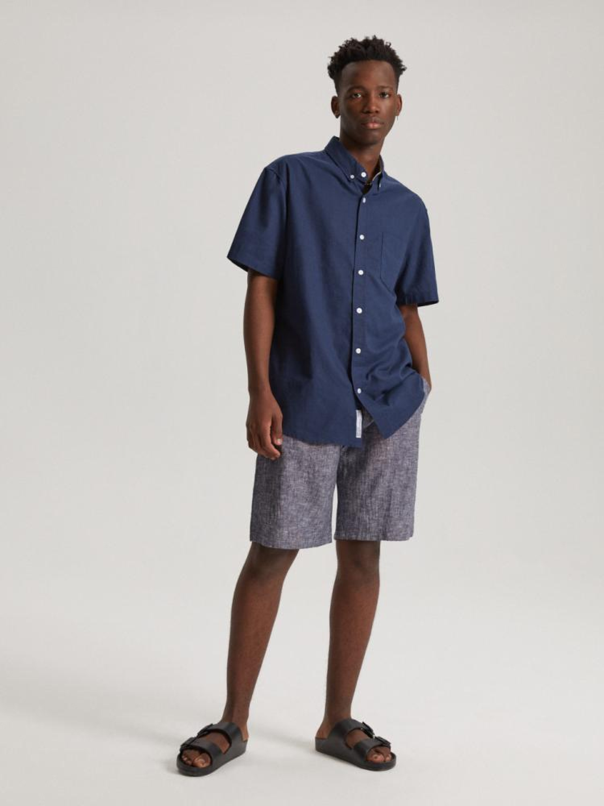 Рубашка LINS SH 10041736 Рубашка обычного кроя: - воздушная ткань из смеси хлопка и льна, - нагрудный карман, – застегивается на пуговицы. Сезон: Весна/Лето Состав: 55% лен 45% хлопок Уход: - стирка при максимум 30 °С - не отбеливать - не сушить в сушильной машине - гладить максимум при темп. 150 °С - не химчистка Размер на модели – XL Рост модели – 176 см