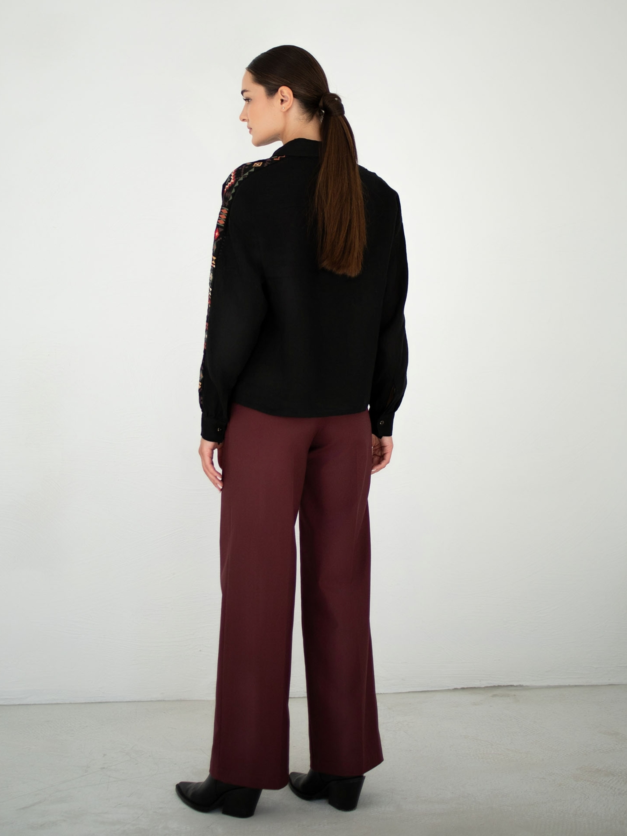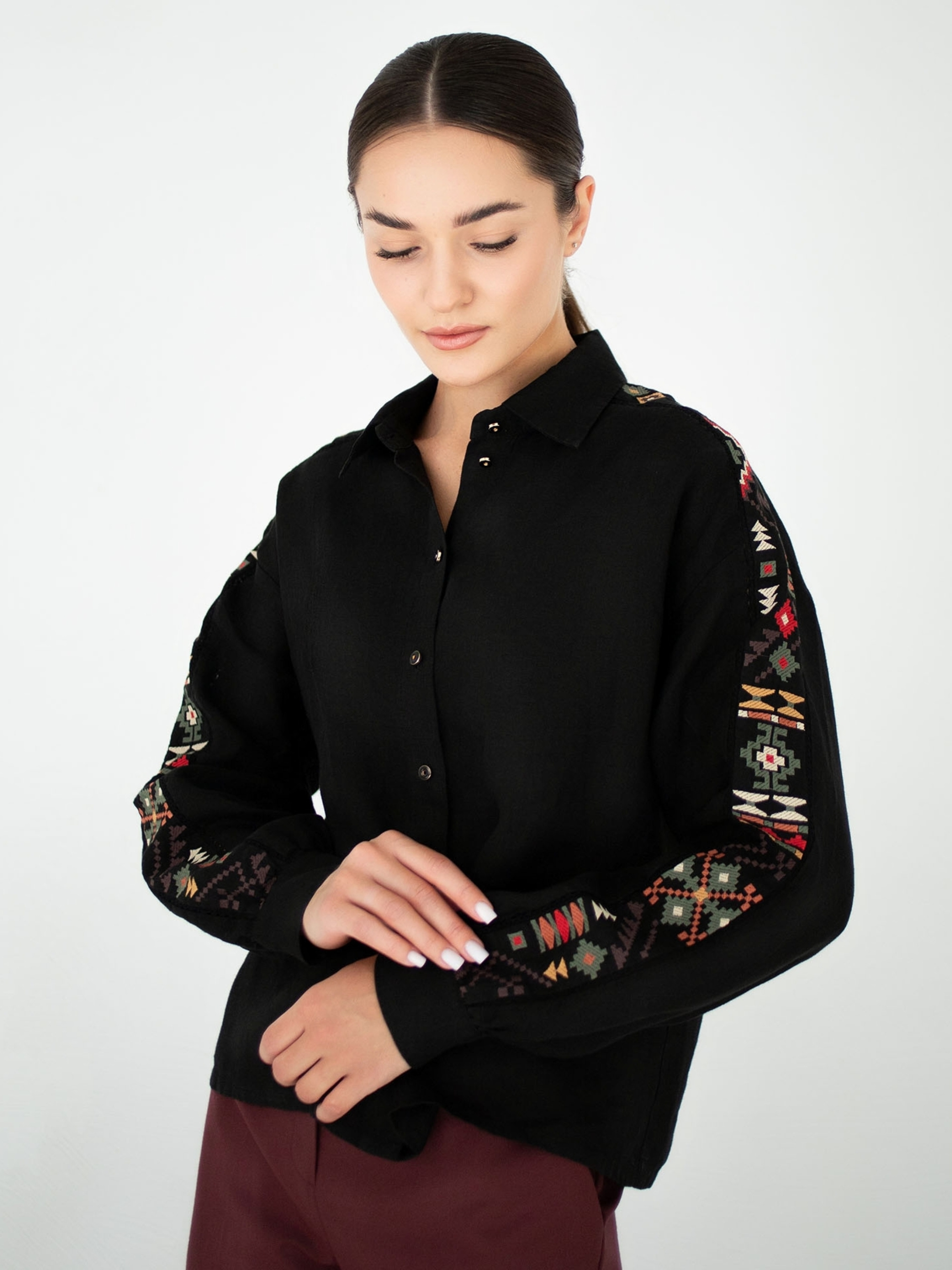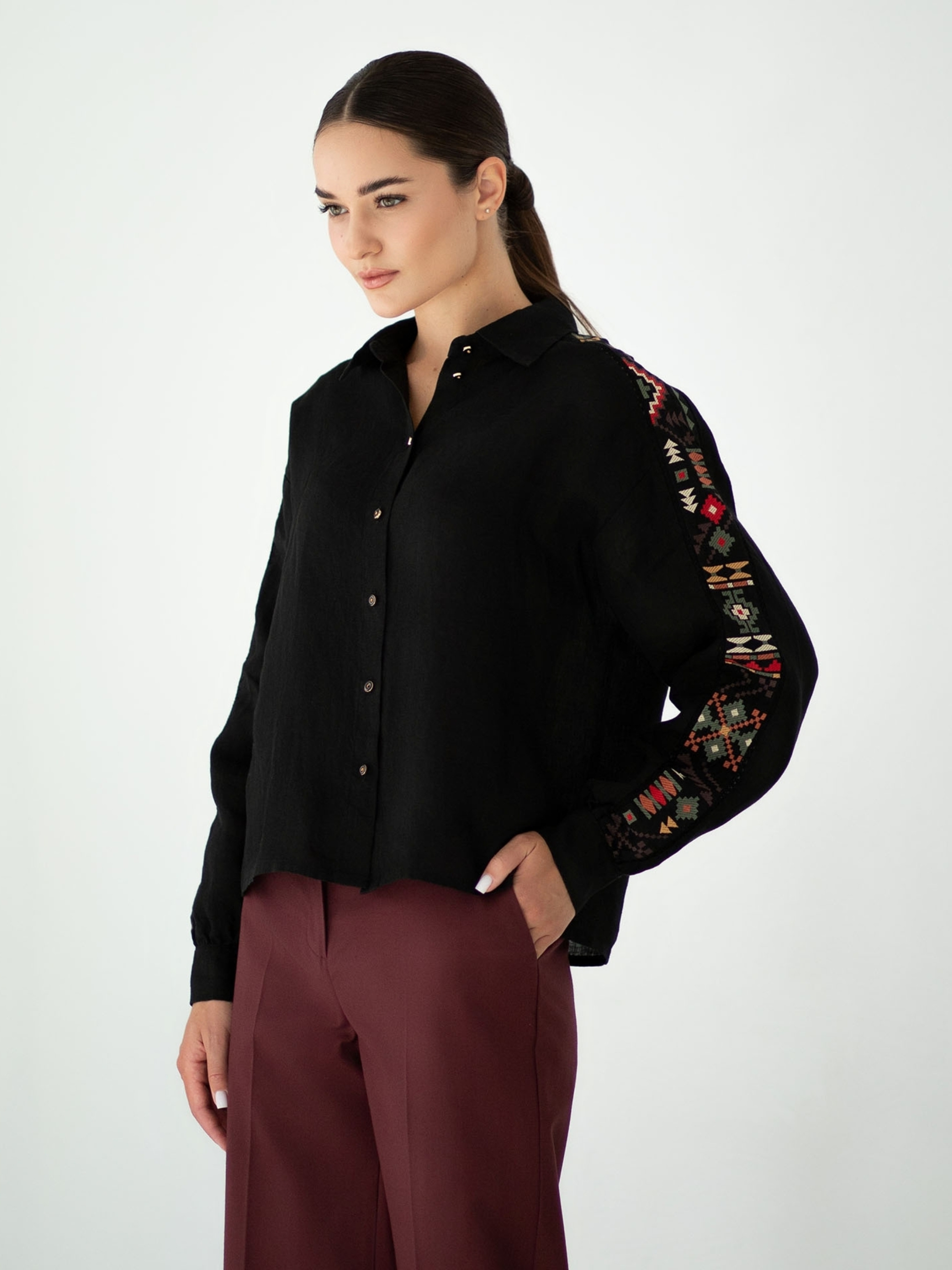 Ця вишукана жіноча блуза з довгими рукавами поєднує сучасний крій із традиційними етнічними мотивами, що надає їй унікального шарму. Виготовлена зі 100% натурального льону, вона приємна до тіла, дихає та ідеально підходить як для теплої, так і для прохолодної погоди. Натуральна тканина гарантує комфорт навіть при тривалому носінні. Фасон блузи вільного крою зі спущеною лінією плеча створює легкий, невимушений силует, що пасує різним типам фігур. Головною родзинкою є декоративні жакардові етно-вставки вздовж рукавів — візерунки виконані в насичених відтінках червоного, зеленого, жовтого та чорного, натхненні українською народною орнаментикою. Ця блуза стане стильним акцентом у повсякденному чи офісному образі, її легко поєднувати як з класичними брюками, так і з джинсами. Ідеальний вибір для тих, хто цінує естетику, комфорт і автентичність.