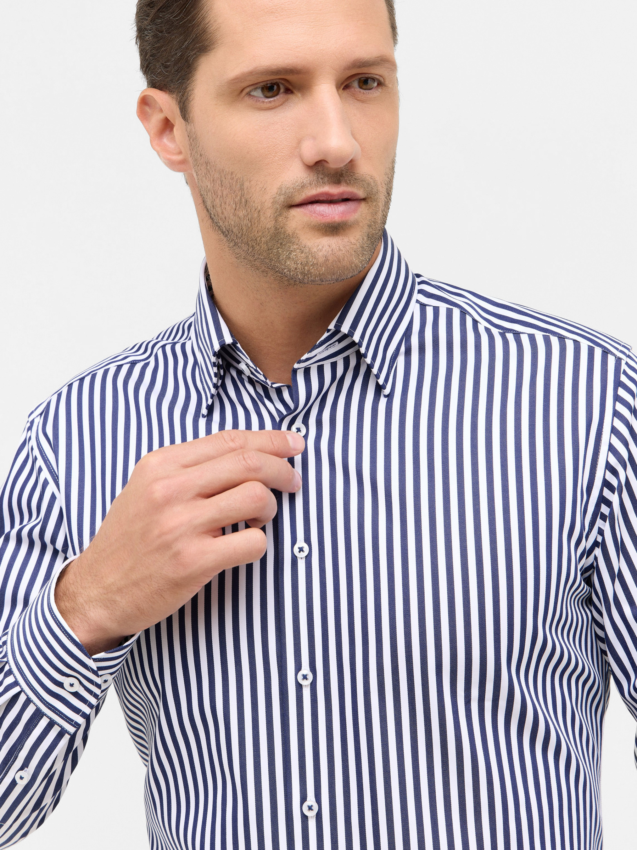 Представьте себе классическую элегантность в современном исполнении: гладкая синяя ткань с тонкой вертикальной полоской излучает сдержанный шик, а прямой крой подчеркивает силуэт. Эта рубашка создана для тех, кто ценит комфорт и стиль одновременно, не соглашаясь на компромиссы. Non-iron satin fabric обеспечивает идеальный вид в течение всего дня. Характеристики модели Состав: 100% хлопок Ткань: Non-iron satin fabric — гладкая, приятная на ощупь, не требует глажки Крой: Modern Fit — пямой силуэт Цвет: Синий с тонкой вертикальной полоской Манжеты: На пуговицах, с возможностью регулировки Преимущества Высококачественный хлопок — натуральный, дышащий, комфортный для ежедневной носки Non-iron satin — всегда безупречный вид без дополнительных усилий Элегантный дизайн — тонкие полоски делают рубашку универсальной для работы и торжественных мероприятий