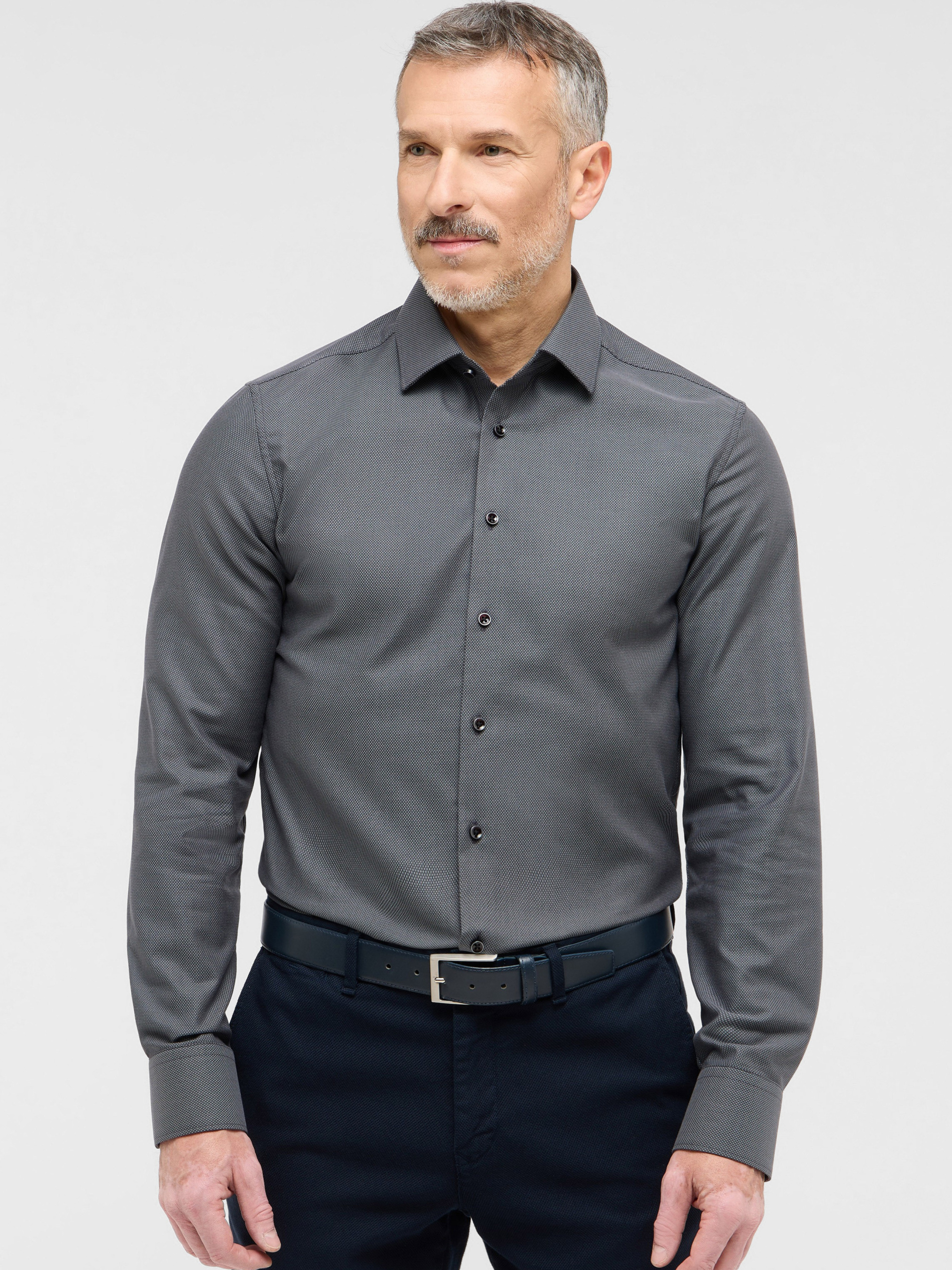 Эта рубашка сочетает классический стиль и современные технологии. Изготовлена из 100% хлопка с использованием технологии Dynamic Cotton™, которая обеспечивает естественную эластичность без синтетических волокон. Ткань имеет эффект ""non-iron"", что позволяет сохранять безупречный вид в течение всего дня без необходимости глажки. Характеристики модели Состав: 100% хлопок Ткань: Dynamic Cotton™ — инновационная ткань с естественной эластичностью Крой: Slim Fit — приталенный силуэт Цвет: Черный с тонким структурным рисунком Воротник: Kent Collar Манжеты: Комбинированные, с возможностью регулировки Длина рукава: Стандартная (около 67 см) Применение: Для офиса, деловых встреч и торжественных мероприятий Преимущества Естественная эластичность: Технология Dynamic Cotton™ обеспечивает комфорт и свободу движений без использования синтетики Безупречный вид: Эффект ""non-iron"" позволяет сохранять рубашку без складок в течение всего дня Современный дизайн: Приталенный крой и стильный воротник Kent добавляют элегантности образу Универсальность: Подходит для различных ситуаций — от офиса до торжественных мероприятий