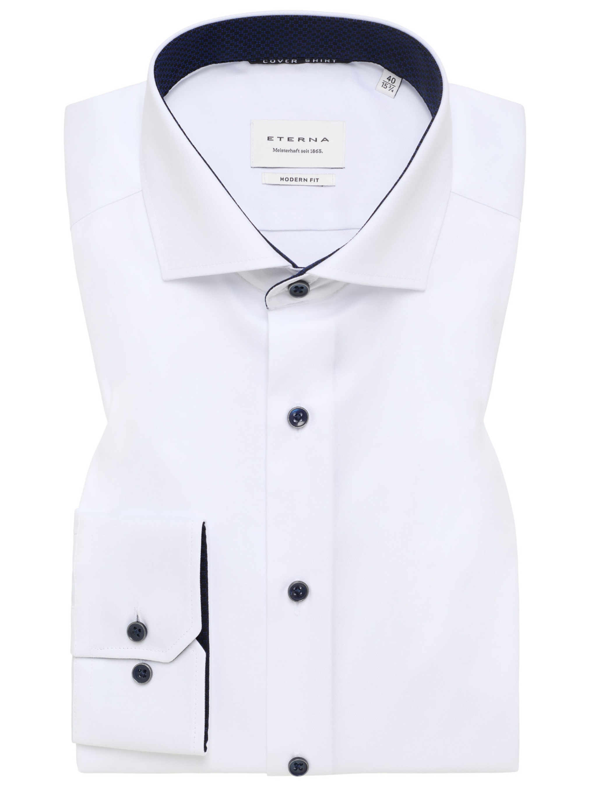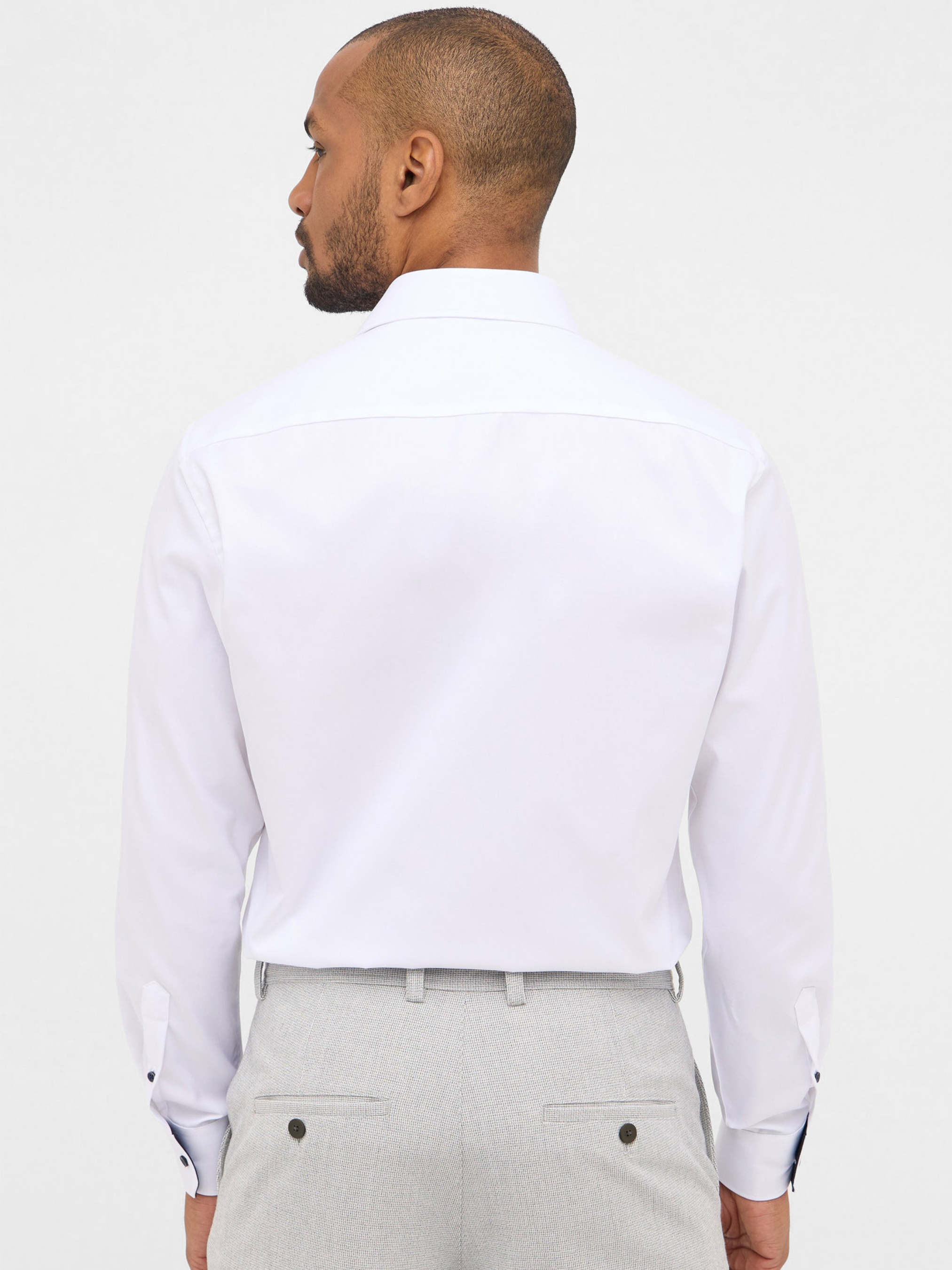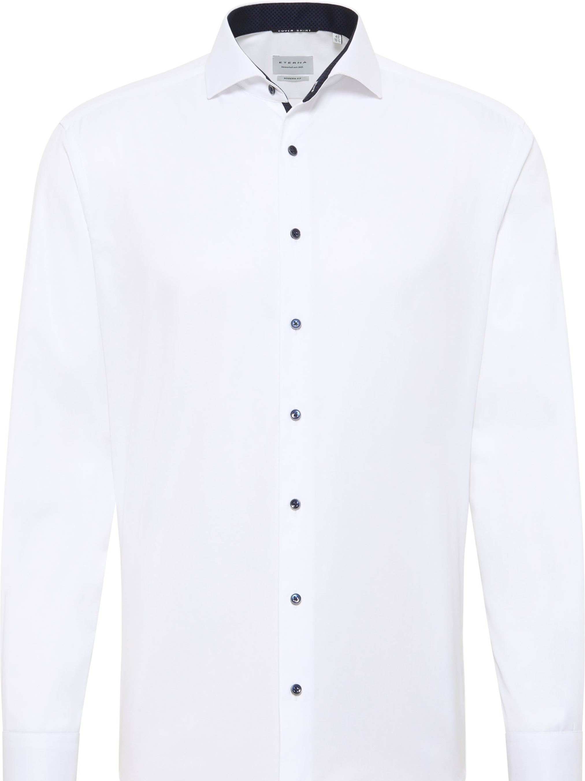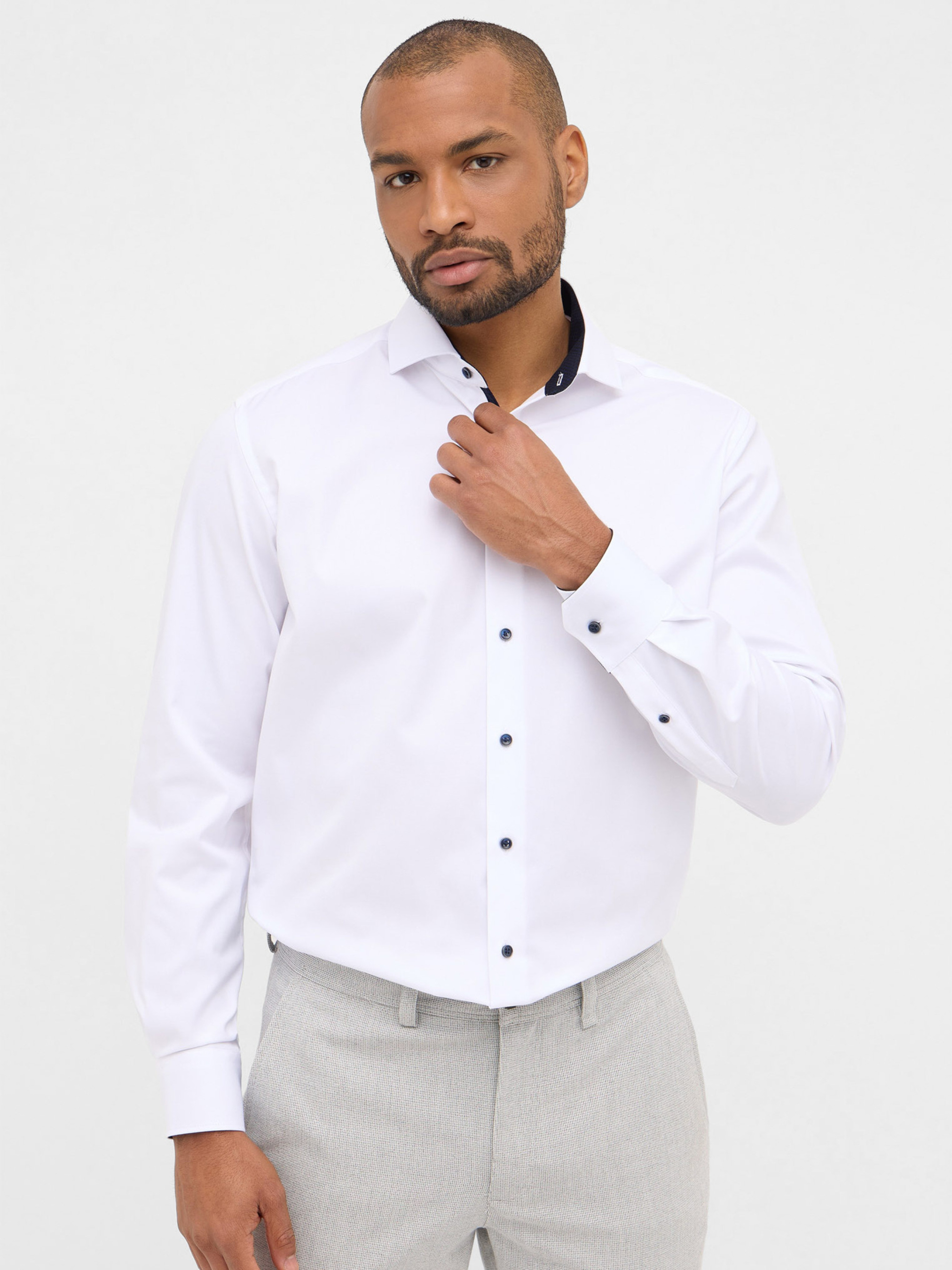 Эта белая сорочка от бренда Eterna сочетает классический стиль с современными деталями. Приталенный Modern Fit силуэт подчёркивает фигуру, обеспечивая свободу движения. Классический отложной воротник с контрастной темно‑синей отделкой с внутренней стороны и аккуратные манжеты создают стильный акцент. Контрастные чёрные пуговицы придают модели современный шарм и делают её заметной. Изготовлена из 100% хлопка, ткань мягкая, дышащая и не просвечивается. Сорочка легко поддерживается в аккуратном виде и не требует постоянного глажения.