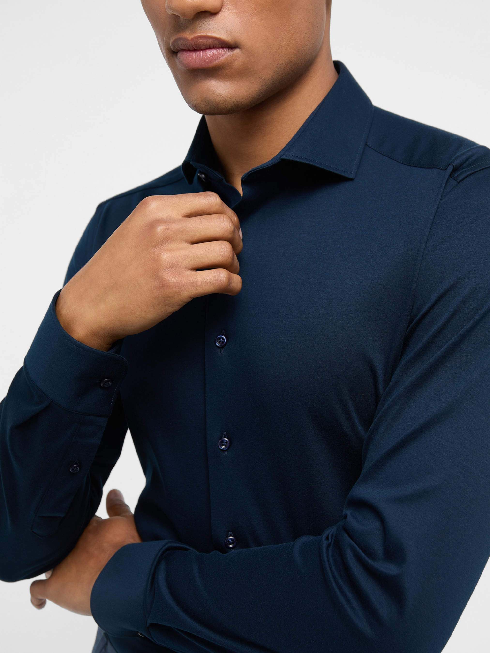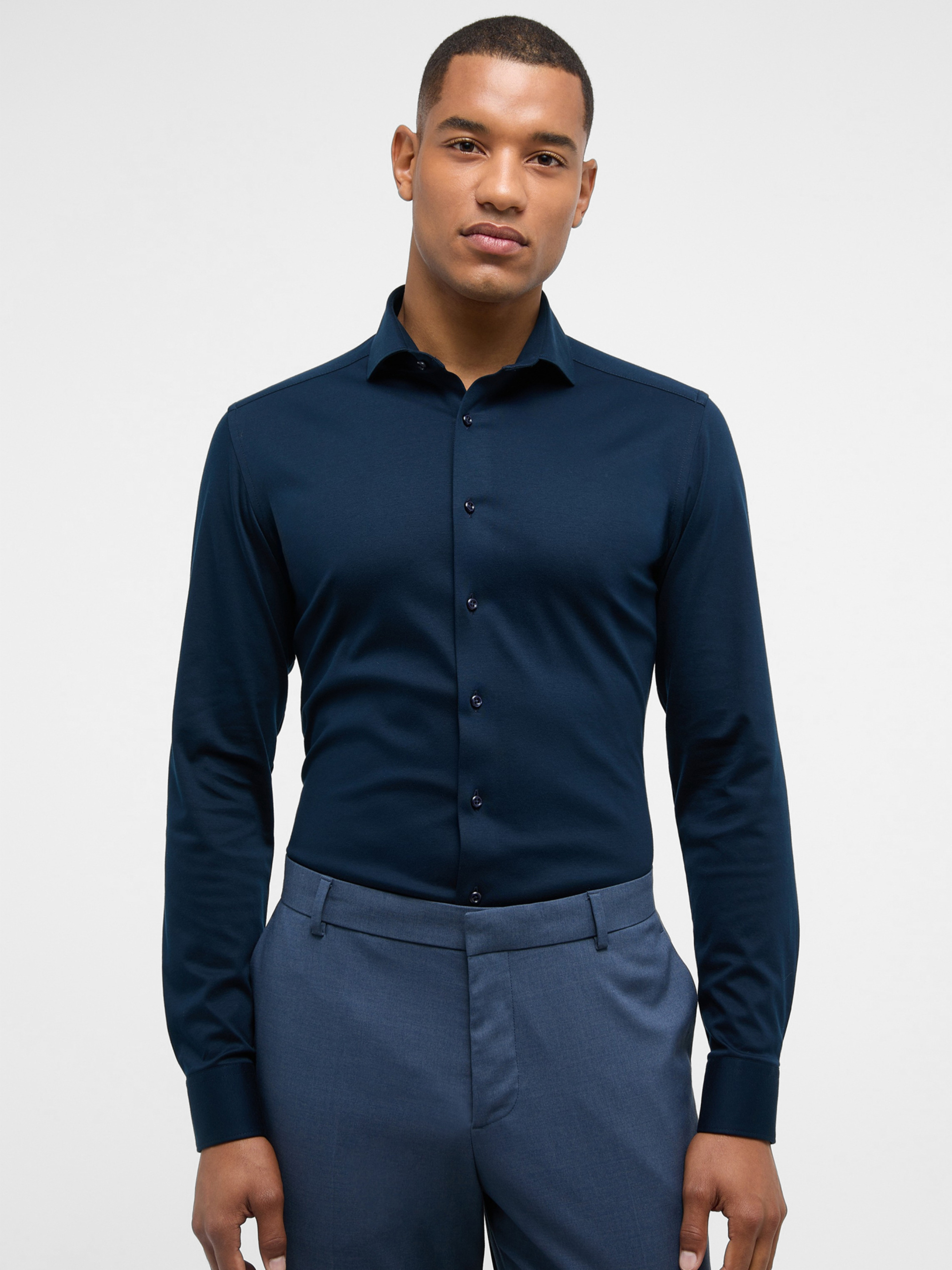 Удобная, как футболка - стильная, как деловая рубашка! Эта эластичная РУБАШКА ИЗ ДЖЕРСИ из нашей премиальной линии «1863 by ETERNA» отличается роскошной мягкостью. Высококачественный трикотаж повторяет каждое ваше движение и станет идеальным дополнением к вашему ухоженному образу в офисе или в свободное время. Мягкий воротник и манжеты, а также неклееные вставки обеспечивают ощущение комфорта и расслабленности. Рубашка SLIM FIT изготовлена из 100% мерсеризованного хлопка (не требует глажки) и сочетает в себе стиль и практичность. Мерсеризованный хлопок обладает многочисленными преимуществами: он более гладкий, прочный и долговечный, чем обычный хлопок, а также имеет шелковистый блеск. Подол закруглен и укорочен, поэтому эту трикотажную рубашку можно носить поверх брюк. Наденьте ее и почувствуйте себя хорошо - закажите онлайн уже сегодня.