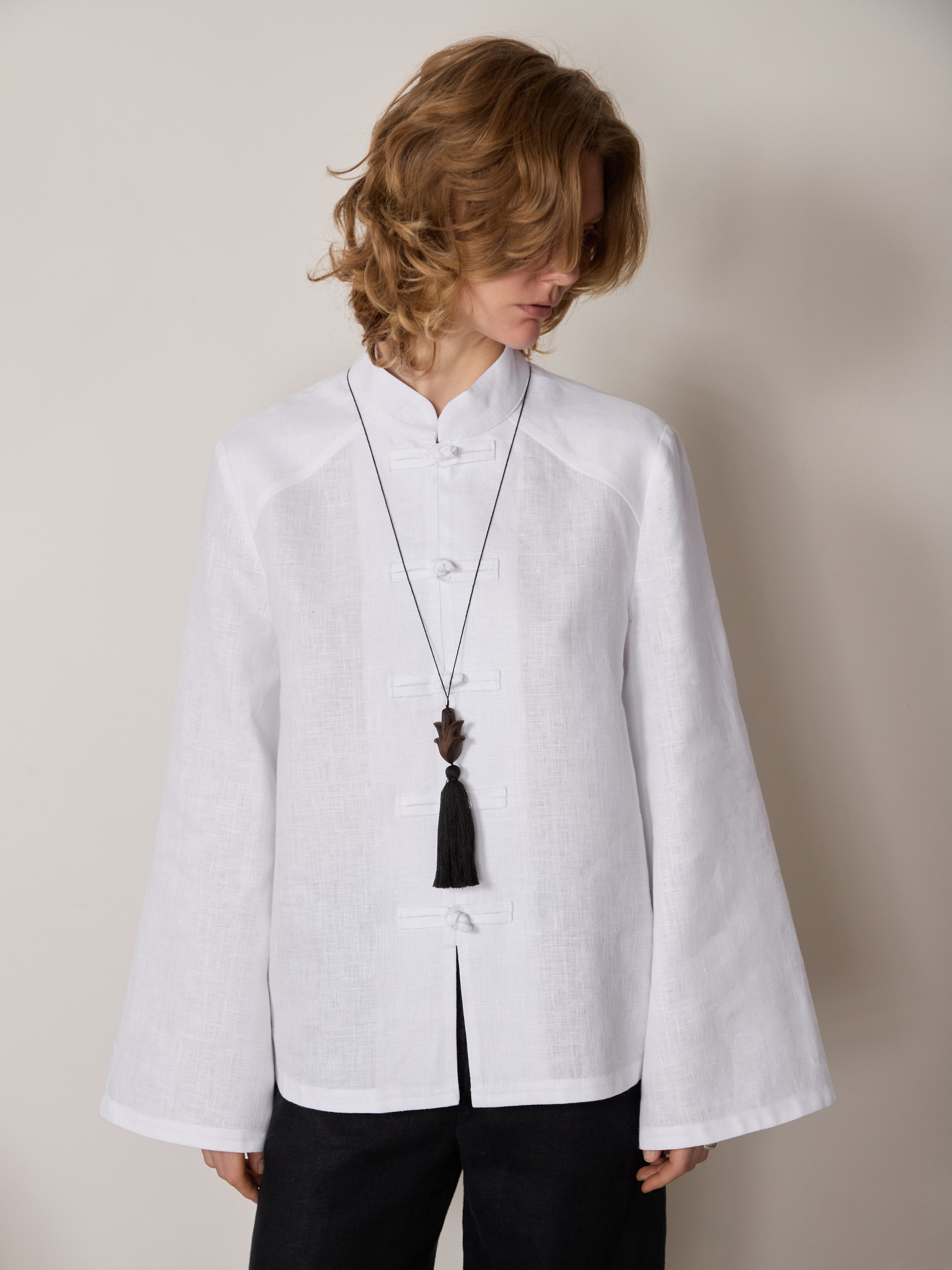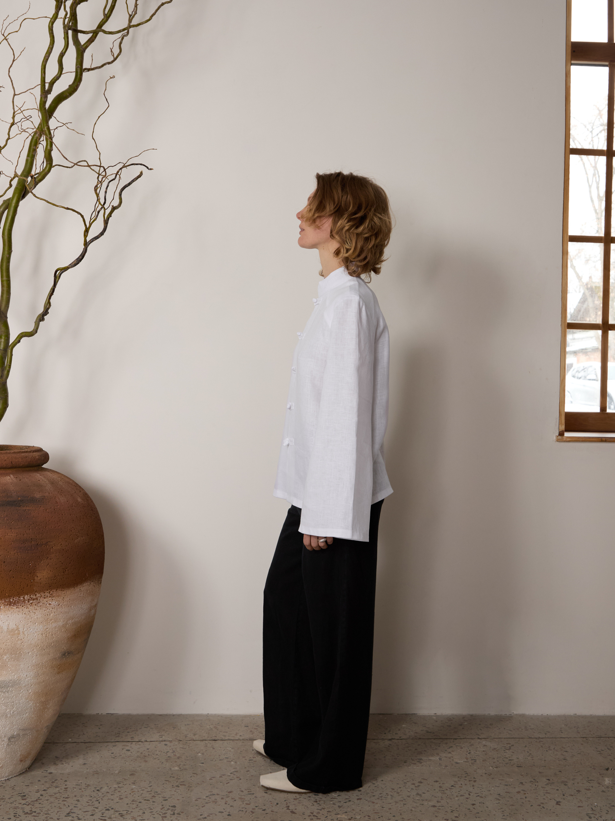 Вільна сорочка з 100% натурального льону — поєднання мінімалізму, архітектурної форми та м’якої природної текстури. Модель натхненна східною естетикою: стриманий комір-стійка, делікатні застібки-петлі спереду та чисті лінії створюють витончений, збалансований силует. Широкі рукави з м’яким розкльошенням додають образу легкості й пластики, а прямий вільний крій забезпечує комфорт і свободу рухів. Натуральний льон дихає, приємний до тіла та красиво тримає форму, розкриваючи глибину білого кольору. Сорочка легко поєднується з класичними брюками, лляними костюмами або денімом, створюючи як лаконічний повсякденний образ, так і більш концептуальний стиль для особливих подій. Деталі: Вільний прямий крій Комір-стійка Декоративні застібки-петлі Широкий рукав Довжина: 65 см в розмірі S Довжина рукава: 62 см Колір: білий Матеріал: 100% натуральний льон