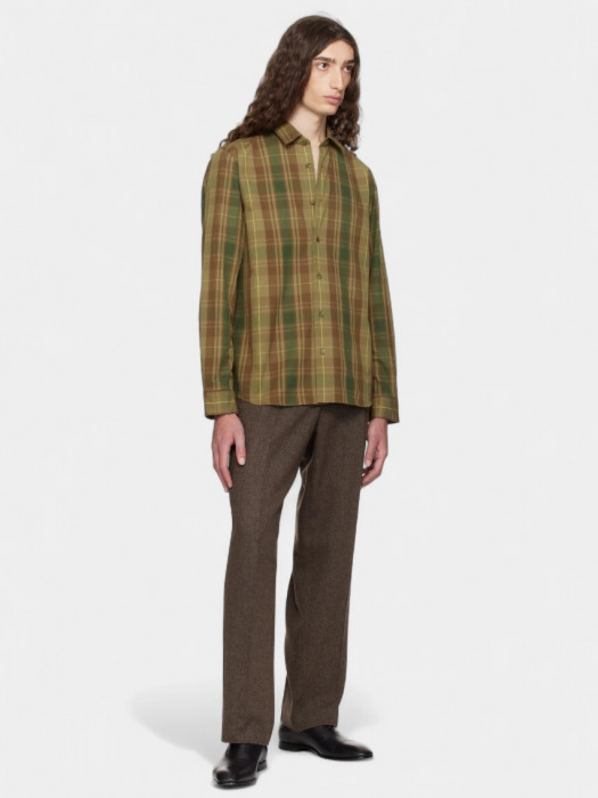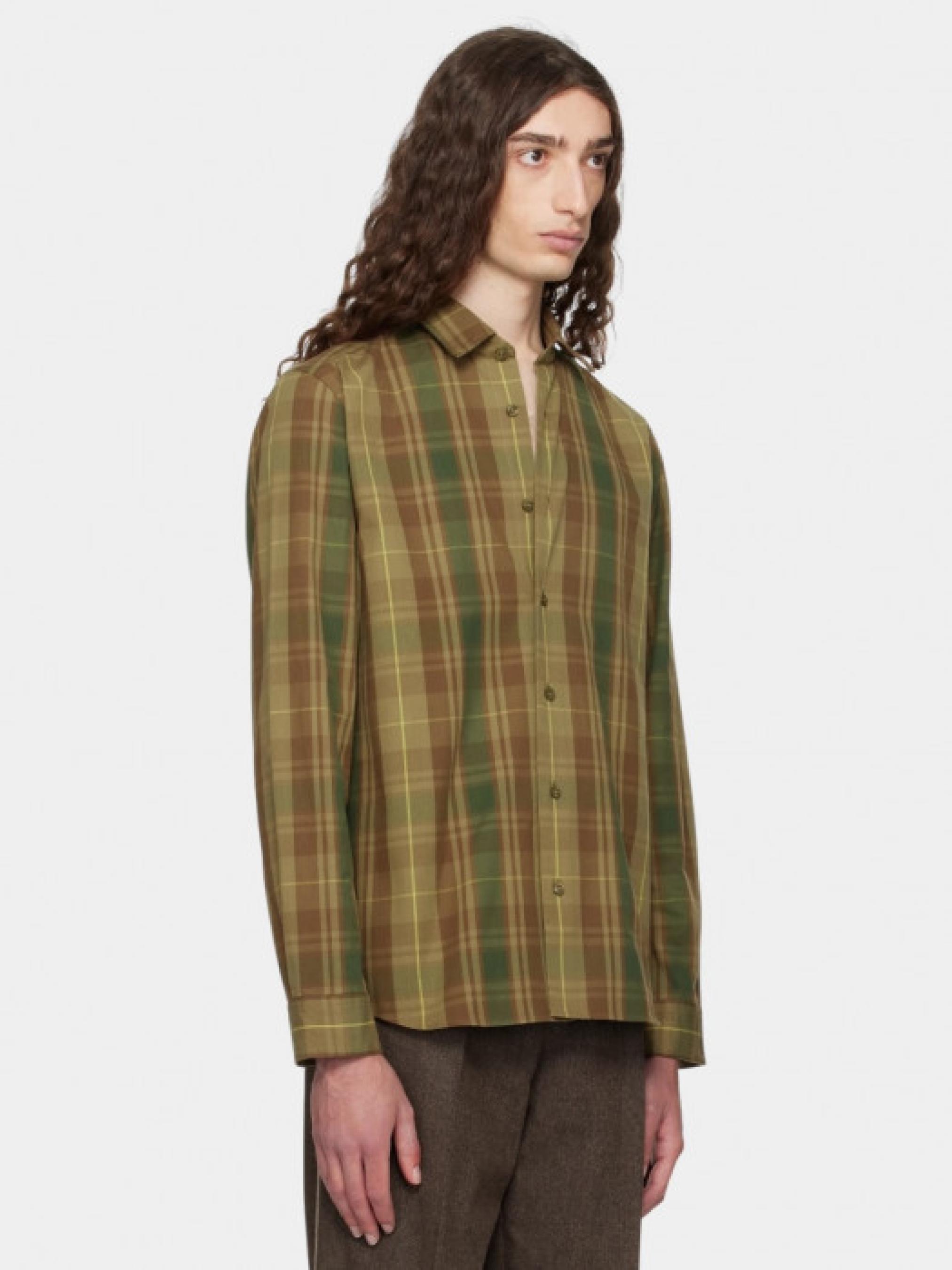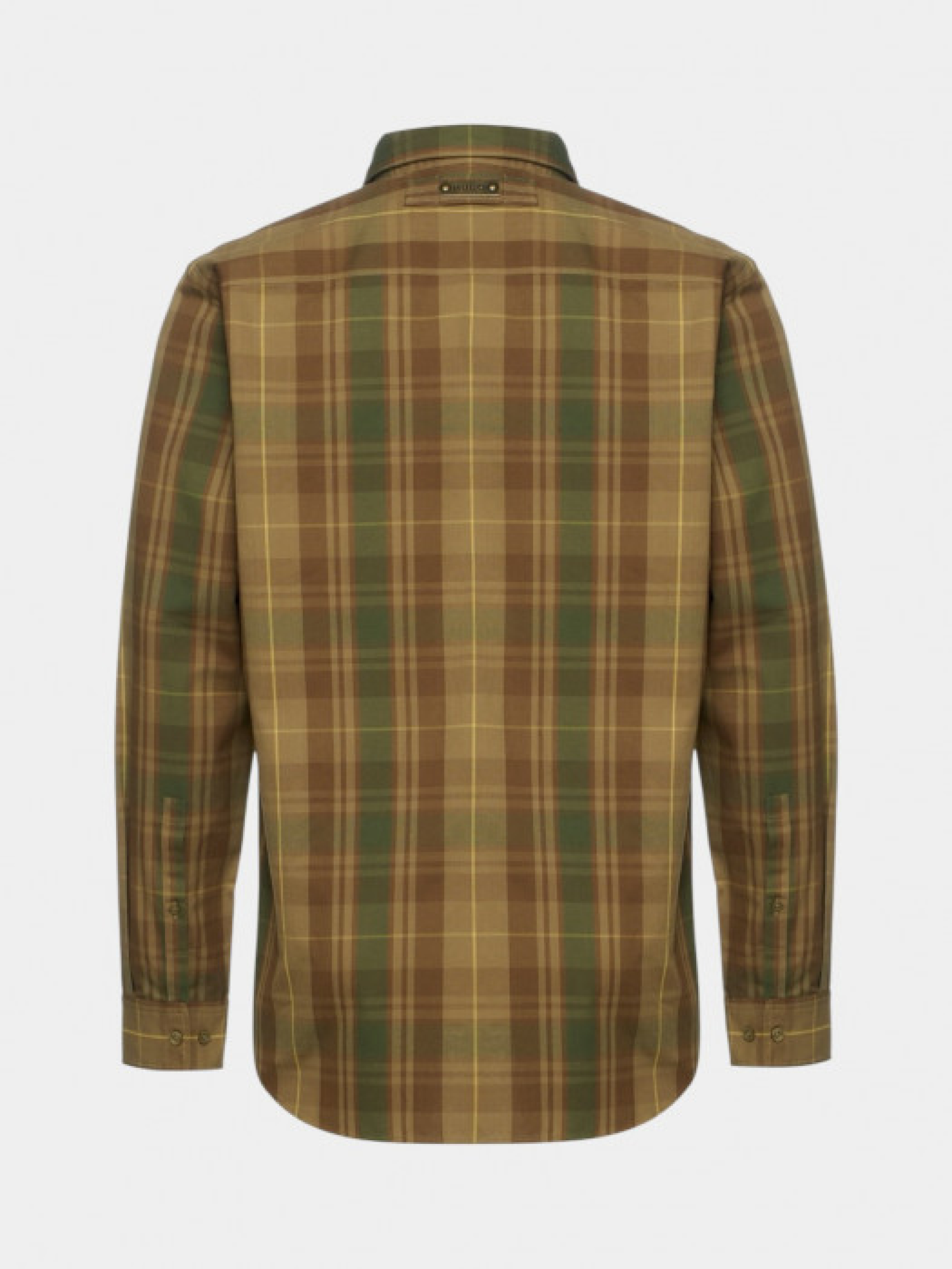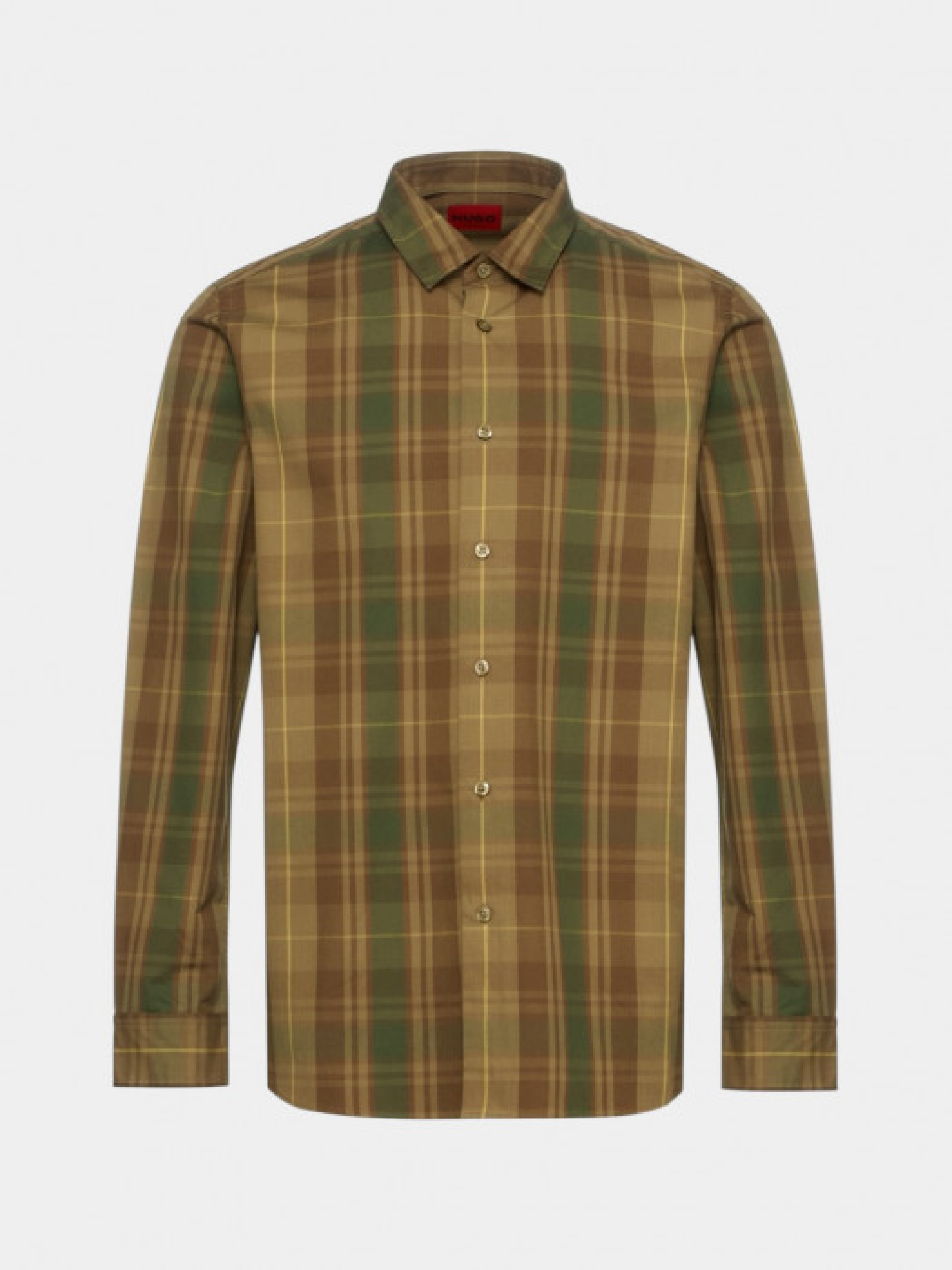 Рубашка HUGO в клетку с длинными рукавами и классическим воротничком. Изготовлен из хлопчатобумажной ткани с принтом в зелено-коричнево-желтых тонах. Имеет традиционный крой с застежкой на пуговицы спереди, нагрудный карман и регулируемые манжеты. Сзади расположен небольшой лейбл бренда Hugo. Клетчатый рисунок образует геометрический узор в земляных оттенках. Крой классический, слегка приталенный. Материал мягкий и дышащий, комфортный для длительного ношения.