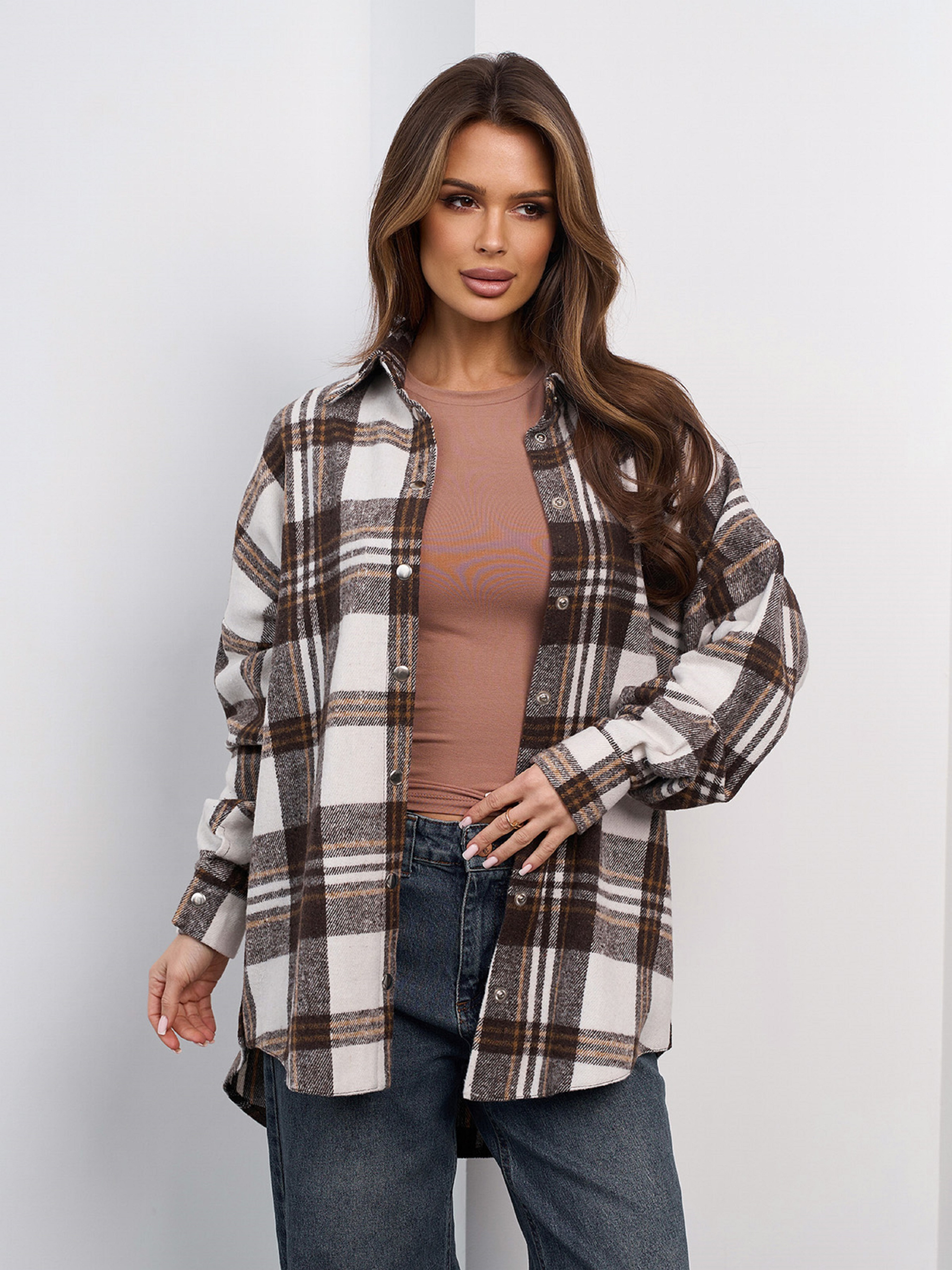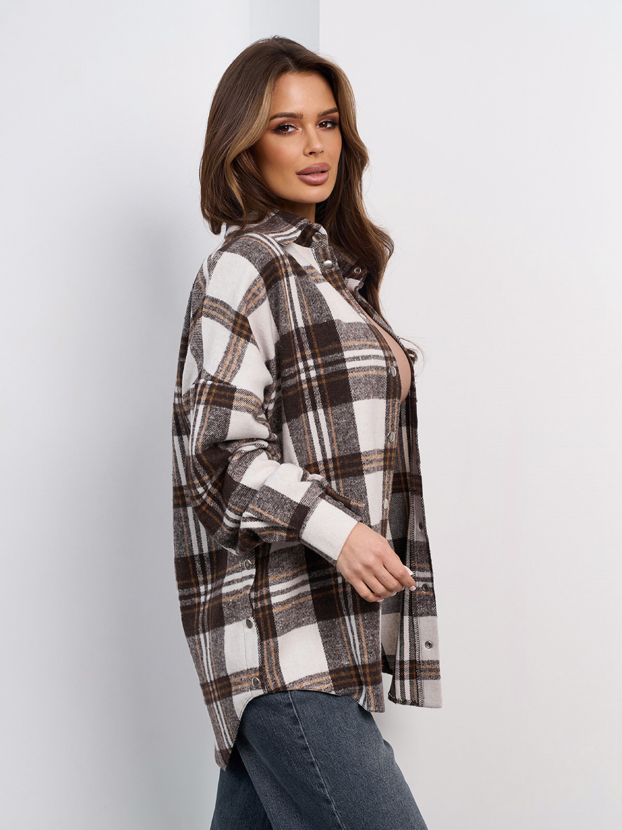 Утепленная рубашка свободного асимметричного кроя, выполненная из бело-коричневого шерстяного клетчатого материала. Рубашка на кнопках с боковыми вырезами на кнопках и длинными рукавами. Полуобхват: Грудь: S (55), M (57), L (59), XL (61), Длина изделия - 75, Рукав - 56, Ткань: Низкой эластичности.