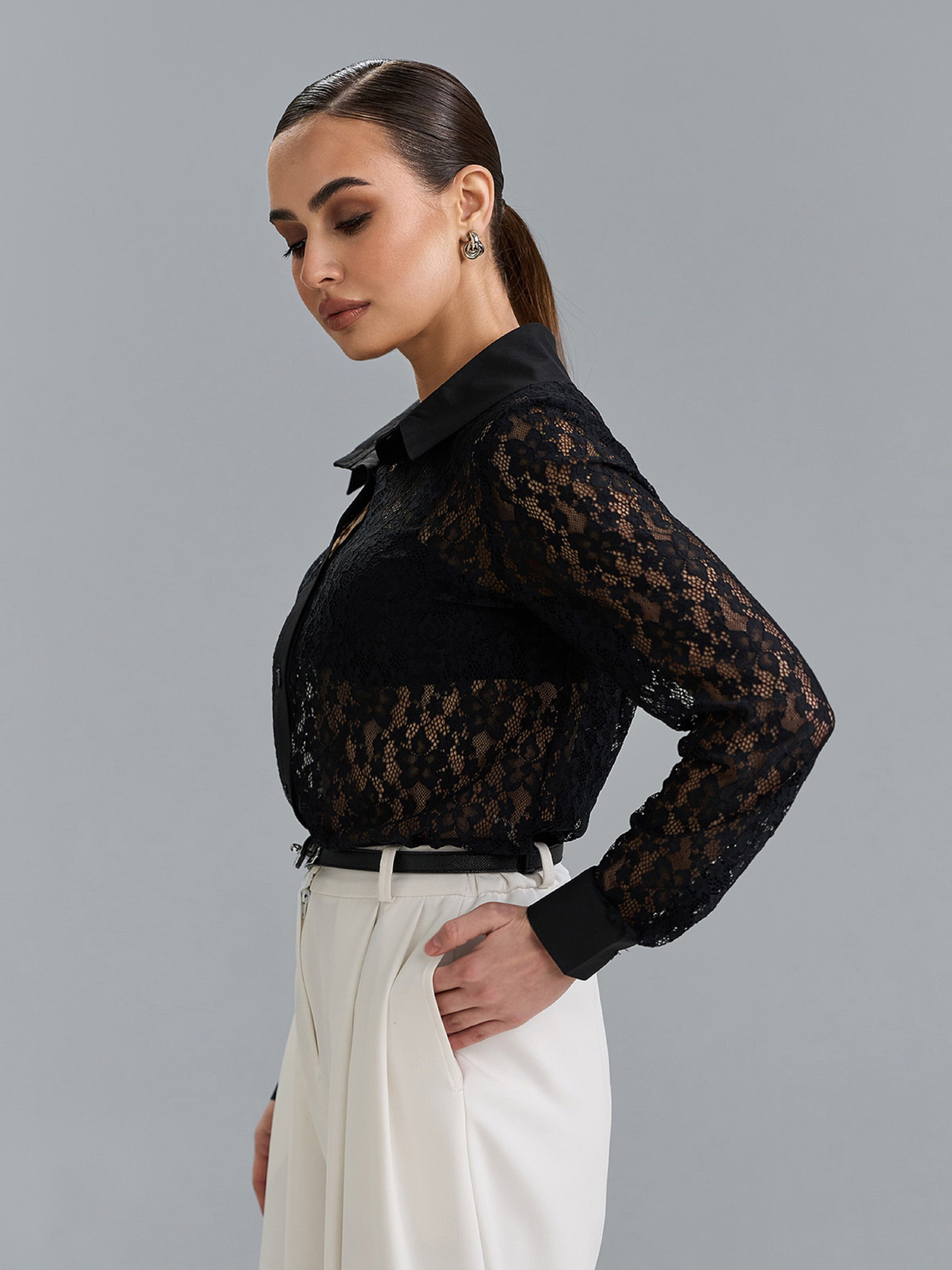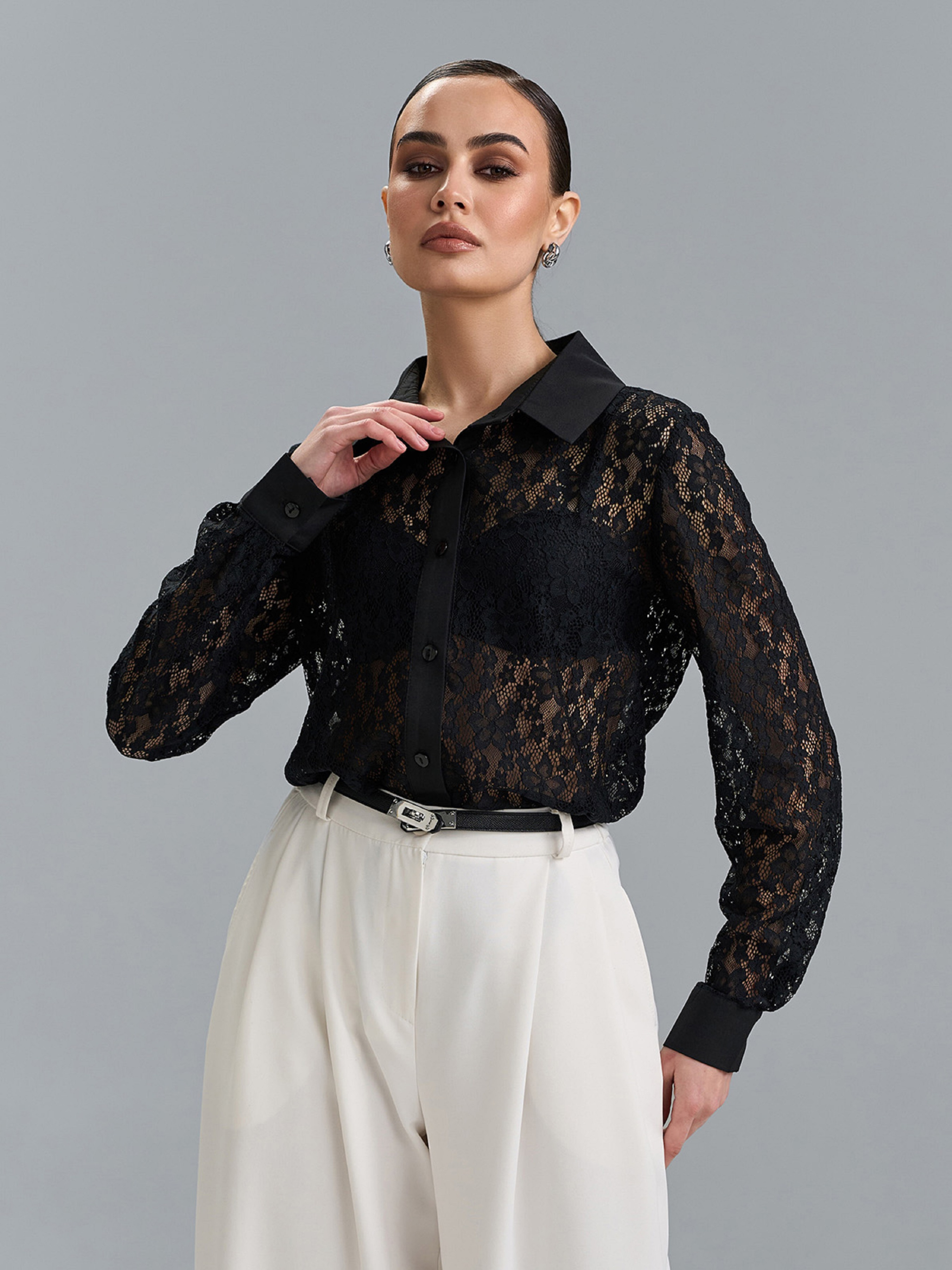 Чорна ошатна сорочка на ґудзиках, виготовлена з напівпрозорого гіпюру. Сорочка прямого вільного крою з довгими рукавами на манжетах та коміром. Напівобхват: Грудь: S (48), M (50), L (52), XL (54), Довжина виробу - 63, Рукав - 61, Тканина: Низької еластичності.