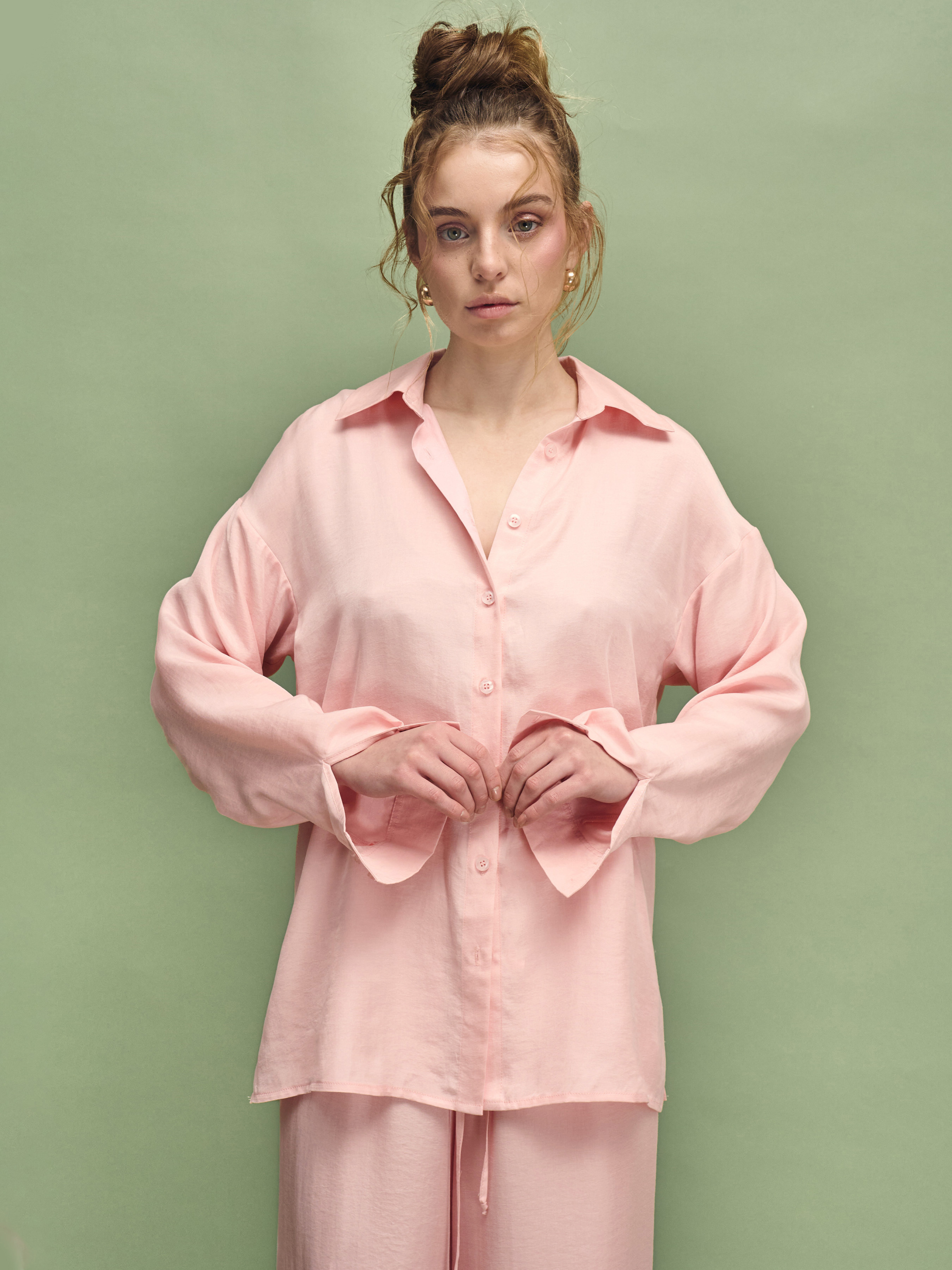 62% lyocell 38% viskon. Она ощущается как свежий воздух на коже: легкая, мягкая, без напряжения — блуза, успокаивающая с первого прикосновения и поддерживающая состояние «перерождения». Крой прямой с oversize-объемом, удлиненная линия, заниженное плечо, классический воротник и планка на пуговицах дают нотки классики без жесткости. На спинке — кокетка и складка, придающие движению и аккуратный объем, манжеты оформляют рукав чисто и лаконично. В оттенке молоко она звучит как базовый минимализм, в светло-розовом – как мягкий акцент для медленного ритма. Материал этой одежды следует описать как чувство заботы: тенсел (лиоцел) с вискозой. Тенсел дает гладкость, деликатный природный блеск и пластичность – блуза красиво драпируется, «дышит» и комфортно ведет себя в течение дня. Вискоза усиливает мягкость и легкость, поэтому вещь естественно ложится по телу и не утруждает. Это минималистичная женская одежда на каждый день: дома, в городе, в поездках, для работы из дома — как самостоятельная вещь или базовый слой поверх топа. Заказать себе такую практичную вещь – значит выбрать женскую одежду для комфорта и обновления; эту женскую блузу из тенсела хочется носить снова и снова, так что ее легко купить как свою новую базу. Оттенок ткани может иметь легкие отличия от изображения из-за особенностей фото и цветопередачи на различных устройствах.