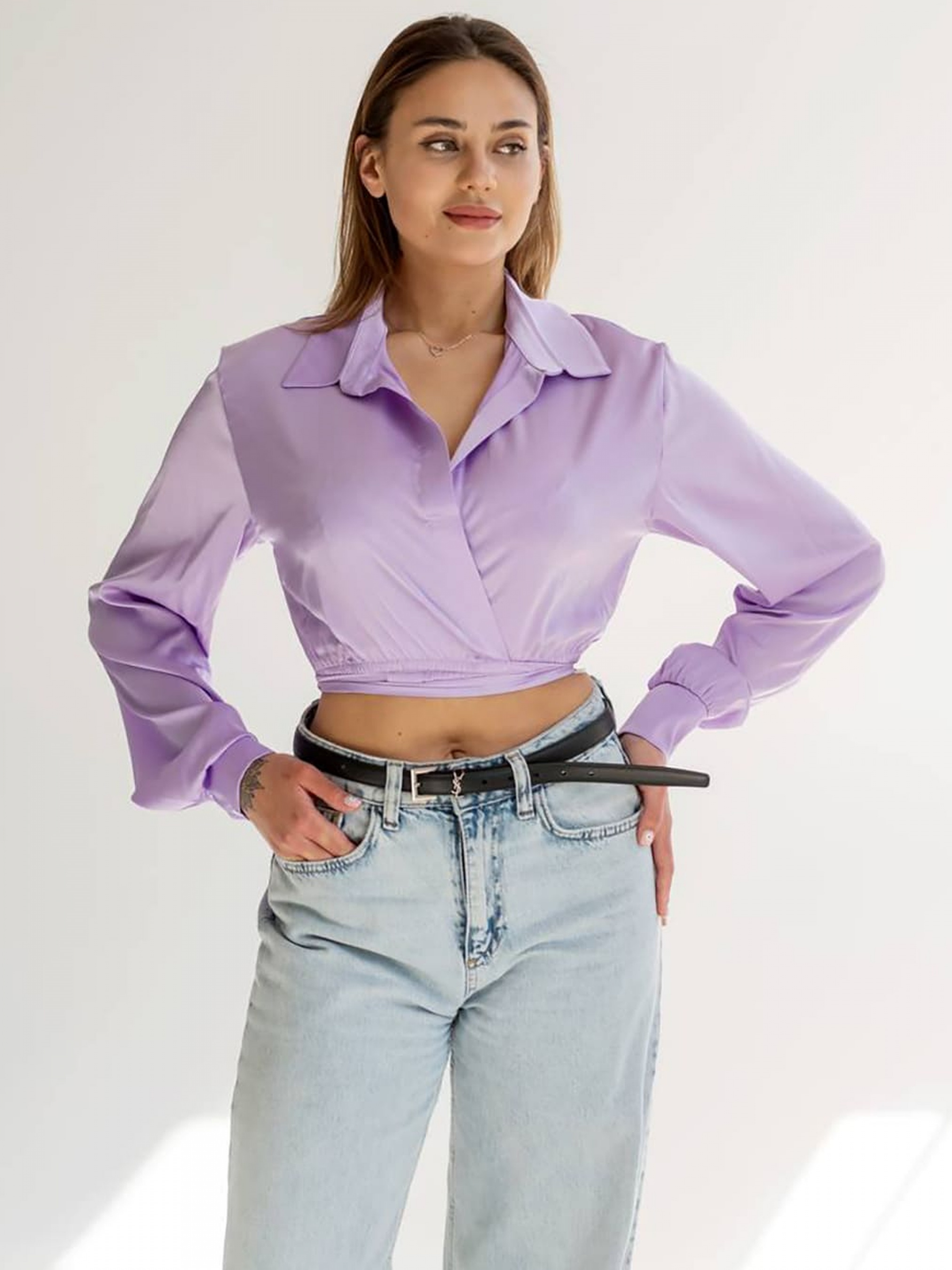 Шовкова вкорочена сорочка із стильними зав'язками на талії; Силует: прямий/приталений; Вигляд застібки: половинки переду мають свободу, заходять одна на одну і фіксуються зав'язками навколо талії.; Оформлення горловини: комір сорочкового типу. Склад: Поліестер 98%, еластан 2%