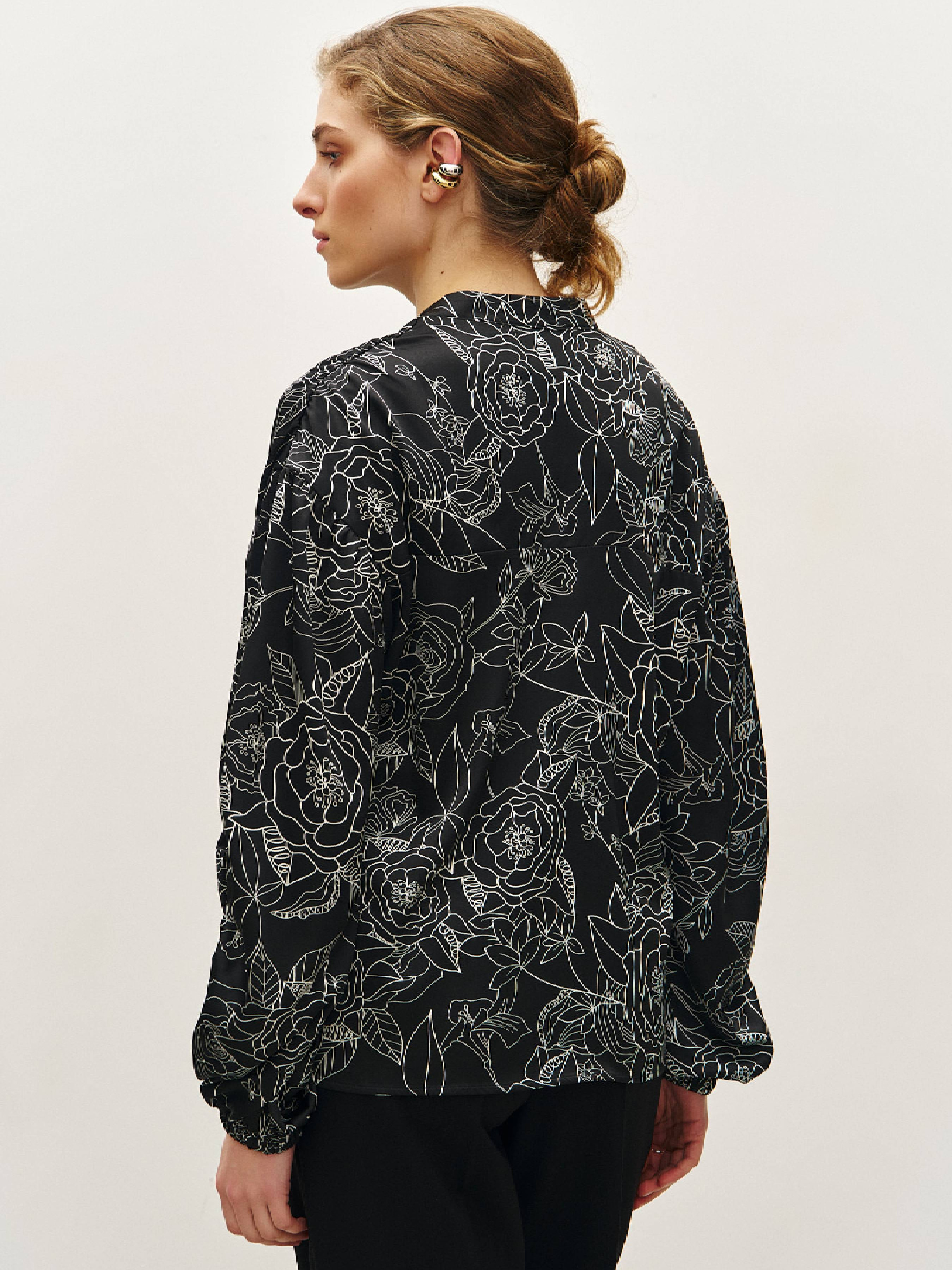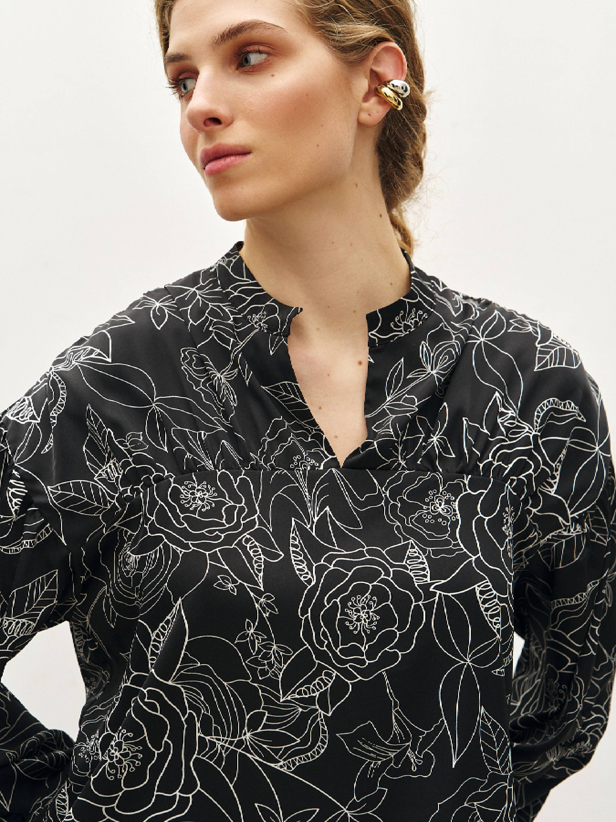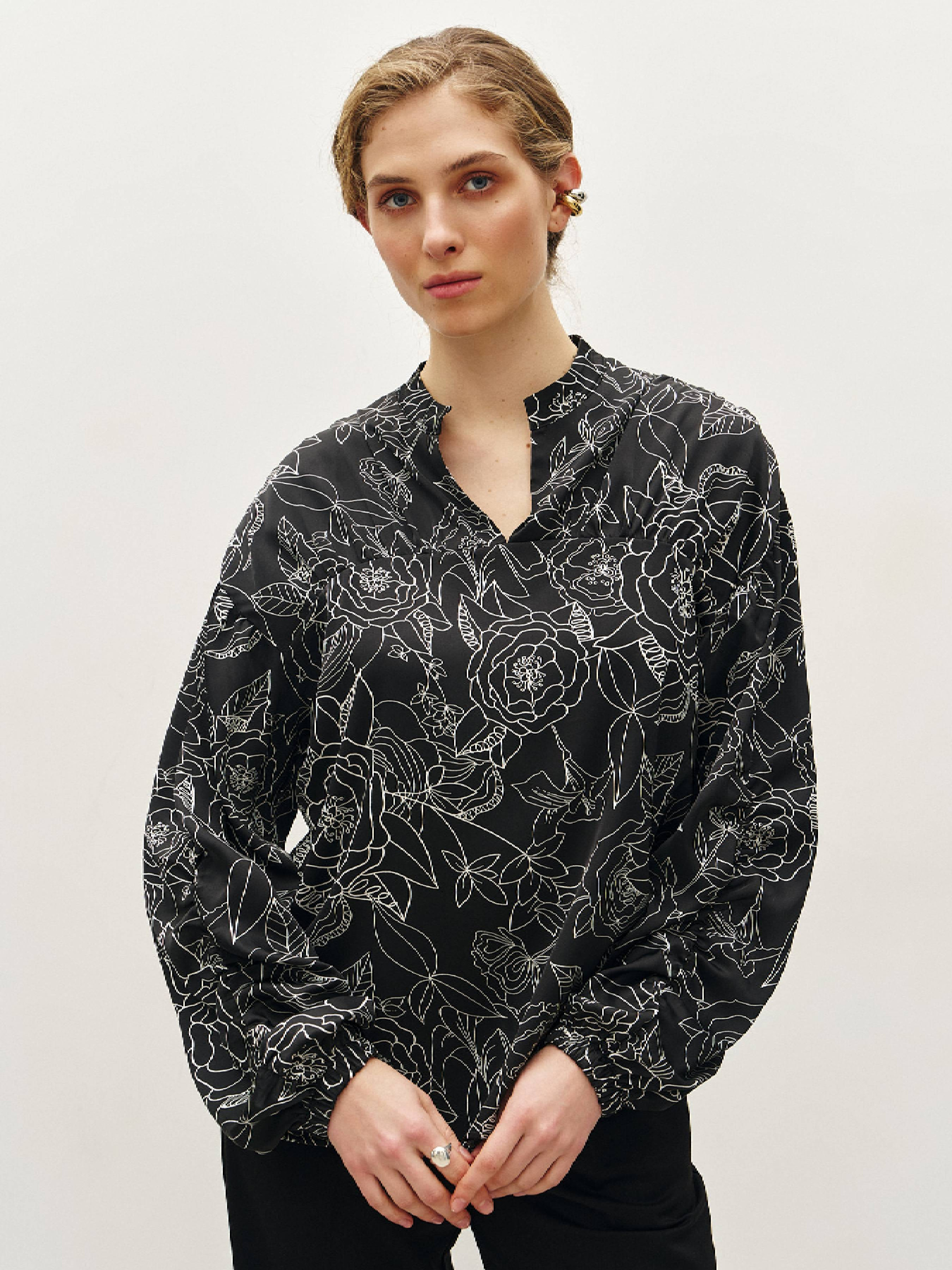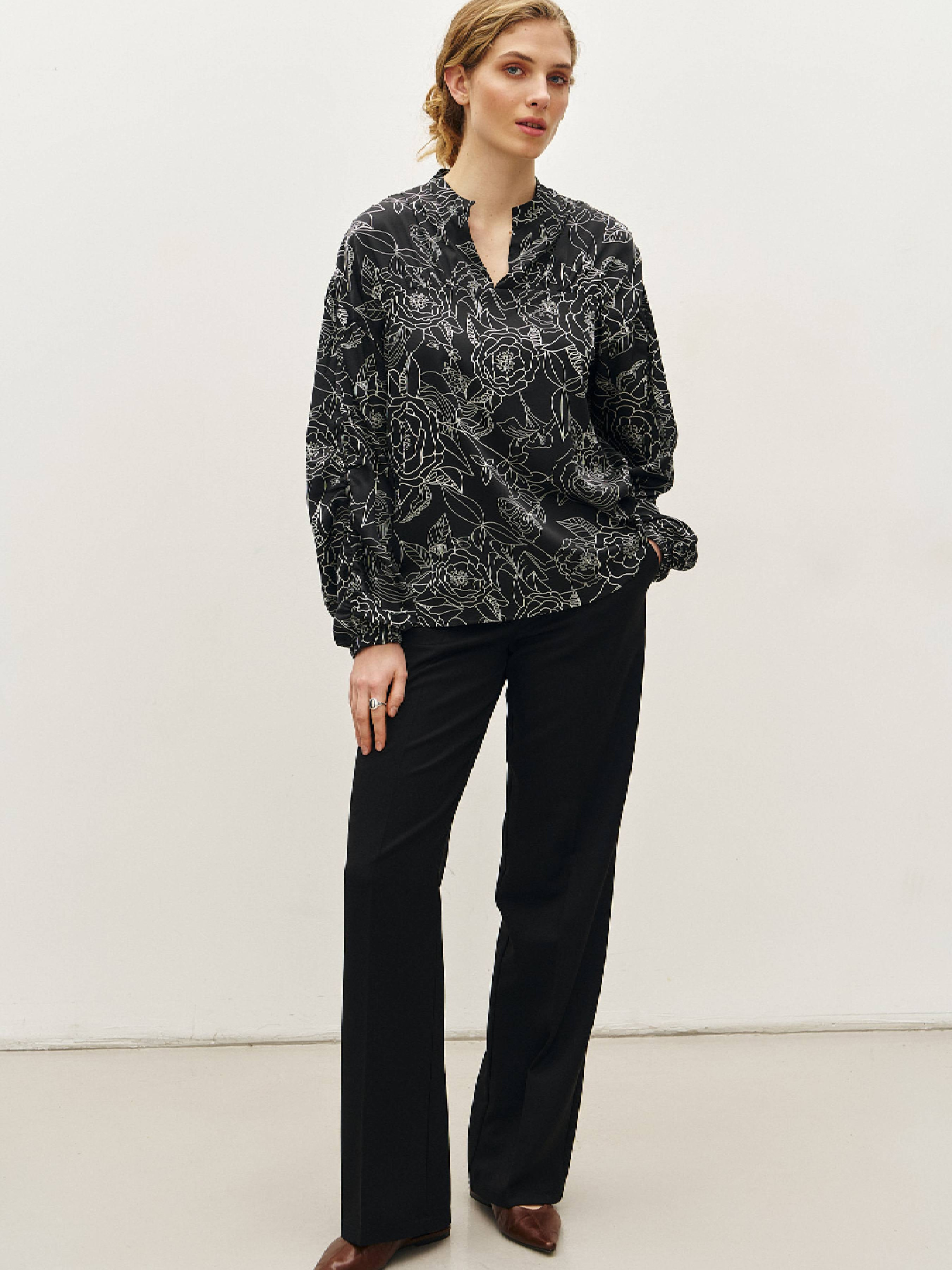Нежная и самобытная блузка имеет определенные особенности конструкции – рукав имеет вертикальный шов, задрапированный на две нижние трети, манжет на резинке, а драпировка повторяется на кокетке. За счет такого кроя блузка отлично смотрится на выпуск и в заправленном состоянии. Не случайно силуэт и эмоция этой блузы кажется знакомыми и новыми одновременно. Состав: полиэстер 55%, вискоза 40%, эластан 5%.