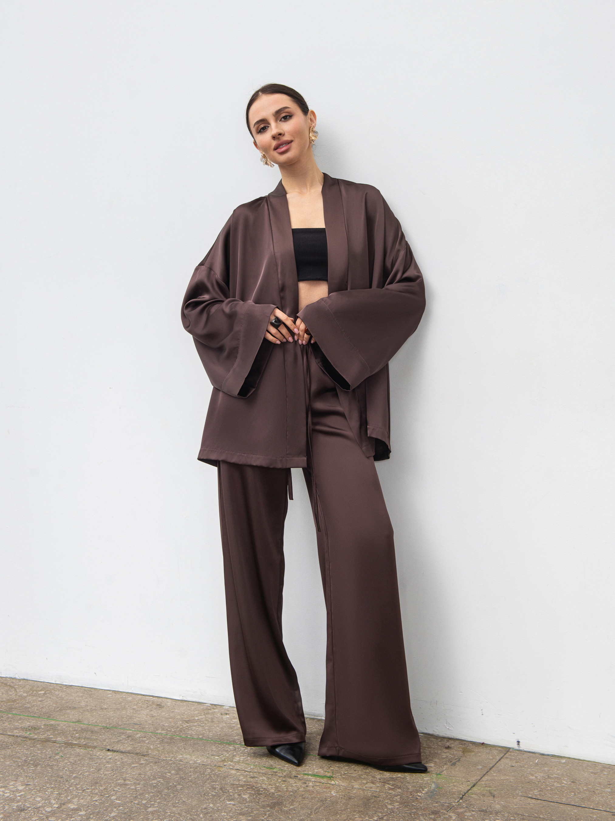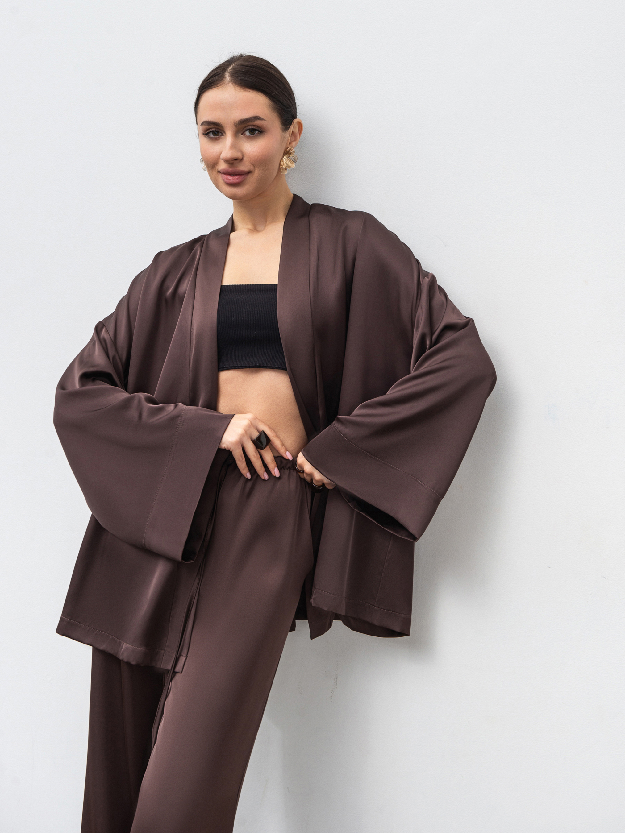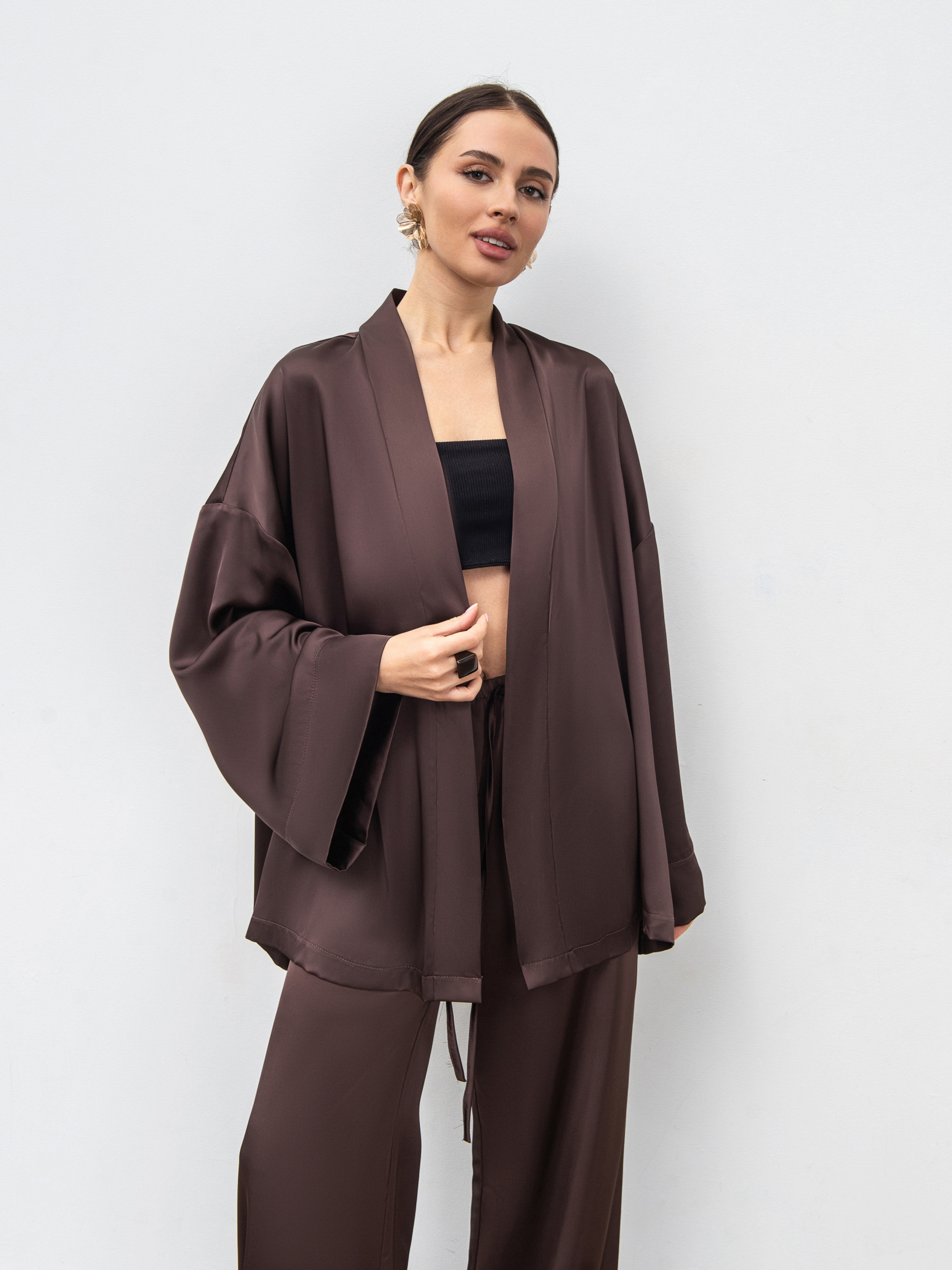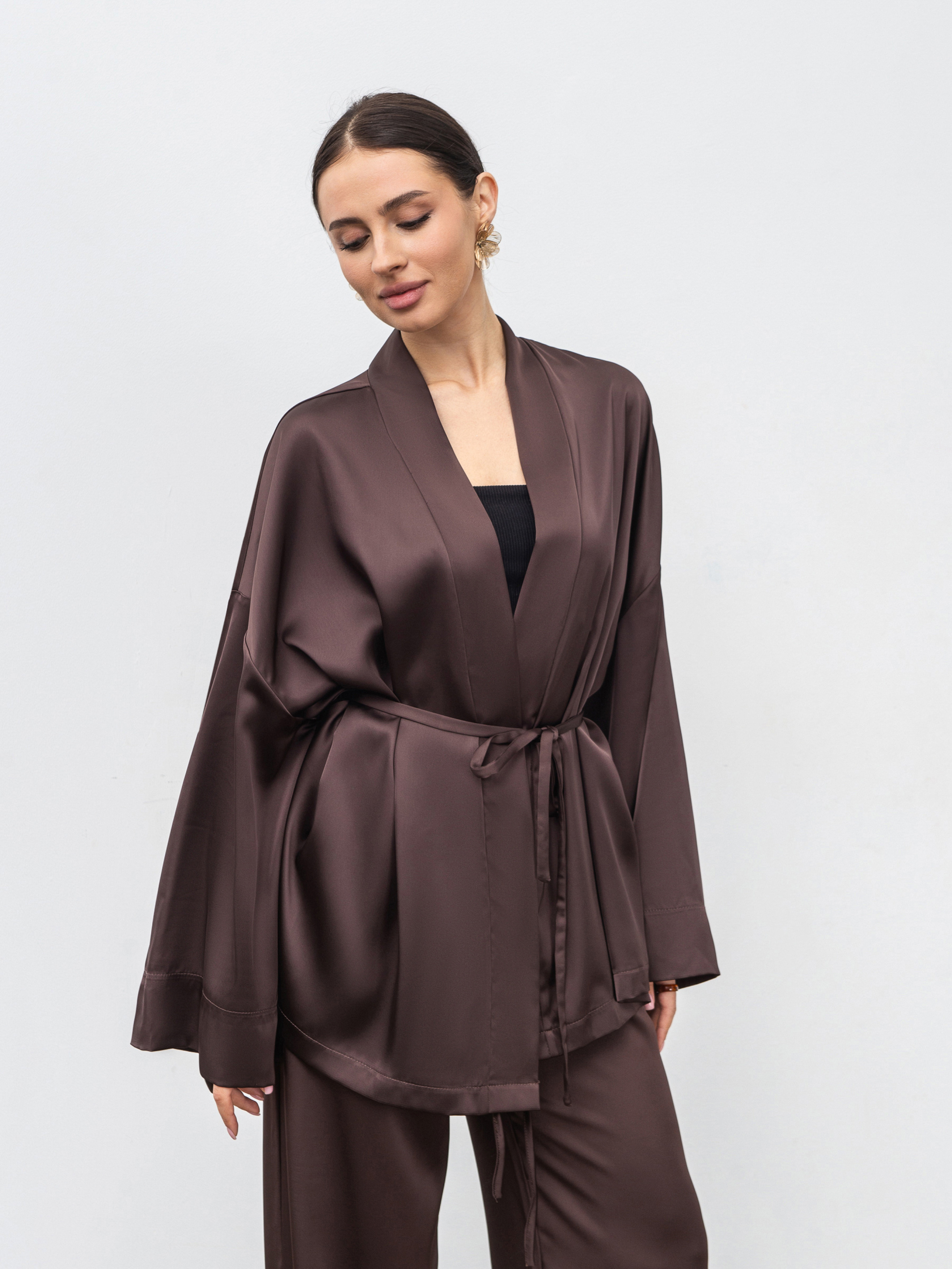 Укороченное кимоно из гладкого сатина - стильная и универсальная вещь для повседневных и вечерних образов. Изготовленное из проверенного материала (80% полиэстер, 20% вискоза), оно имеет мягкую шелковистую фактуру и деликатный блеск. Модель в свободном фасоне комплектуется длинным тонким ремешком-шнурком, который позволяет регулировать силуэт и создавать различные варианты посадки. Идеально сочетается с юбкой Сирена или брюками Пинка в оттенках шоколад или черный. Доступные цвета: шоколад, черный. Длина по спине: 75 см Длина рукава: 46 см Полуобхват груди: 67 см Полуобхват бедер: 70 см Плечи: 65 см Полуобхват талии: 68 см