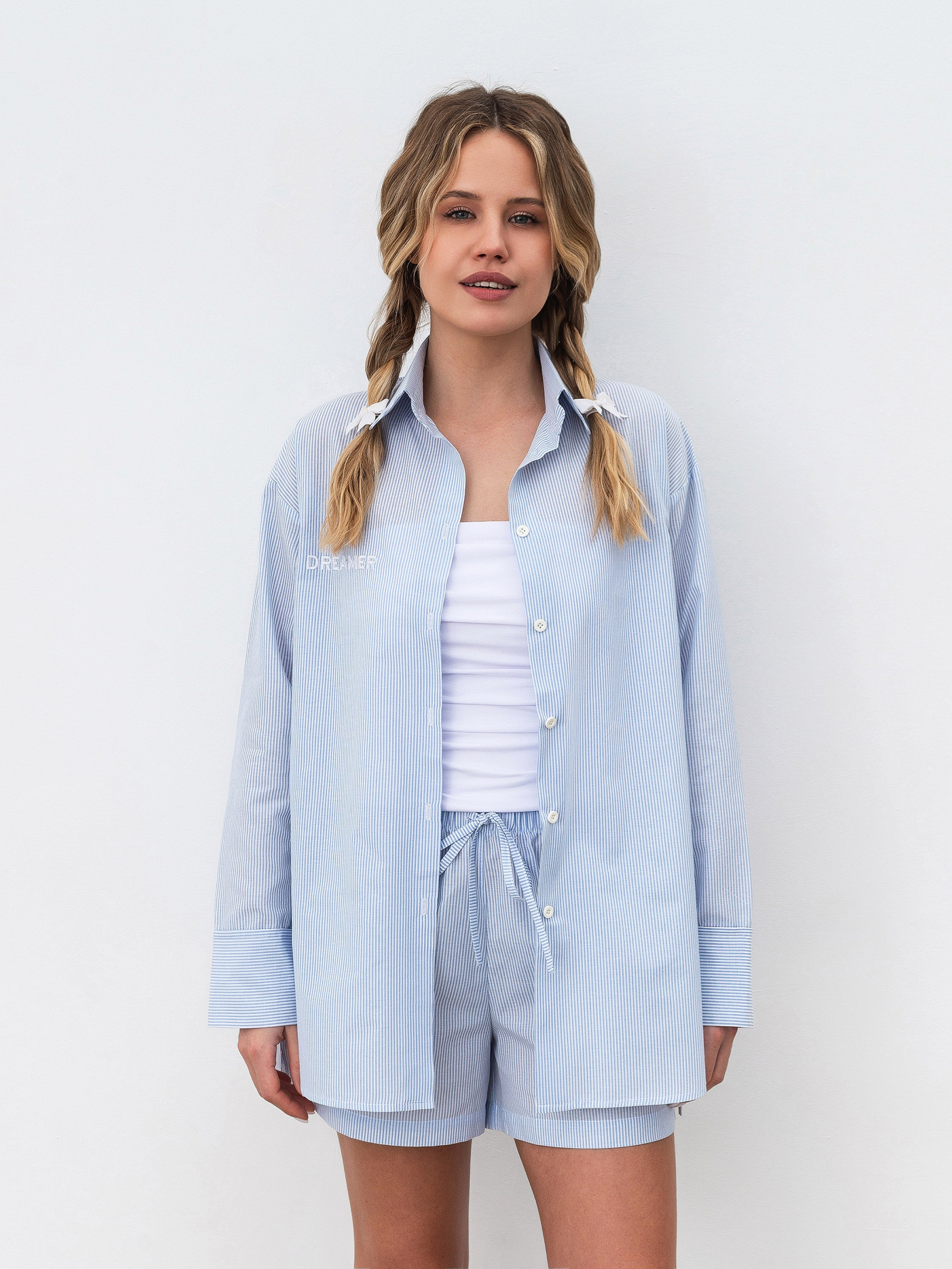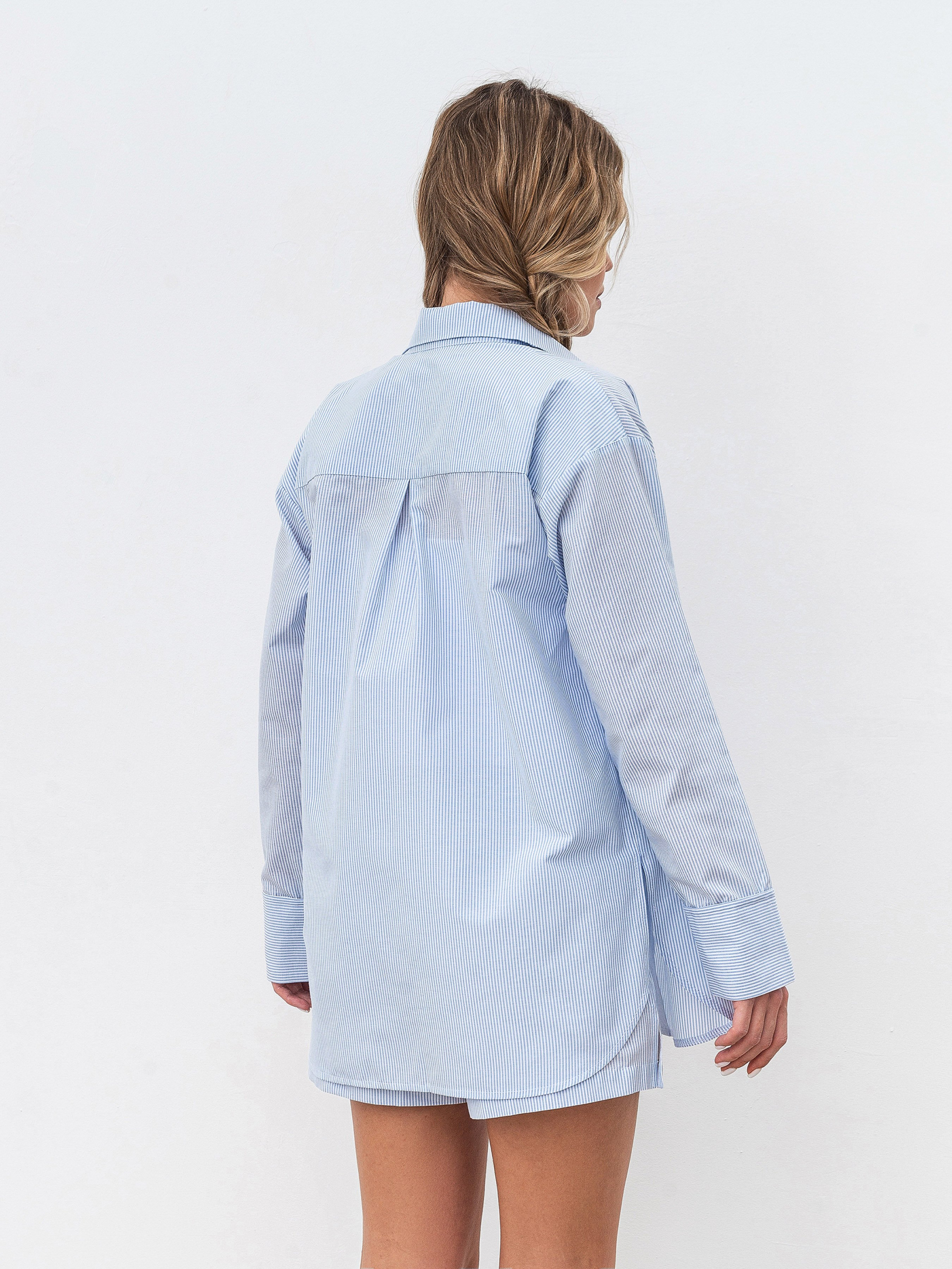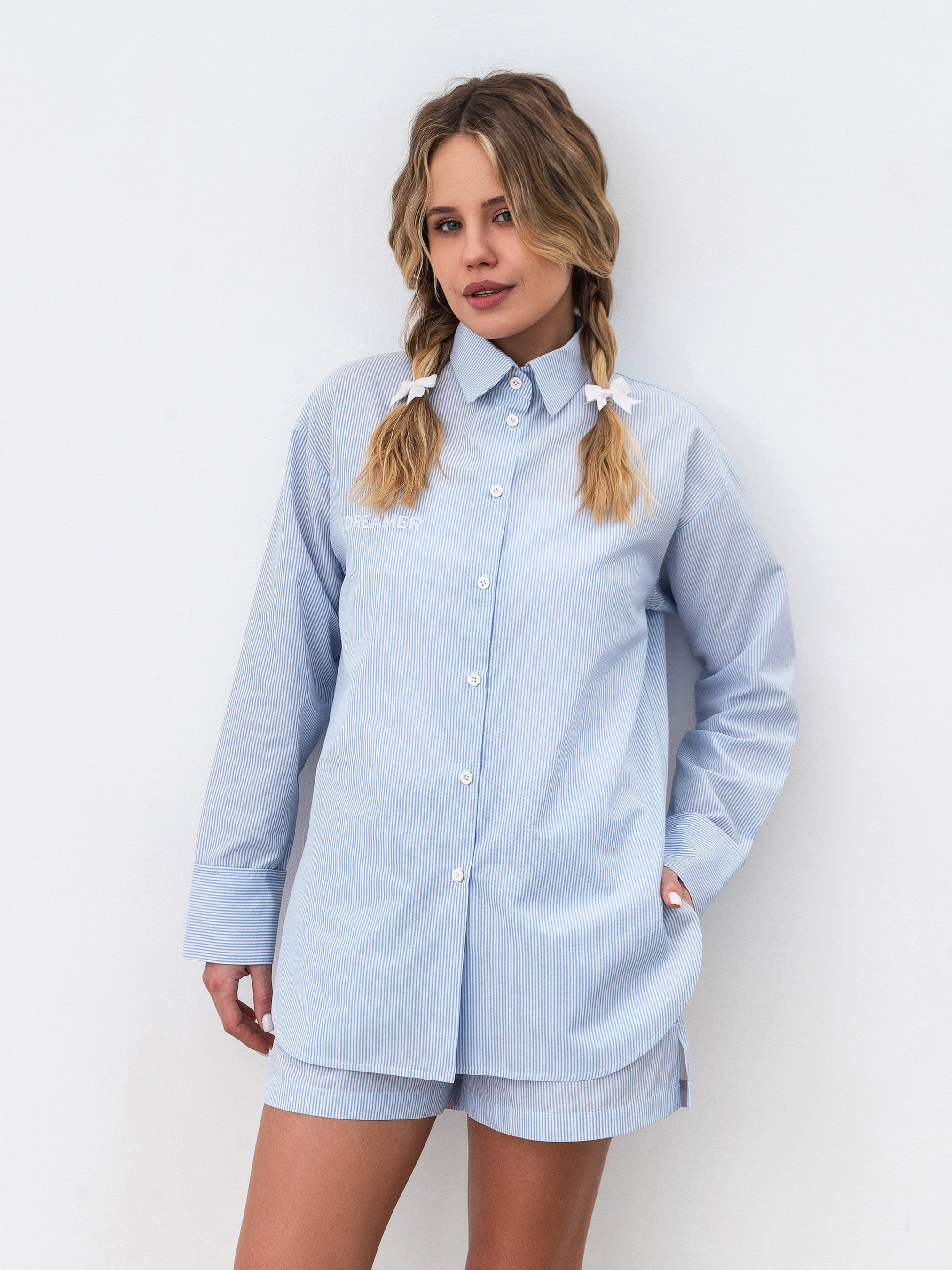 Рубашка свободного фасона в пижамном стиле. На манжетах есть вставки горизонтальной полоски. Модель имеет спущенный плечевой шов. Комфортный вариант как для ношения дома, так и на улицу - актуальный пижамный стиль. Материал: смешанный хлопок (50% хлопок, 50% полиэстер). Благодаря этому ткань имеет более долгую степень носки, однако комфортно ощущается на теле. Ткань имеет принт - полоску. Комбинировать можно с низом в этом же стиле (брюки "Рапар") или джинсами. Также стильное сочетание получится с однотонными джоггерами.