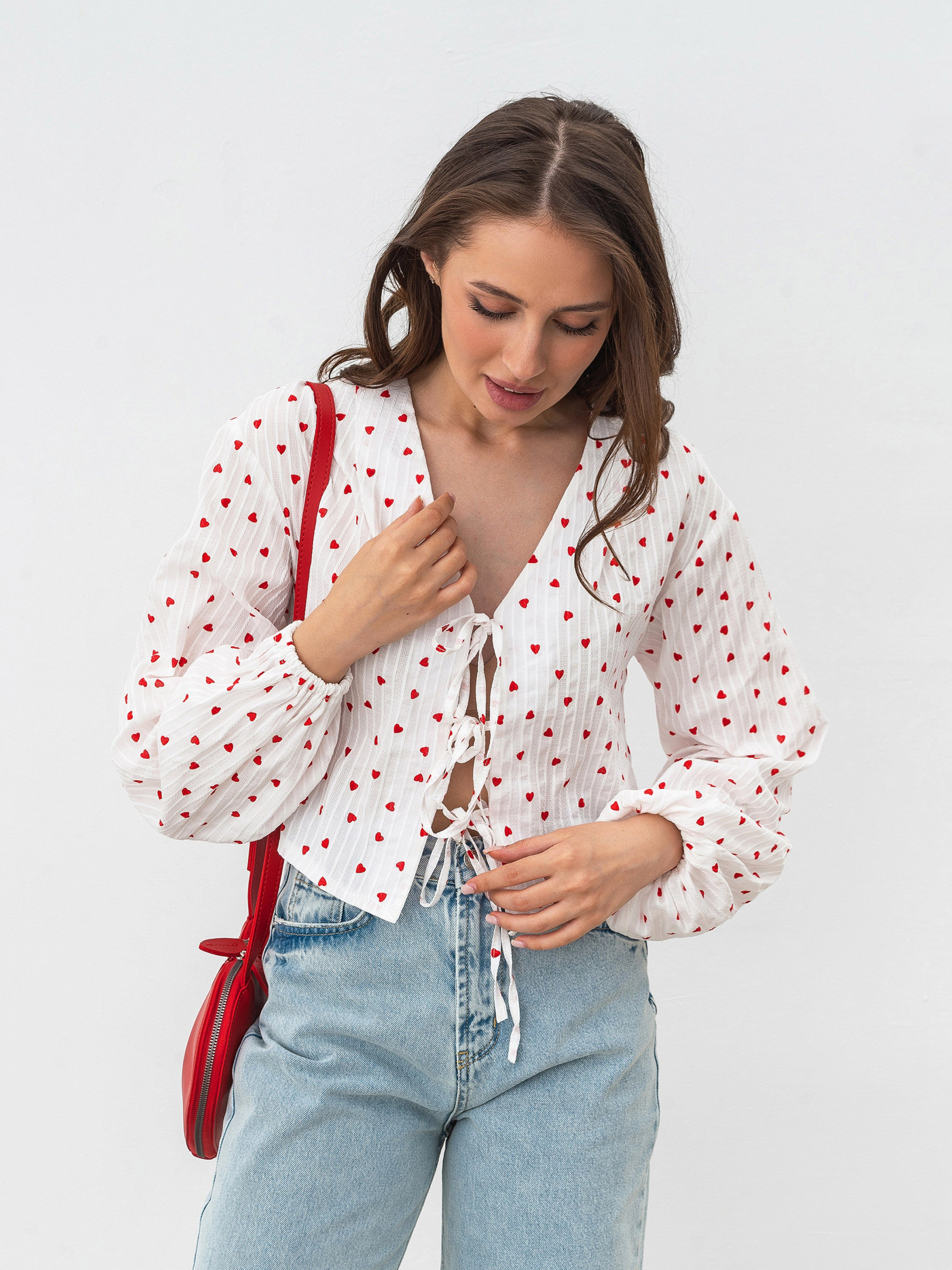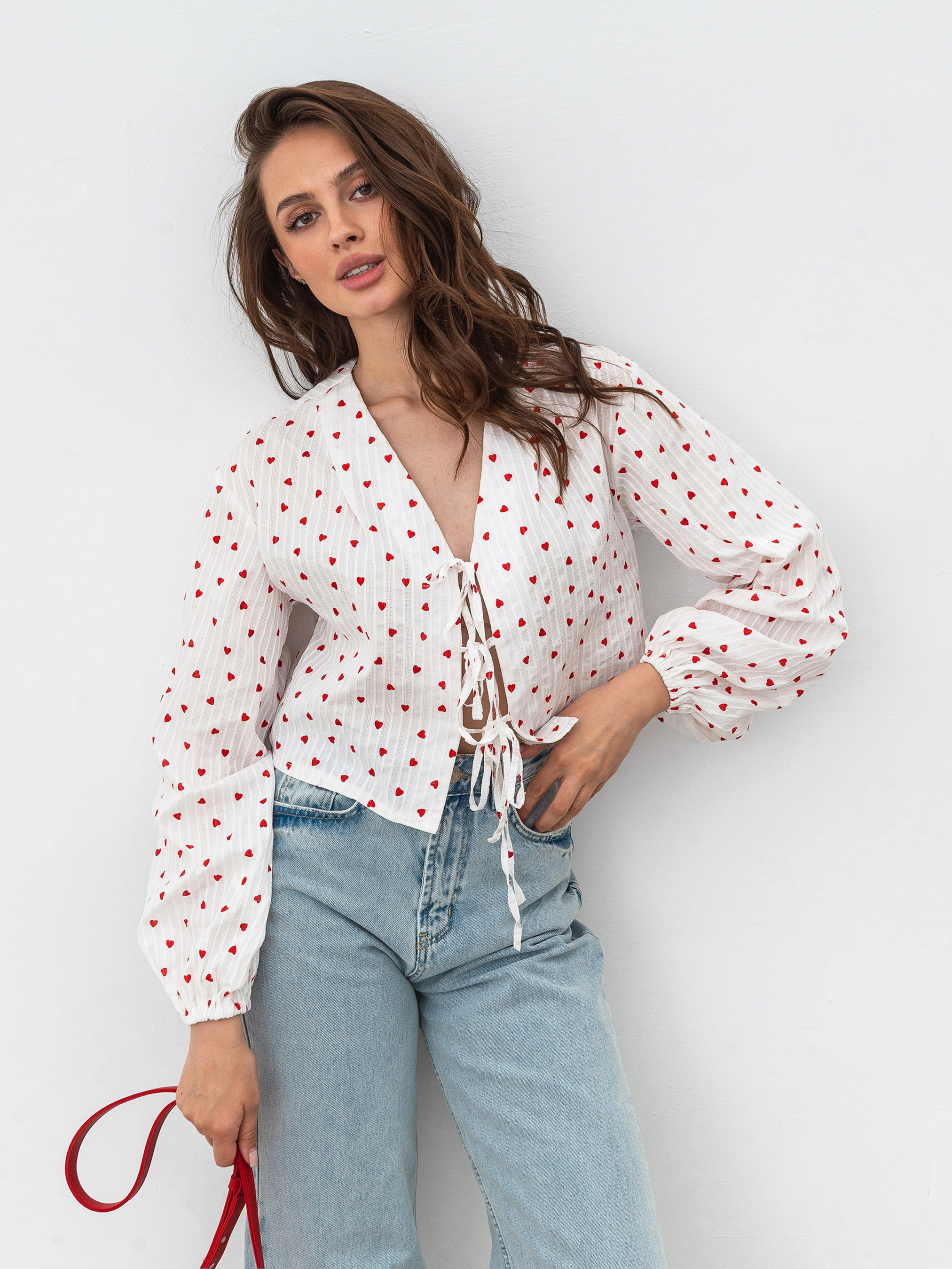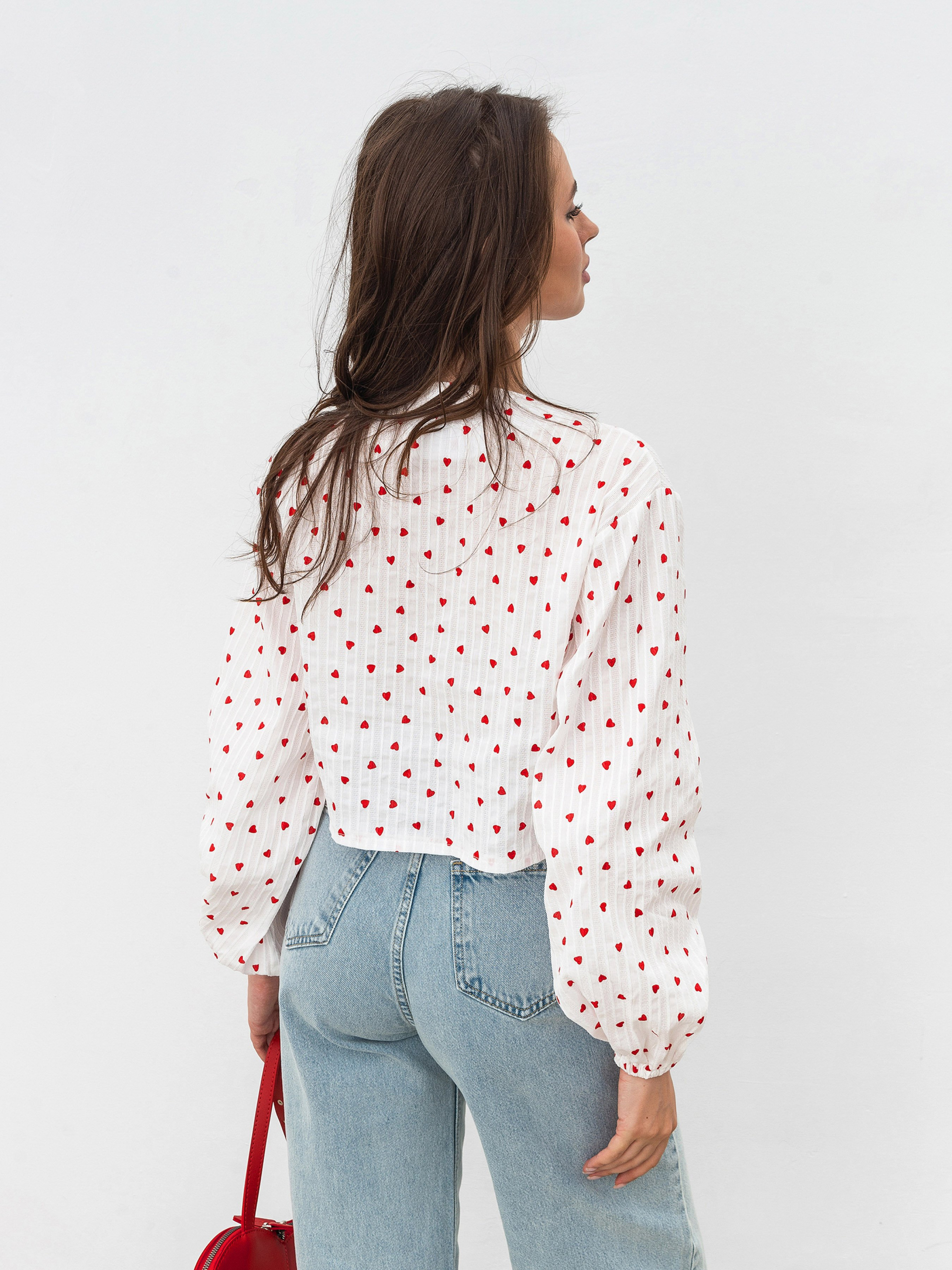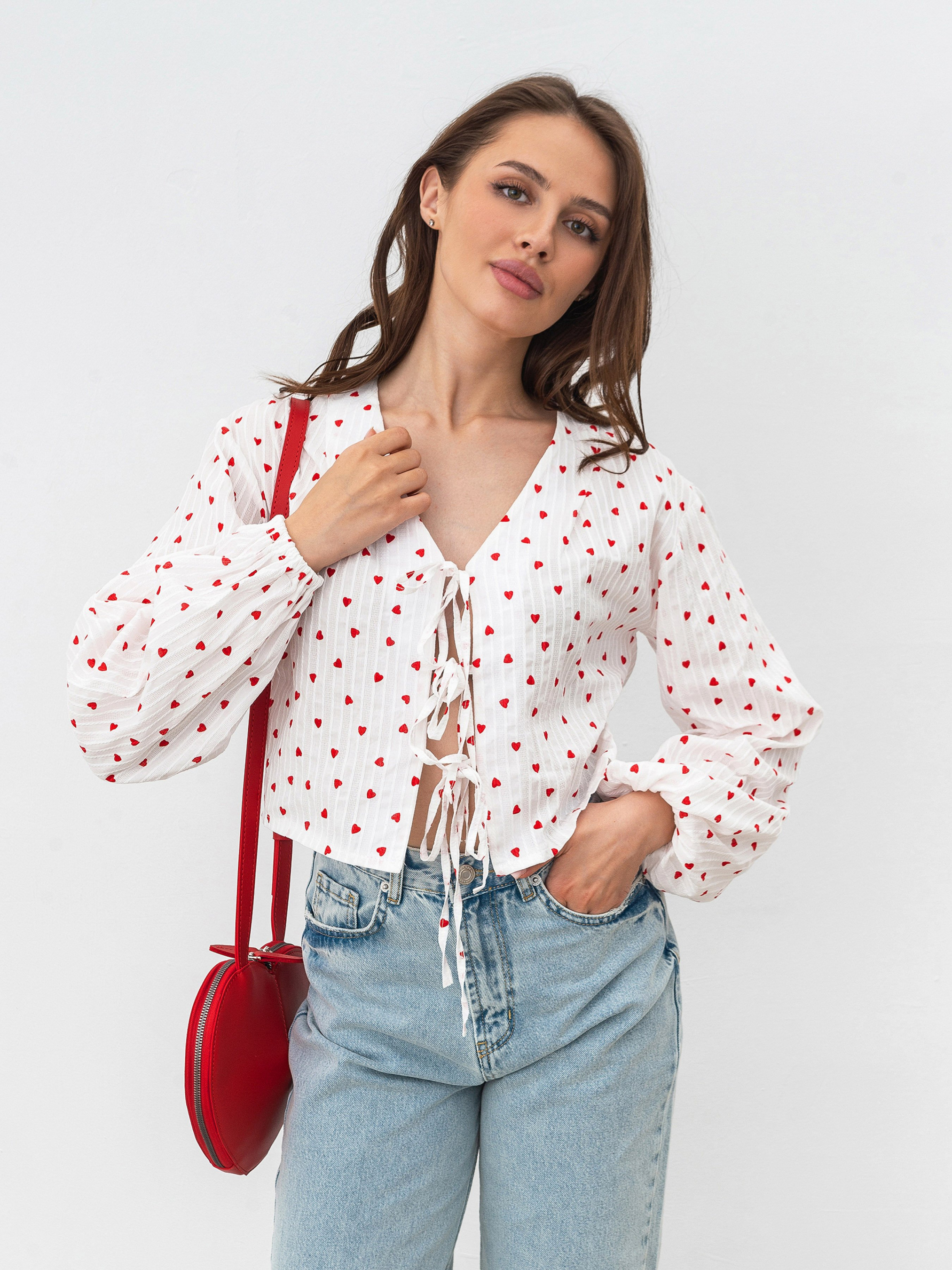 Рубашка в принт и с акцентными рукавами. Укороченная рубашка изготовлена из фактурного хлопка в принт "сердечки". Спереди есть завязки. Рукава свободного кроя и имеют манжеты на запястьях. Рубашка довольно объемная, поэтому советуем сочетать ее с более узким низом (джинсы, юбки). Также "Альварадо" лучше сочетать с однотонными другими элементами, чтобы не перегружать образ.