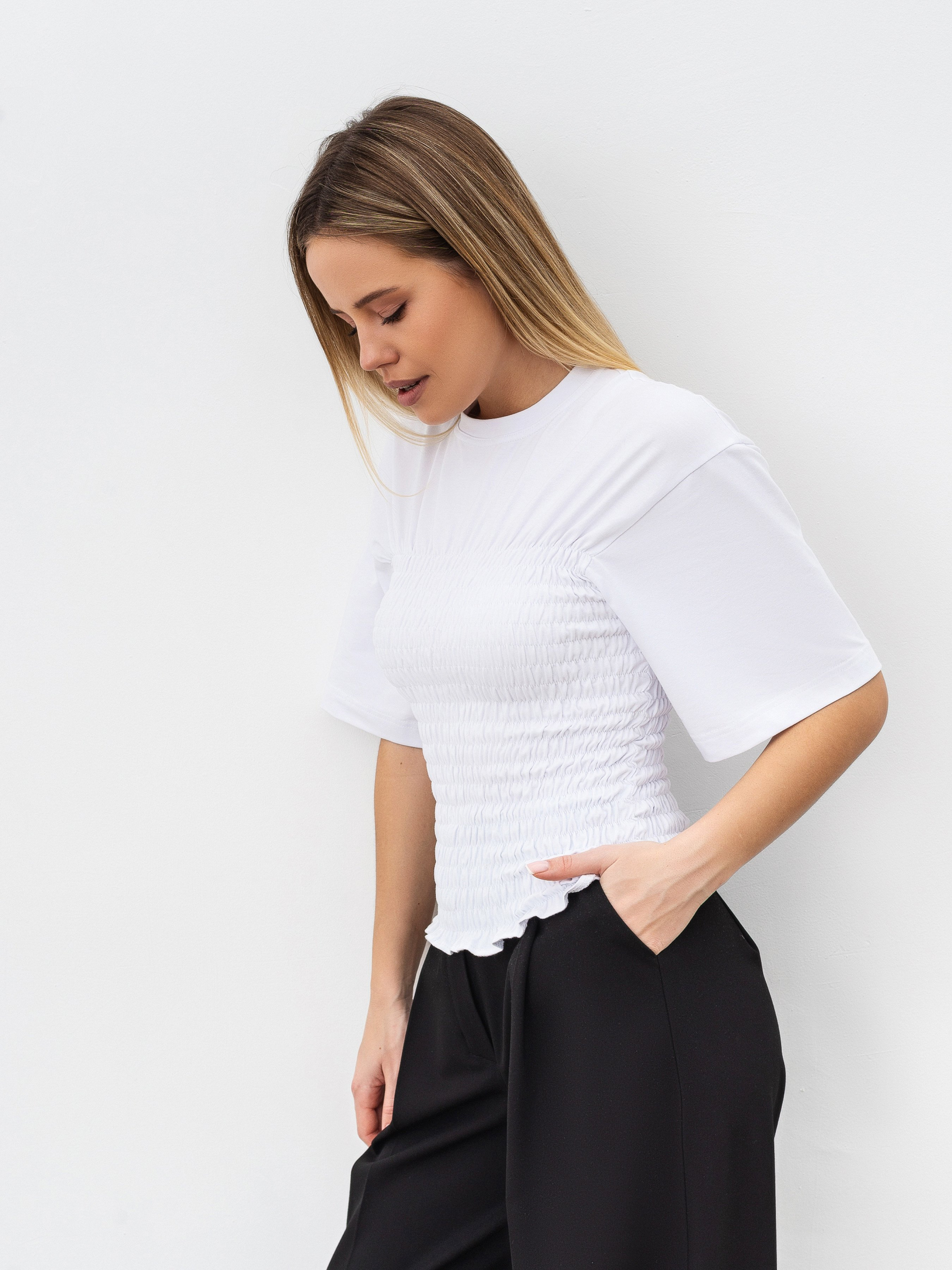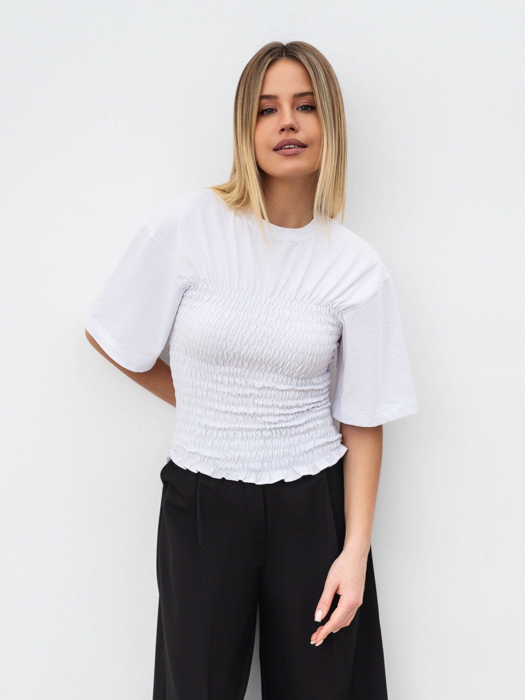 Футболка с акцентом в виде сборок на резинке в части туловища. Спущенная линия плеча. Изготовлена из качественного плотного хлопка с примесью эластана чтобы ткань тянулась. Состав 95% хлопок 5% эластан. Интересный, акцентный вариант верха для летнего сезона - минималистичный дизайн, натуральный материал, подходит ко всем вещам в гардеробе. Рекомендуем сочетать с джинсами или другими вариантами низа. Смотри больше моделей в категории "Майки и футболки". ONE SIZE:- Длина по спине : 52 см; Длина рукава : 24 см; Полуобхват груди : 32 см (резинка); Ширина плеч : 46 см.