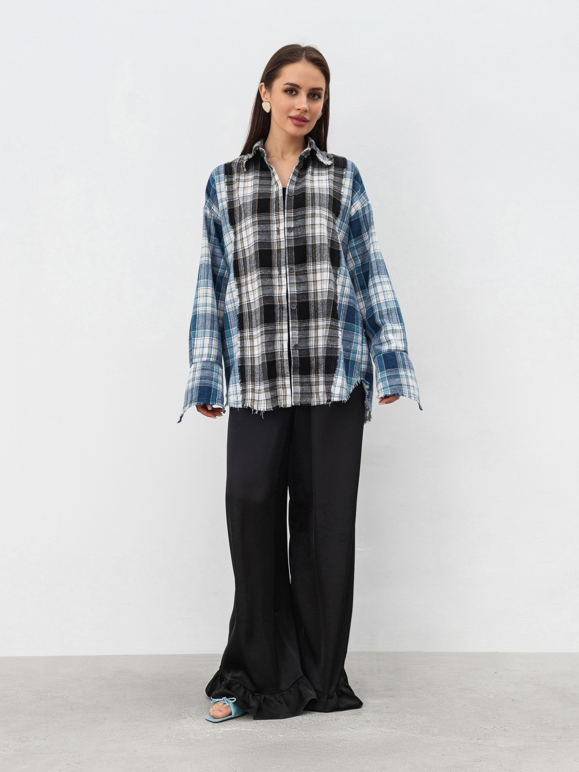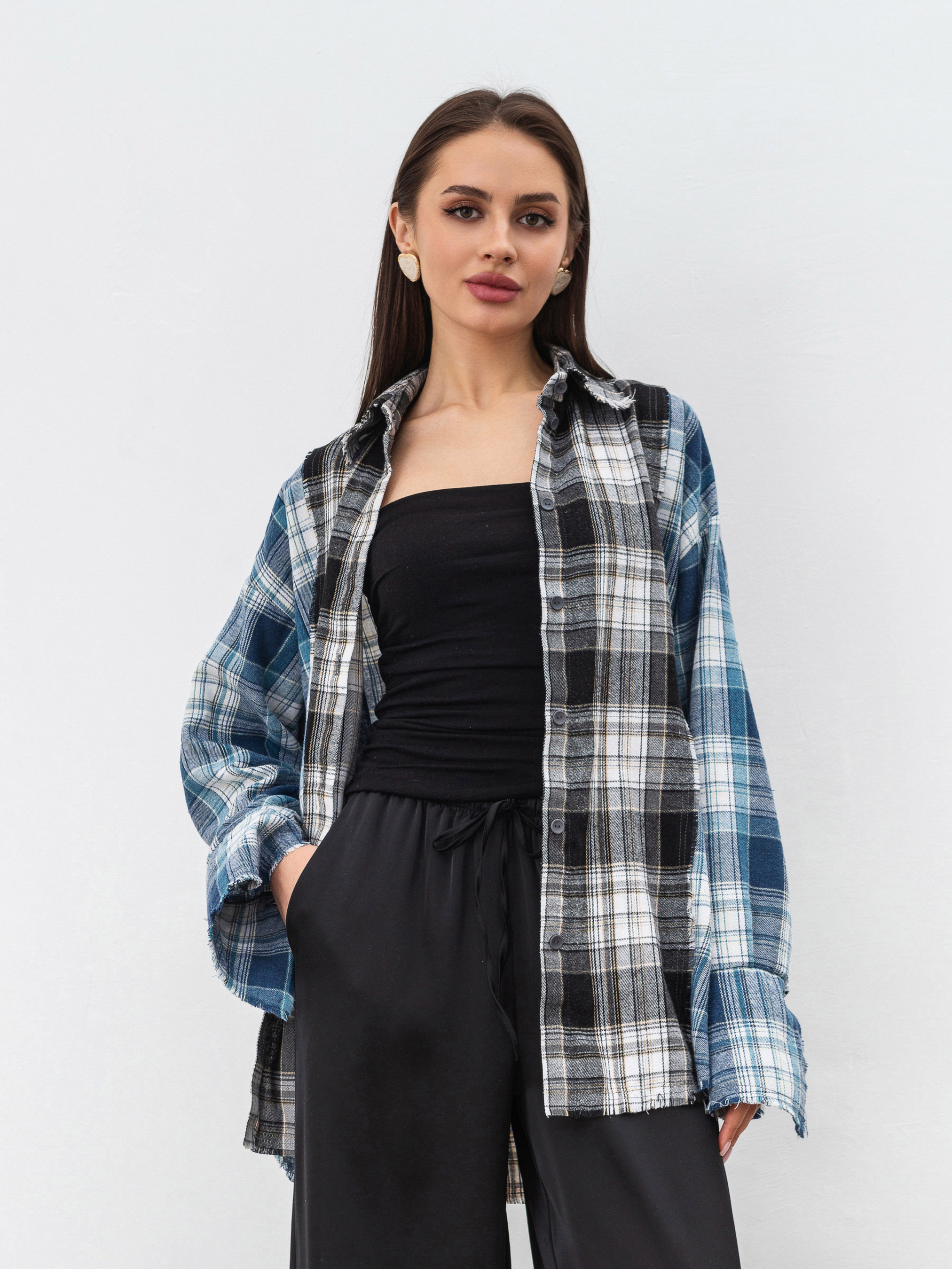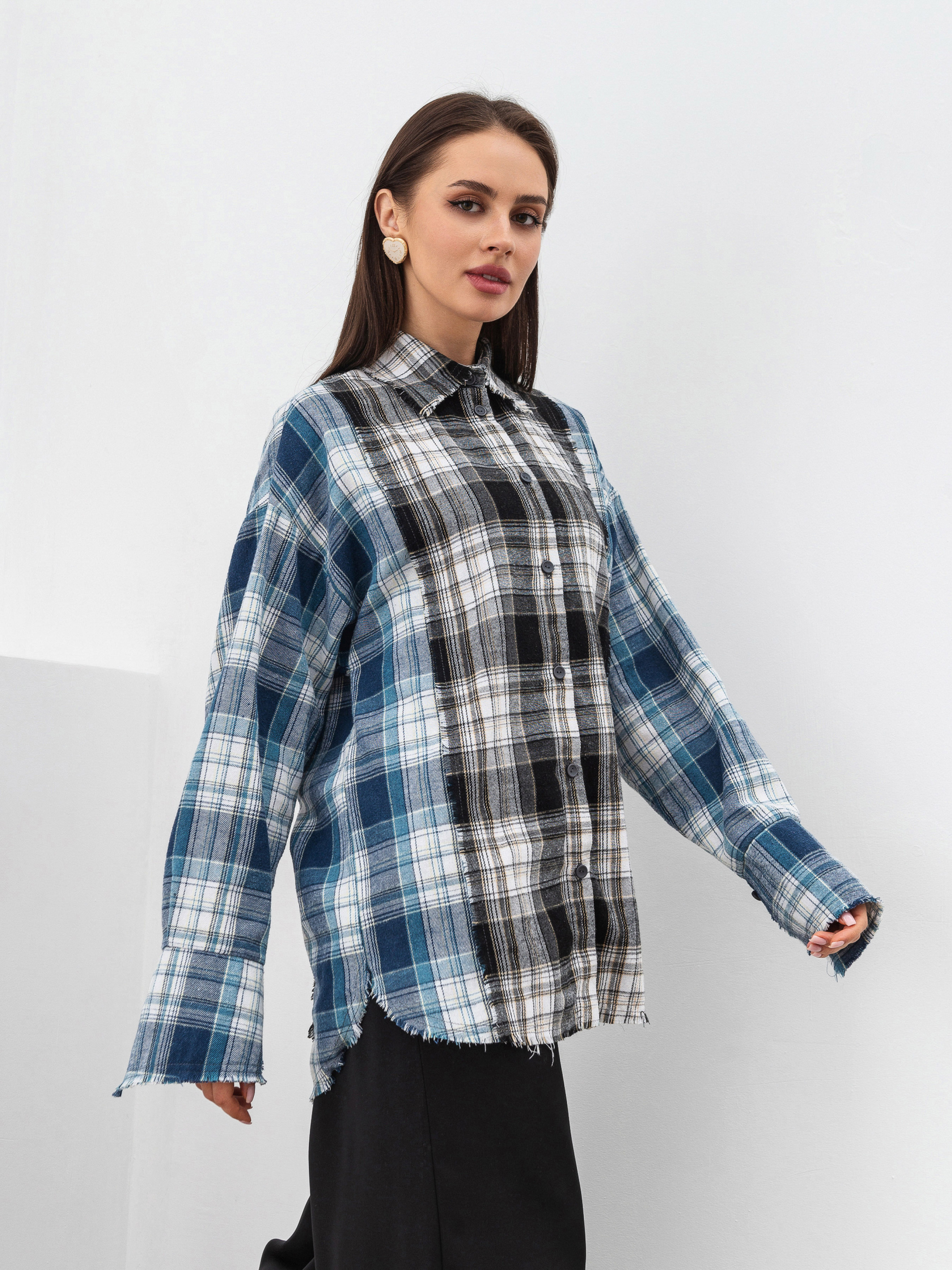Рубашка из комбинирований байки. Свободный фасон с легка удлиненнымы манжетами. Края неотработанны. Идеально впишется в образ с косухой и джинсами. ХС-С Длина по спине: 73 см Длина рукава: 55 см Полуобхват груди: 51 см Плечи: 51 см Полуобхват талии: 50 см С-М Длина по спине: 74 см Длина рукава: 55 см Полуобхват груди: 52 см Плечи: 53 см Полуобхват талии: 51 см М-Л Длина по спине: 74 см Длина рукава: 56 см Полуобхват груди: 56 см Плечи: 58 см Полуобхват талии: 54 см