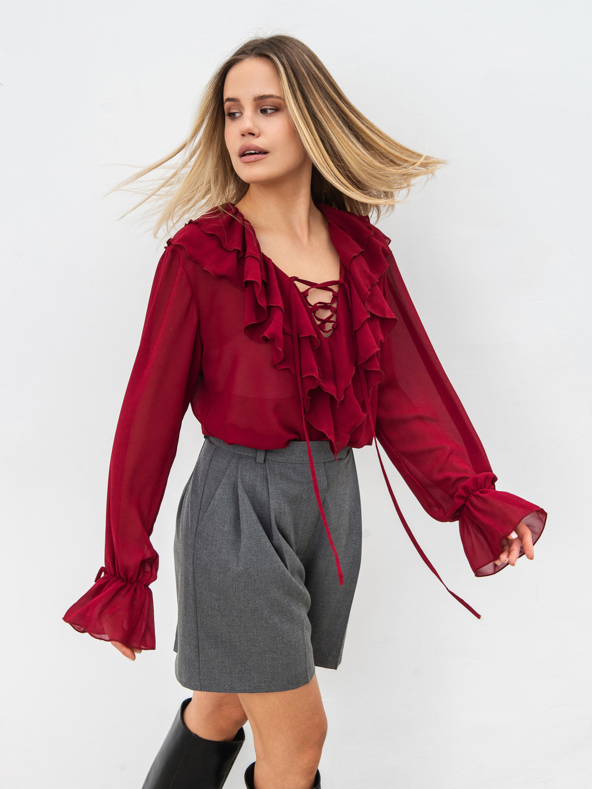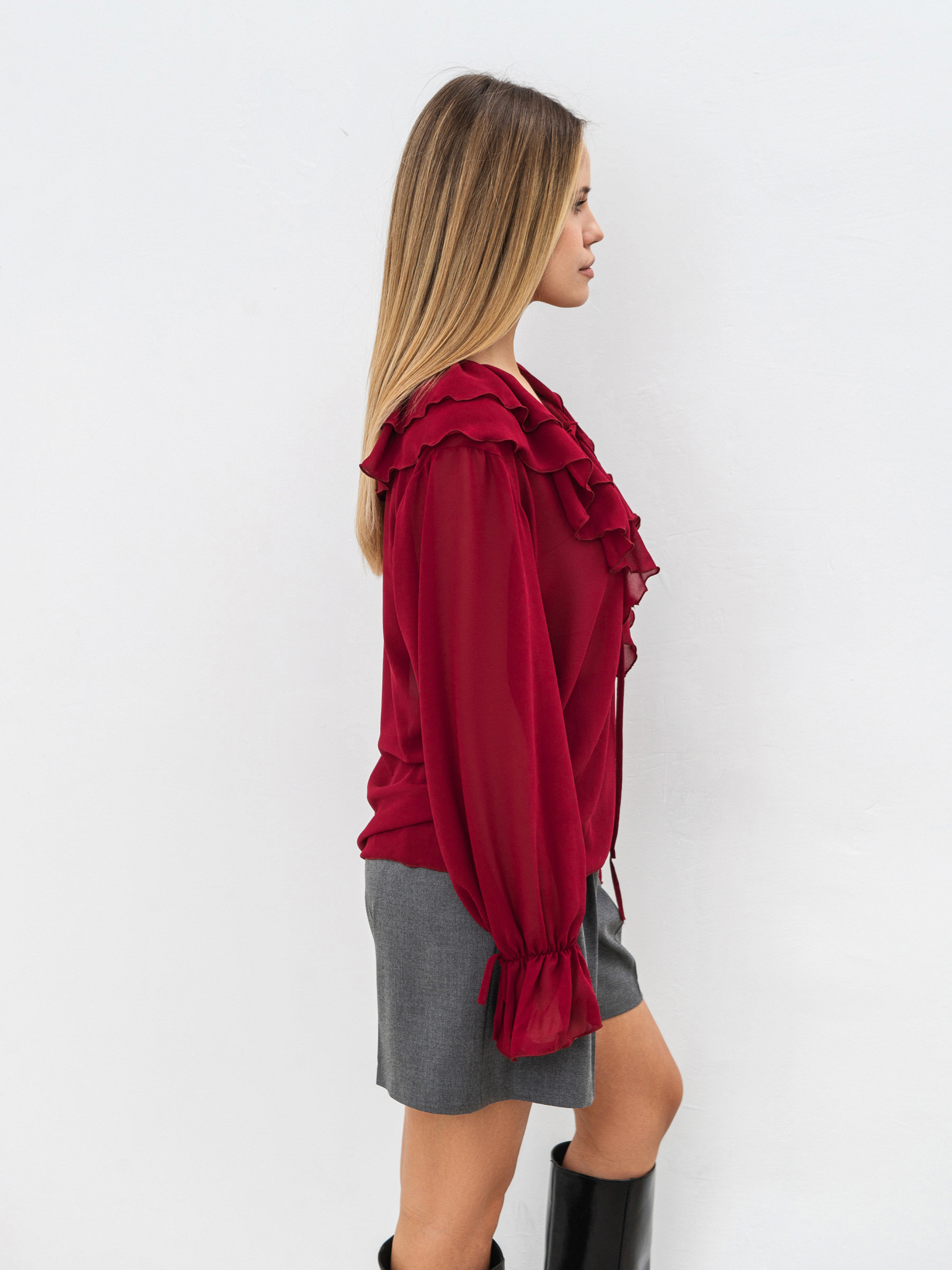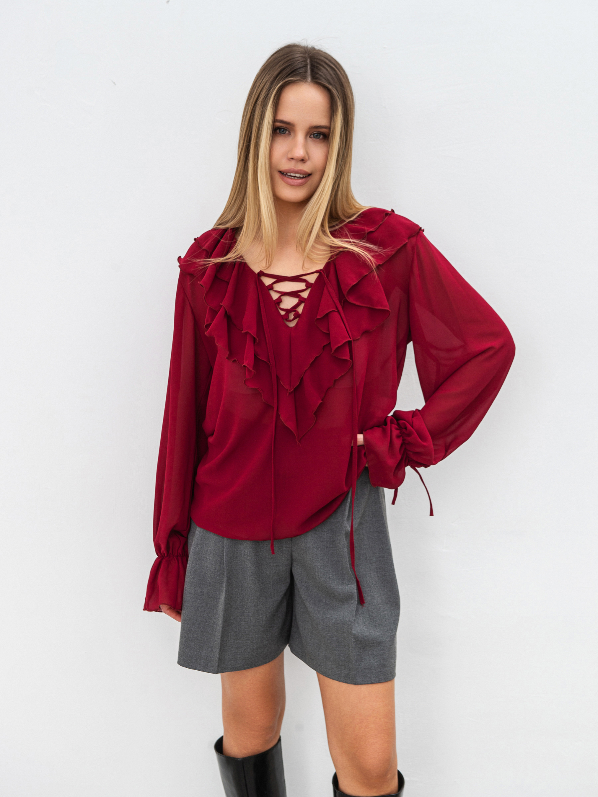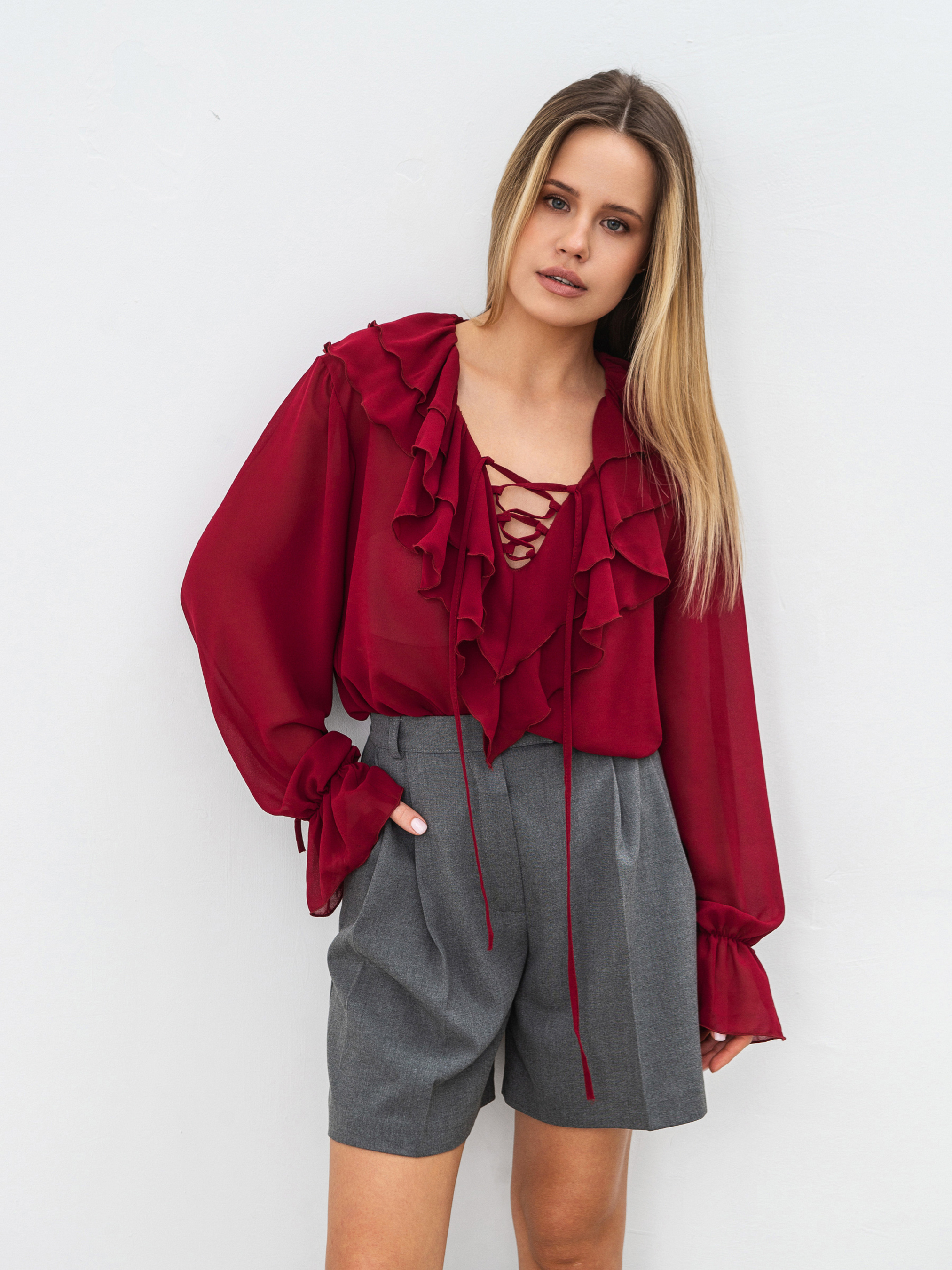 Эта шифоновая блуза создана для утонченных и стильных образов. Легкая ткань дарит комфорт, а игривые детали добавляют элегантности. Особенность модели - V-образный вырез, декорированный двумя ярусами рюшей, которые придают выразительности и легкости. Дополнительный акцент - завязки, которые можно завязать в бант или оставить свободно спускаться. Длинные рукава на резинке обеспечивают удобство, а декоративная завязка добавляет женственности. Материал - нежный, струящийся шифон (100% полиэстер), создающий эффект легкости. Блуза прекрасно сочетается с различными стилями - от делового до романтического. Это универсальная вещь, которая дополнит как дневной, так и вечерний образ. У данной модели завязки длиной такие же, как у модели в черном и молочном цветах.