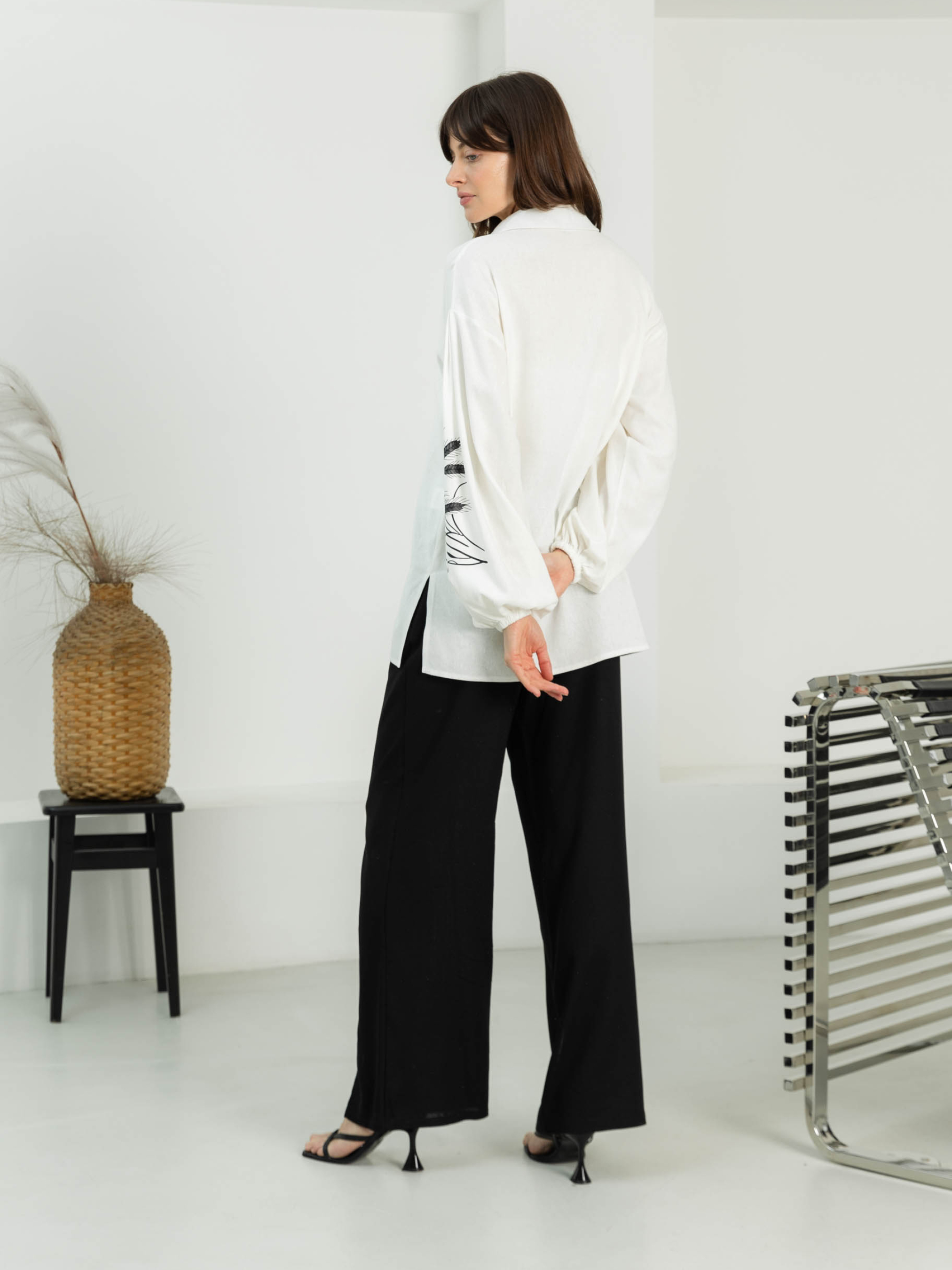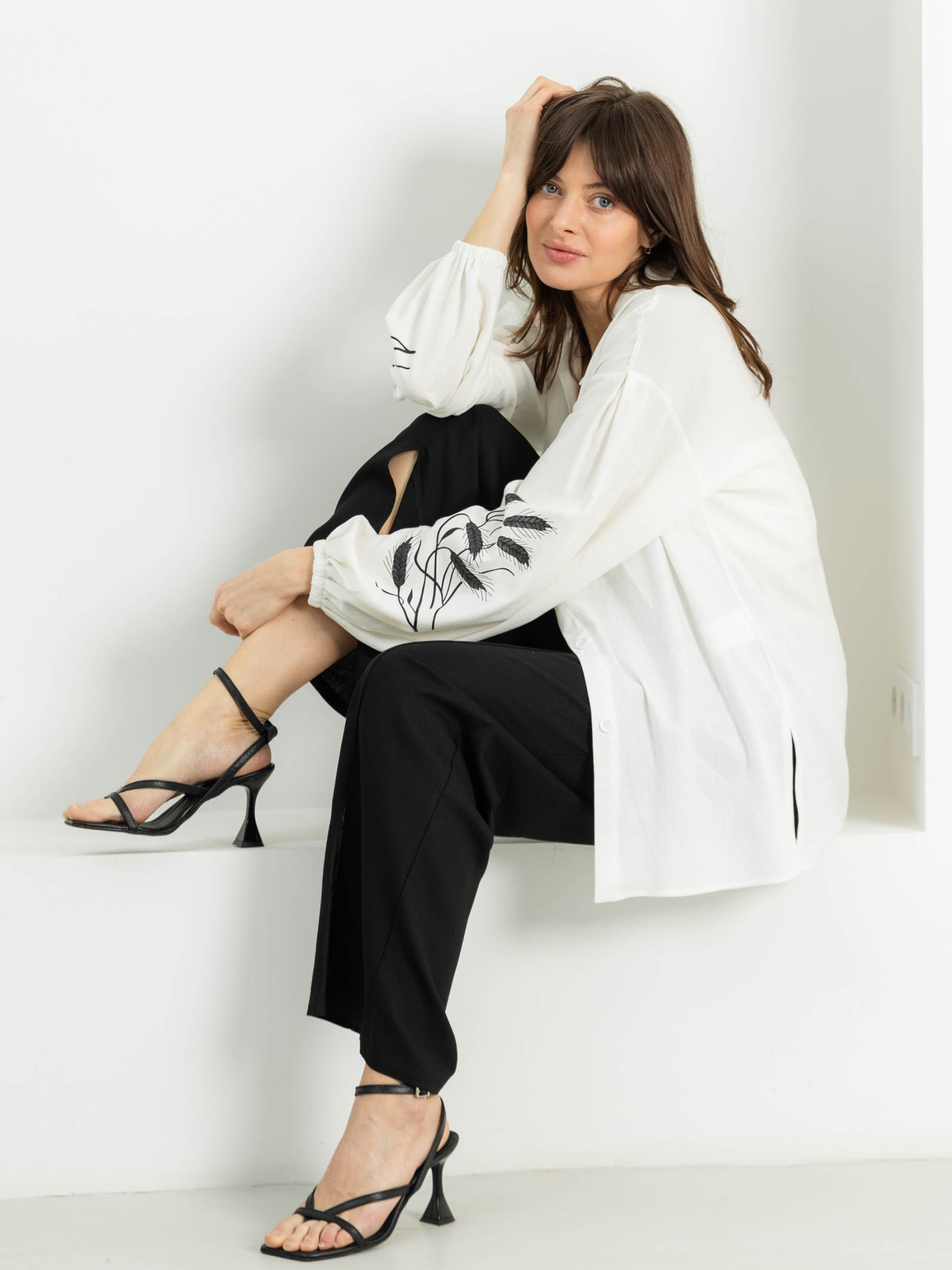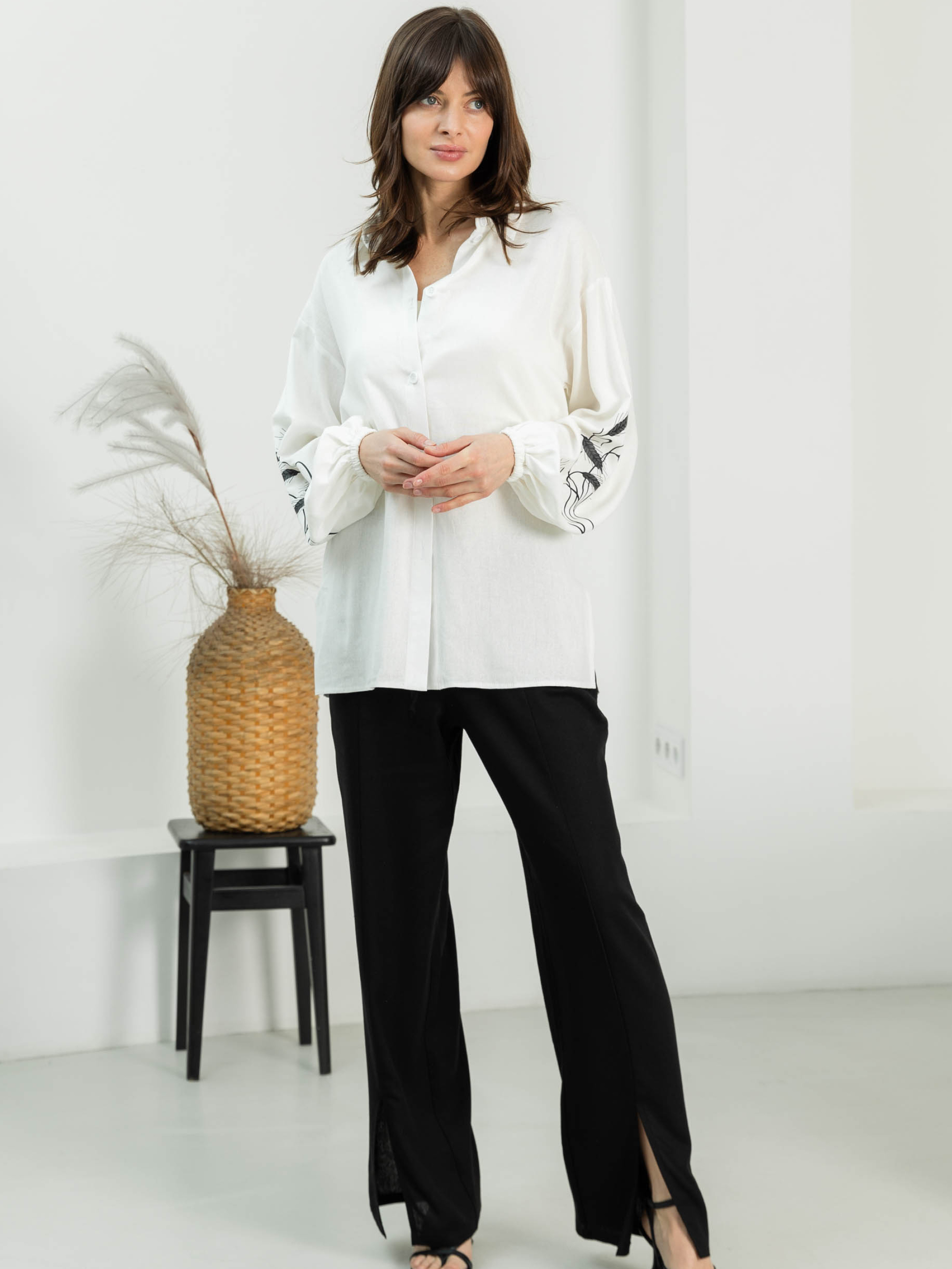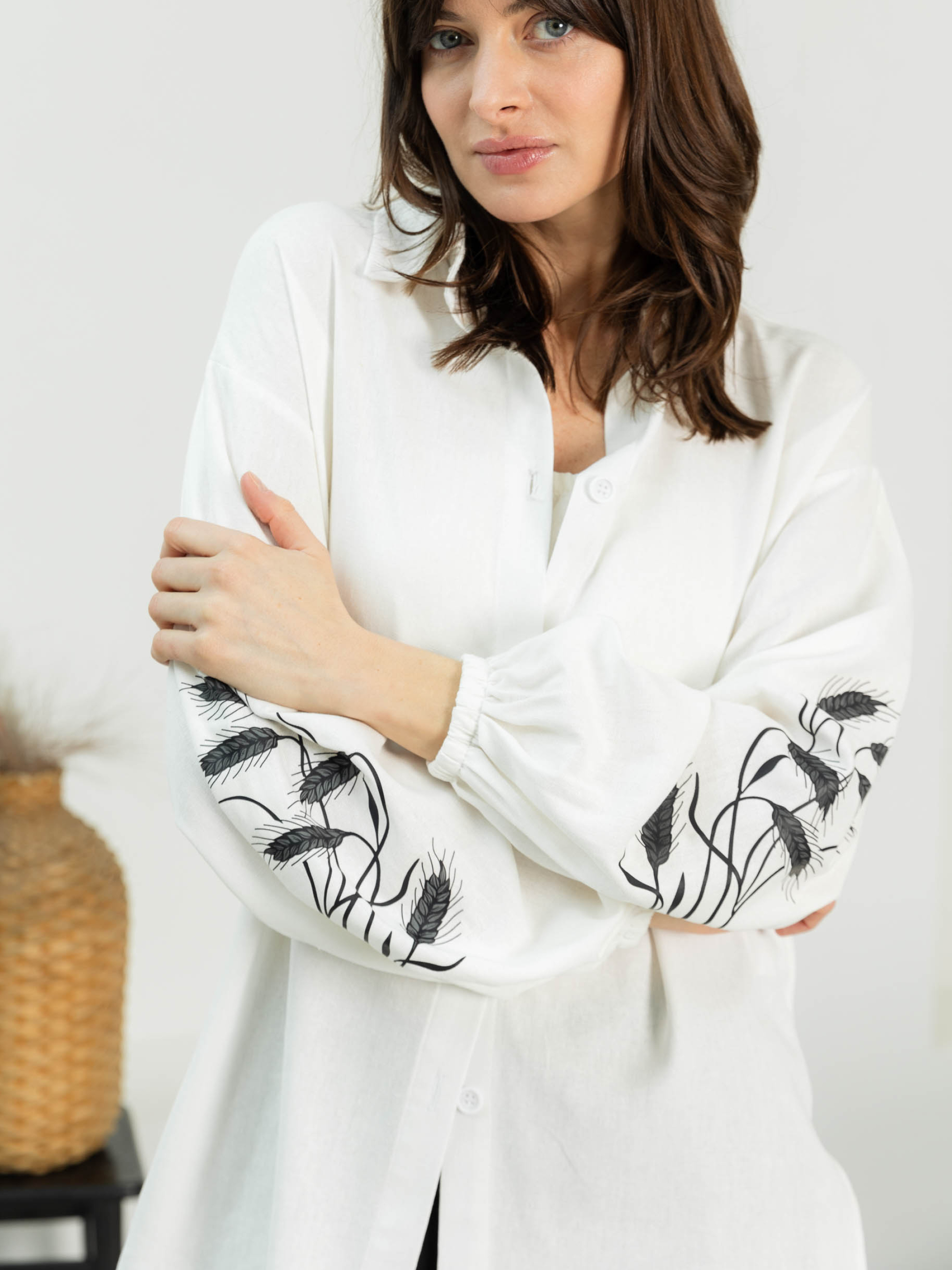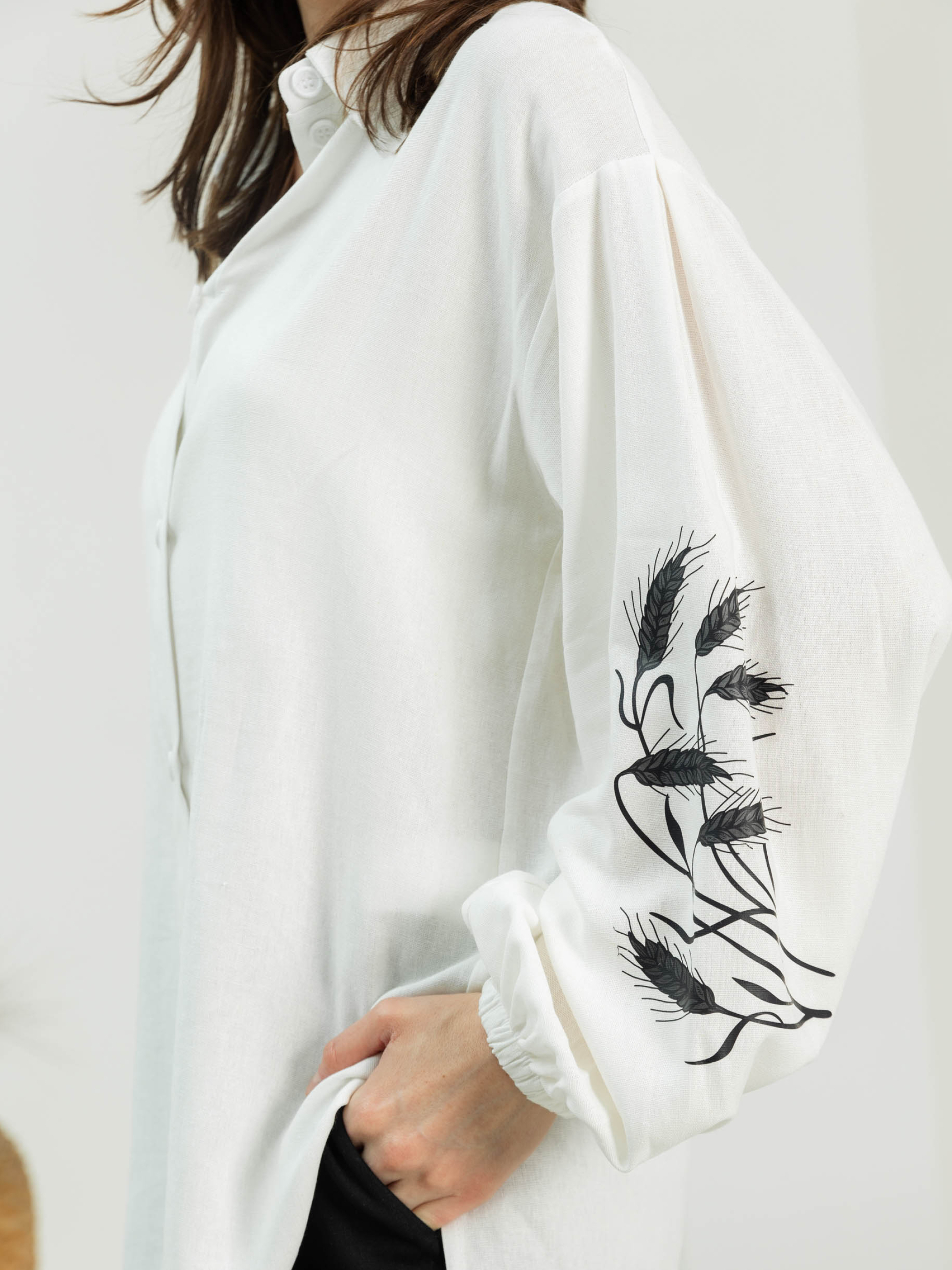 Женская рубашка с вышивкой Фасон Рубашка свободного прямого силуэта с лёгким намёком на oversize — идеальный варіант для непринуждённого, но стильного образа. Отложной воротник добавляет структурности, а удлинённая спинка формирует утончённую линию фигуры и гармонично сочетается с любым низом — от шорт до брюк с высокой посадкой. Материал Натуральный лён — дышащая ткань, которая дарит ощущение свежести даже в жаркий день. Матовый блеск и текстура жатки подчёркивают природную эстетику. Лён практичен и неприхотлив в уходе, со временем становится только мягче. Детали дизайна Рукава на резинке создают лёгкий объём, а небольшие боковые разрезы обеспечивают свободу движений. Особое внимание привлекает вышивка в форме колосьев — деликатный намёк на вдохновение природой. Она придаёт изделию выразительность, не нарушая общей сдержанной стилистики. Размерная сетка Модель представлена в трёх комбинированных размерах: S–M: обхват груди — 84–88 см; обхват талии — 68–72 см; длина изделия — 76 см; рукав — 54 см L–XL: обхват груди — 92–96 см; обхват талии — 76–81 см; длина — 78 см; рукав — 54 см XXL–3XL: обхват груди — 100–105 см; обхват талии — 86–91 см; длина — 79 см; рукав — 54 см Рубашка имеет свободную посадку и легко адаптируется под разные типы фигуры. Уход Деликатная стирка при температуре до 30 °C без интенсивного отжима. Сушить в расправленном виде. Гладить с отпариванием при среднем температурном режиме — это поможет сохранить природную фактуру ткани.