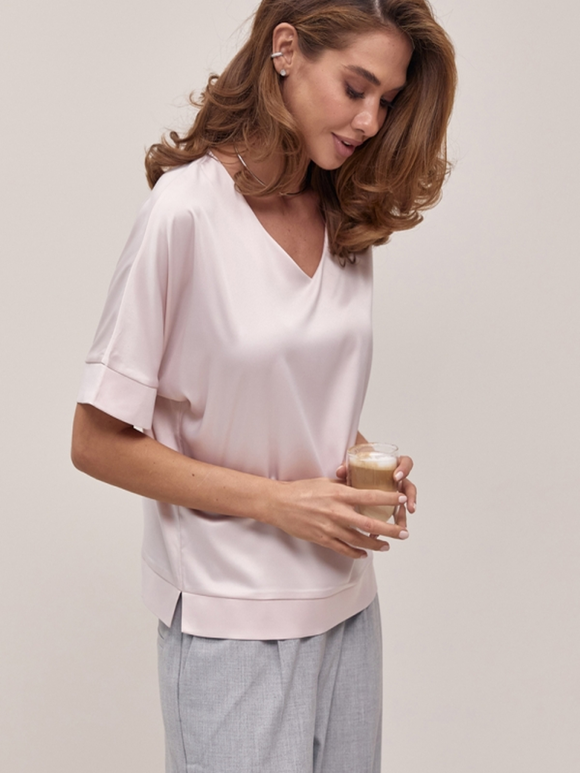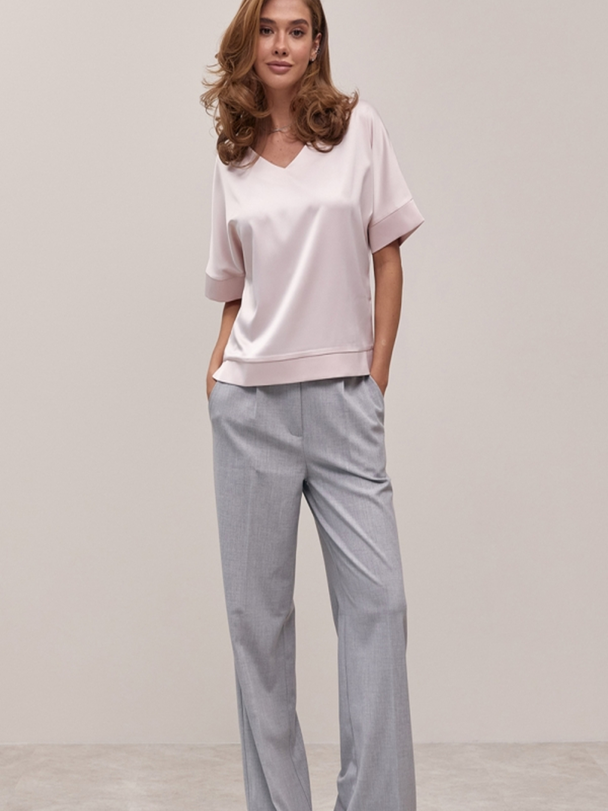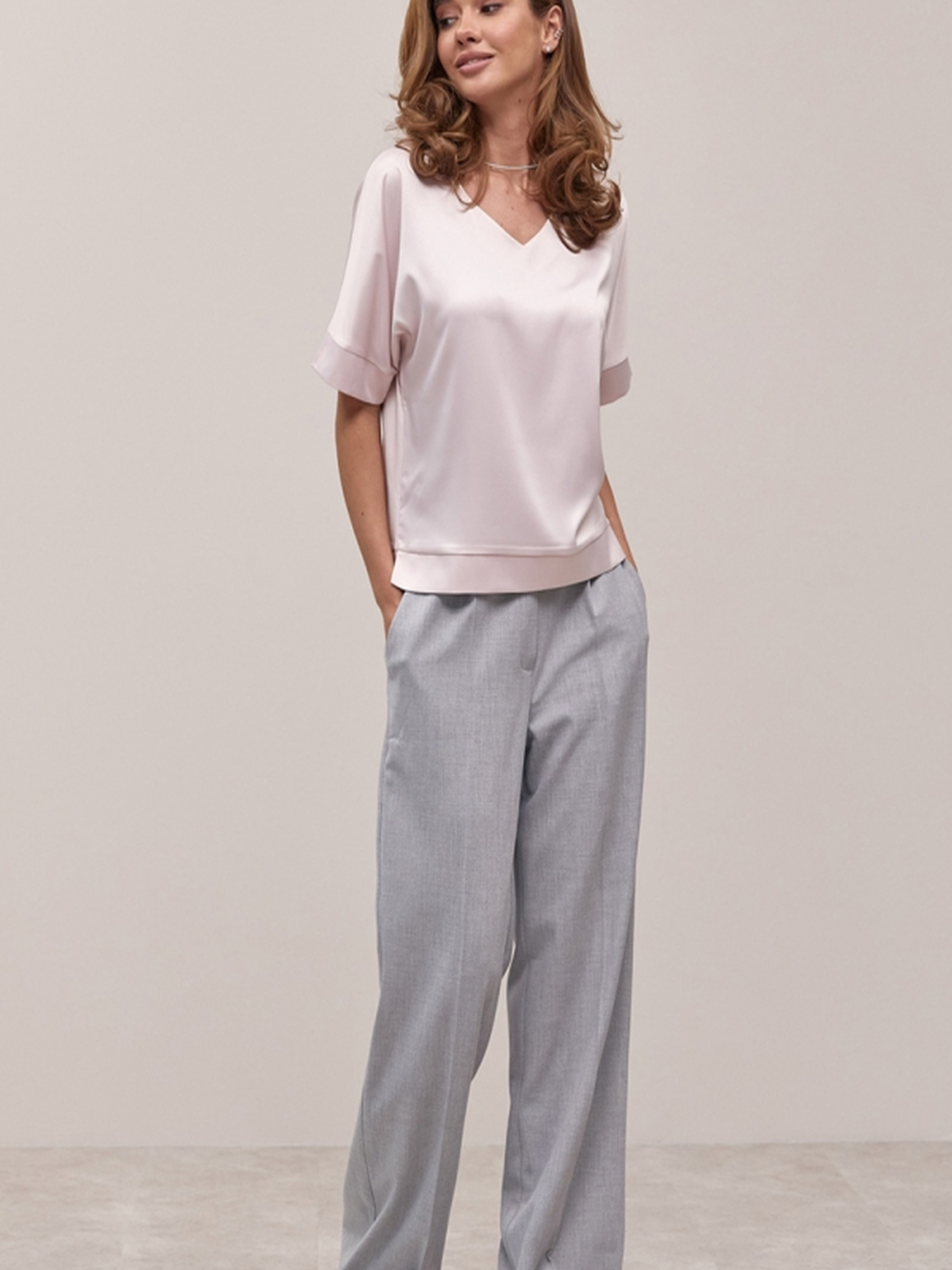 Елегантна блуза, виготовлена з шовкової тканини з ніжним, ледь помітним блиском, стане втіленням жіночності та витонченості у вашому гардеробі. Її вільний крій забезпечує відчуття легкості та комфорту протягом усього дня, не сковуючи рухів. Охайний комфортний рукав додає образу завершеності та елегантності. Ця блуза ідеально підійде для створення різноманітних образів – від елегантних ділових до більш розслаблених повсякденних. Шовкова тканина приємно відчувається на шкірі та має розкішний вигляд. Глибокий виріз додає образу нотку спокусливості та підкреслює лінію шиї. Характеристики: Матеріал: Шовкова тканина (з ніжним блиском) Крій: Вільний Рукав: Комфортний Довжина: близько 60-64 см Ширина під проймою (спокійний стан): 55-59 см Ширина по низу: 48-54 см Довжина рукава: 36-38 см Глибина вирізу: 18-20 см