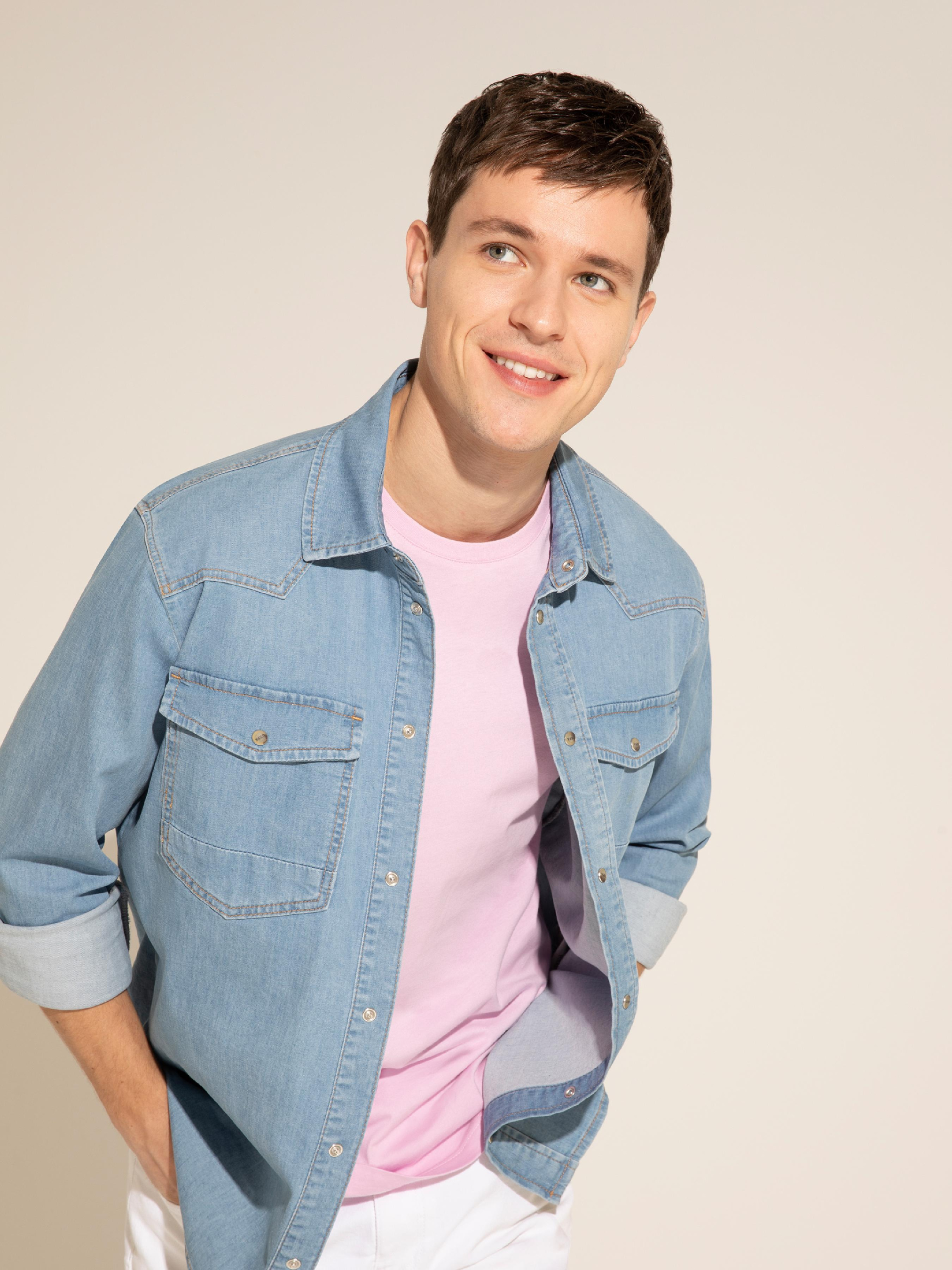 Цвет: светло-синий Состав: 97% хлопок, 3% элэстан Застежка: пуговицы Воротник: отложной Длинна рукава: длинный Фасон: прямой Обхват груди: 96см Обхват талии: 85 см Размер на модели: М LID-3403