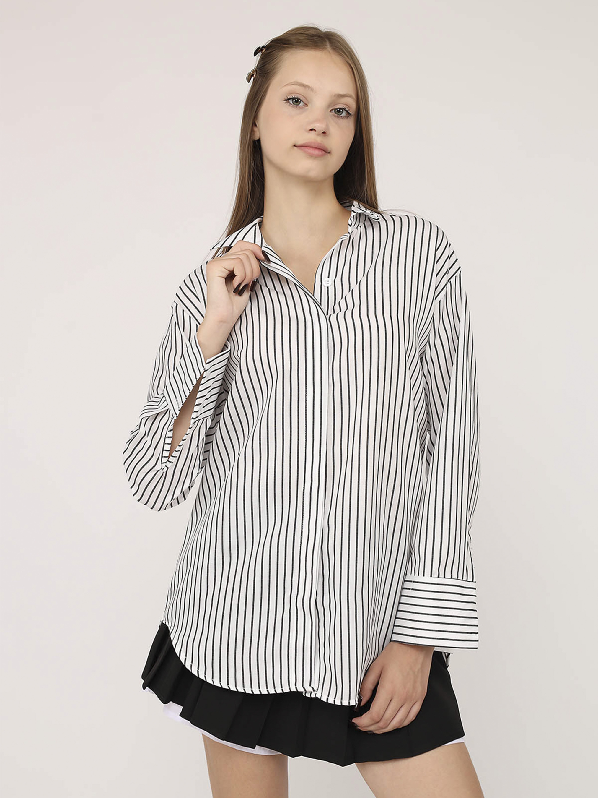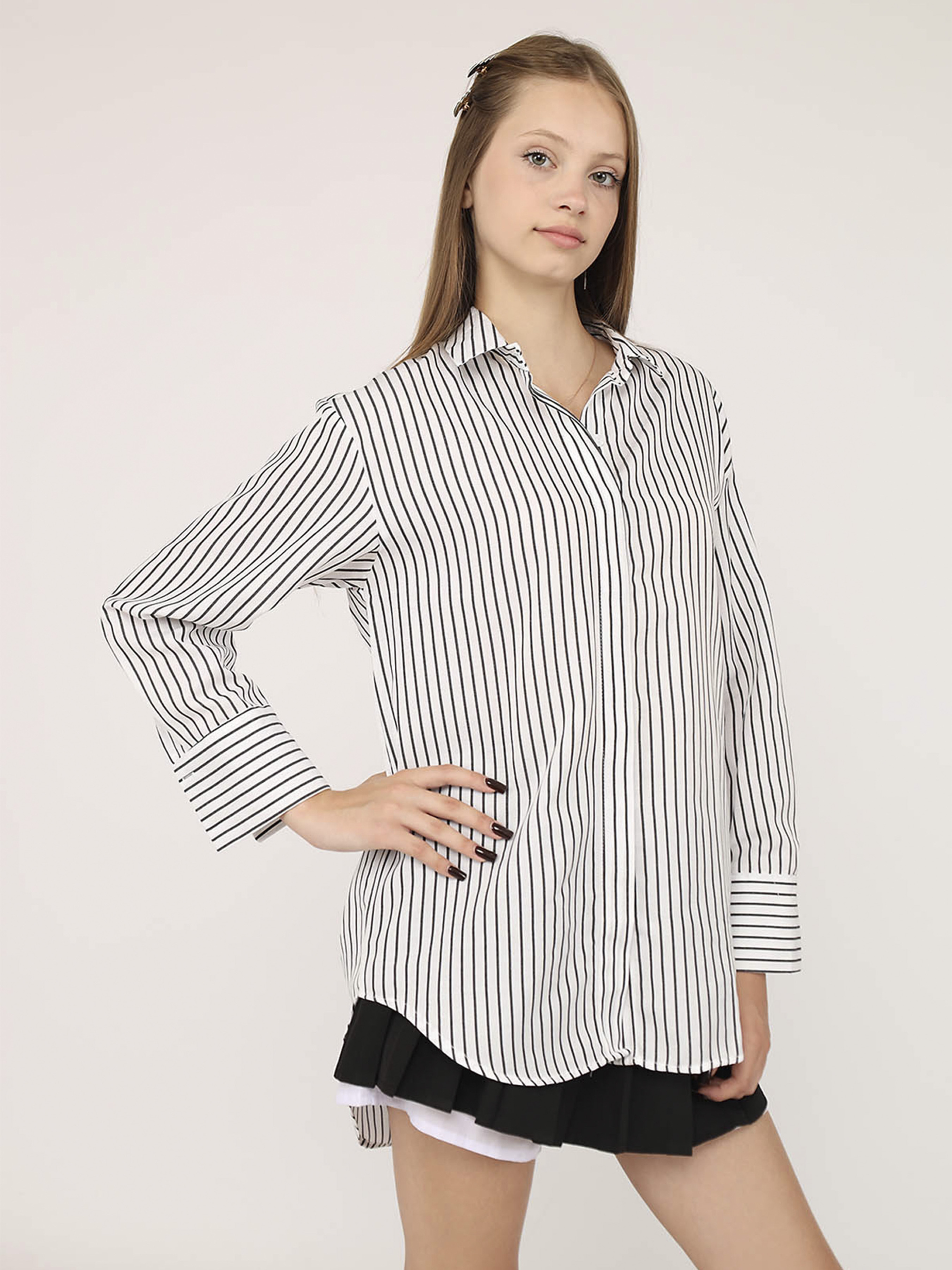 Рубашка с длинным рукавом женская – это стильный и универсальный элемент гардероба, который станет прекрасным дополнением к любому образу. Она идеально подходит как для повседневной носки, так и для особых моментов в жизни. Особенности изделия: Цвет: белый. Материал изготовления: поплин. Состав: 50% хлопок, 50% полиэстер. Крой: прямой. Длина рубашки: удлиненная. Сезон: демисезон. Параметры модели: Рост: 170 сантиметров. Размер на модели: S, украинский размер: 44. Страна производитель: Турция.