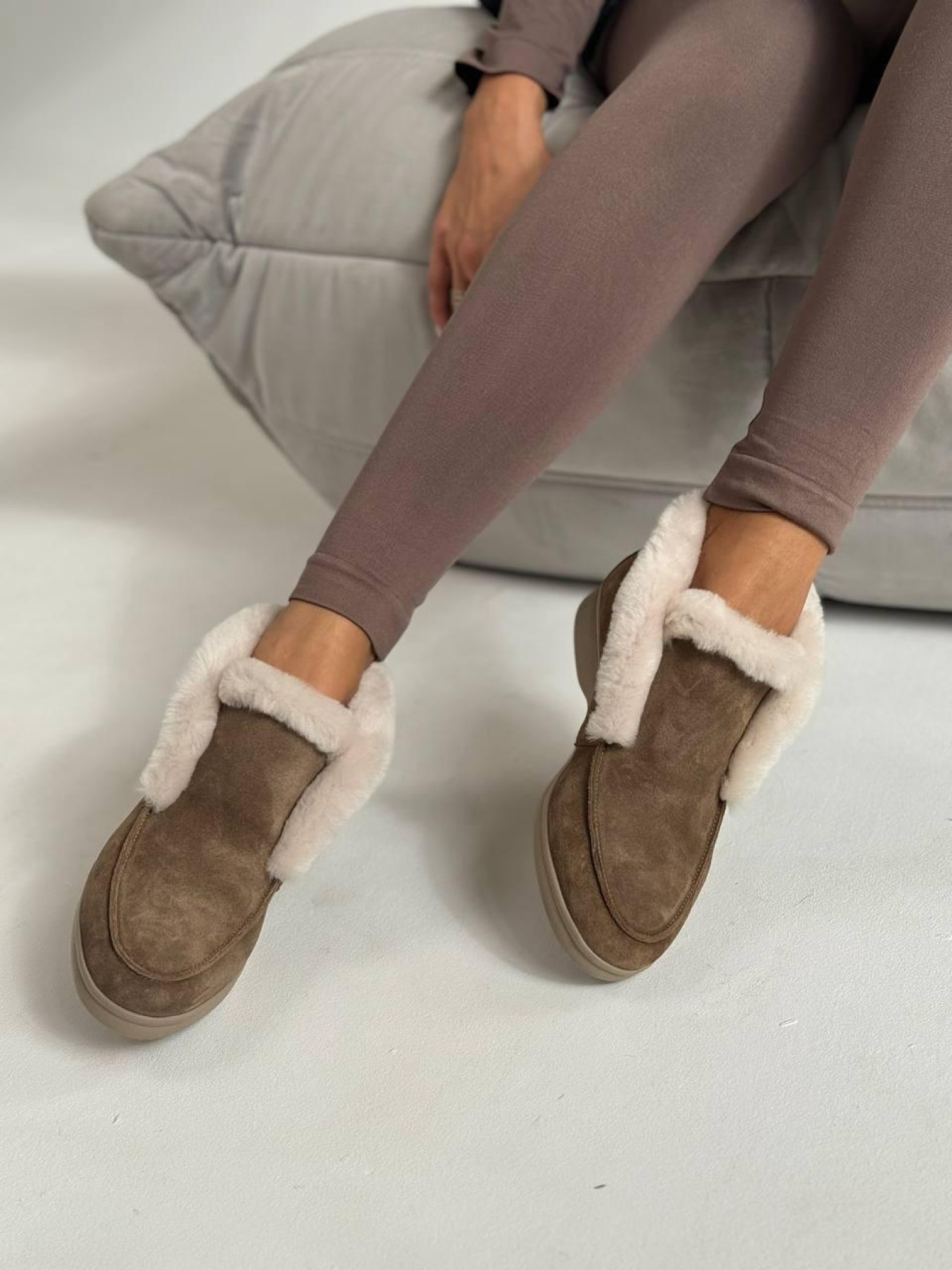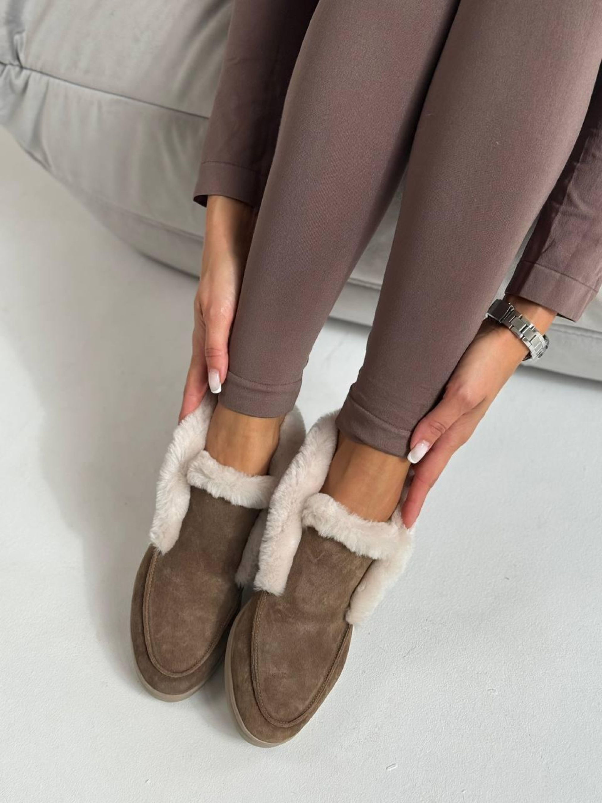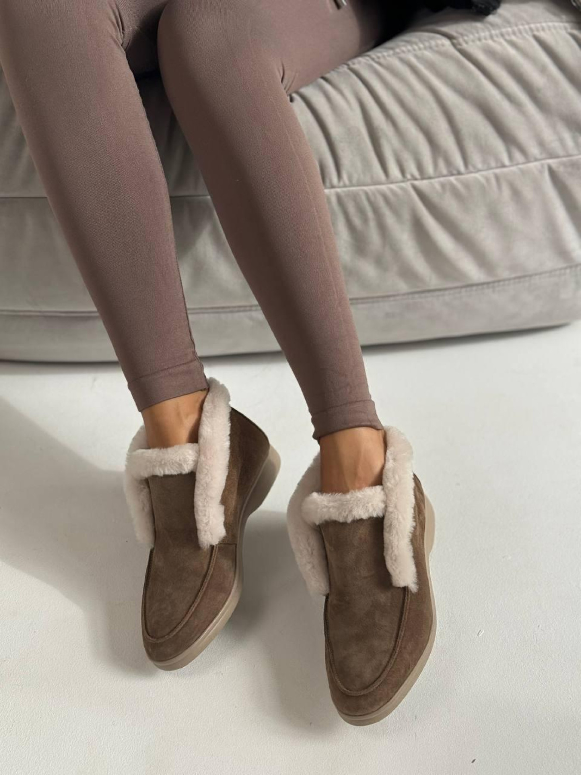 Стильные высокие лоферы с мягкой опушкой — практичная и универсальная модель для холодного сезона. Сдержанный дизайн делает их идеальным дополнением повседневных образов. Верх выполнен из полностью натуральной замши, внутри — тёплая натуральная овчина, которая сохраняет комфорт и тепло. Лёгкая подошва из терморезины обеспечивает устойчивость и удобство при ежедневной носке. Характеристики: Модель: лоферы Материал верха: натуральная замша Подкладка: натуральная овчина Цвет: дерево Высота лофера без подошвы: 8 см Высота подошвы: 1,5–2,5 см Материал подошвы: терморезина Сезон: осень / зима