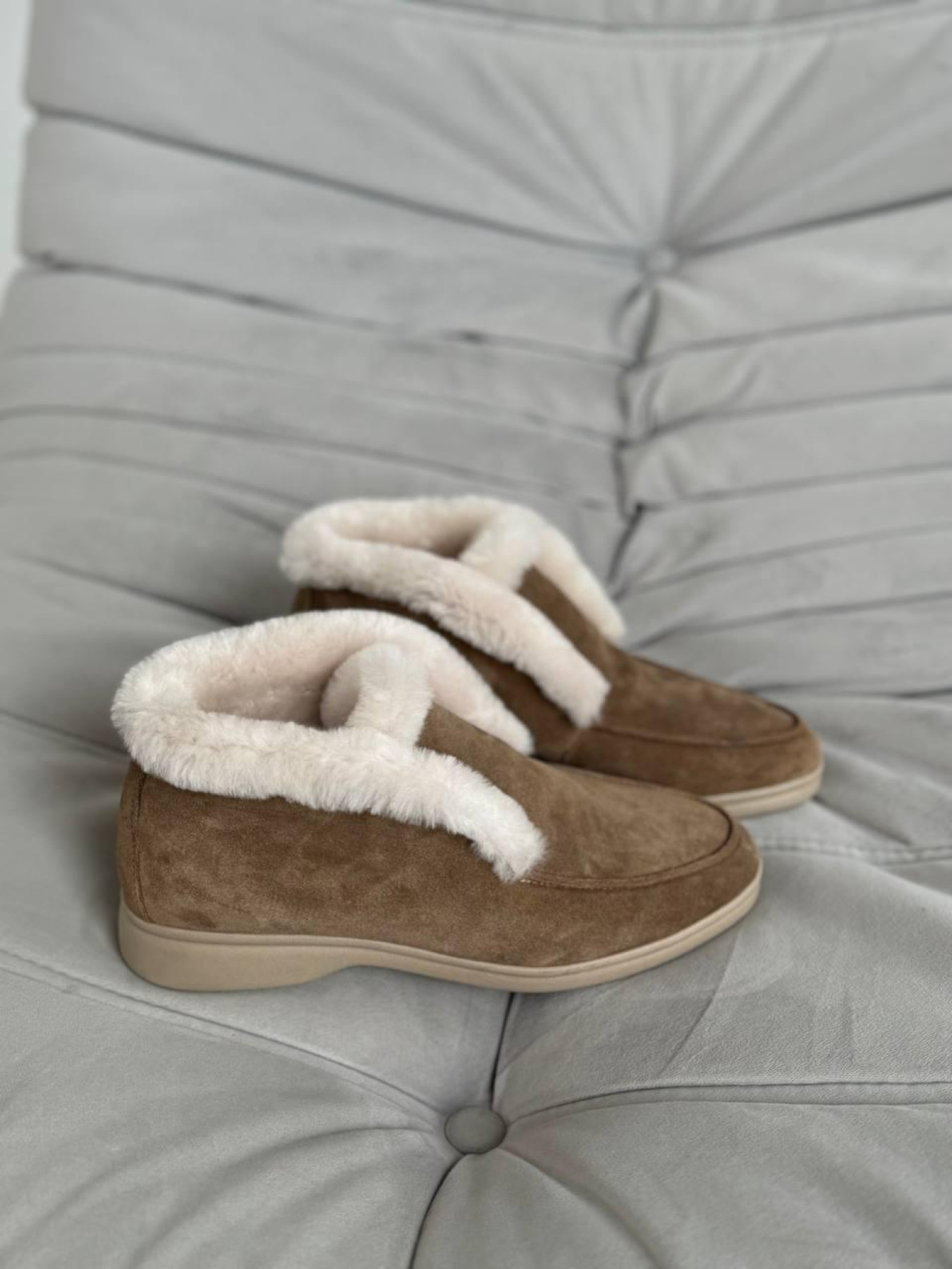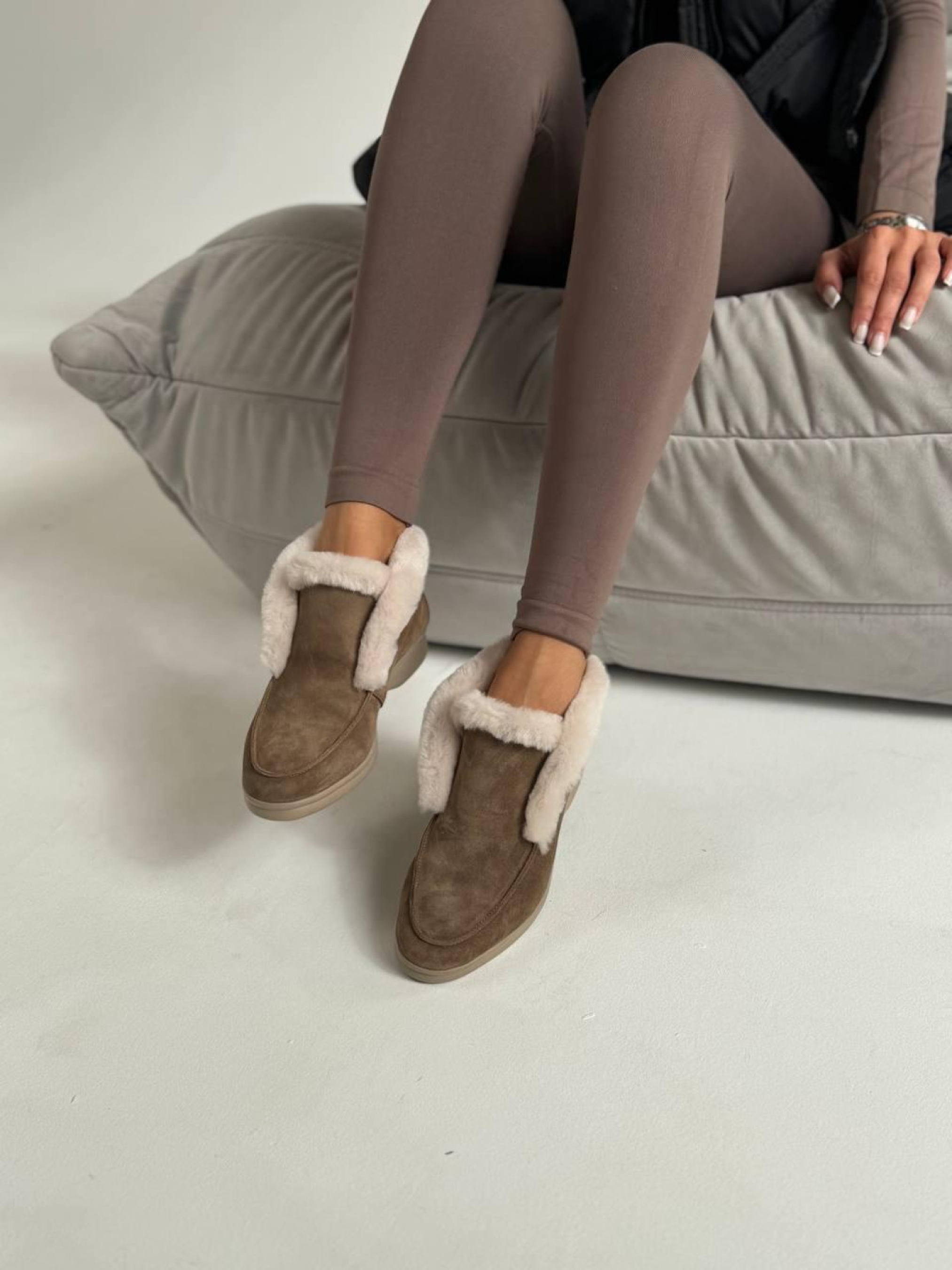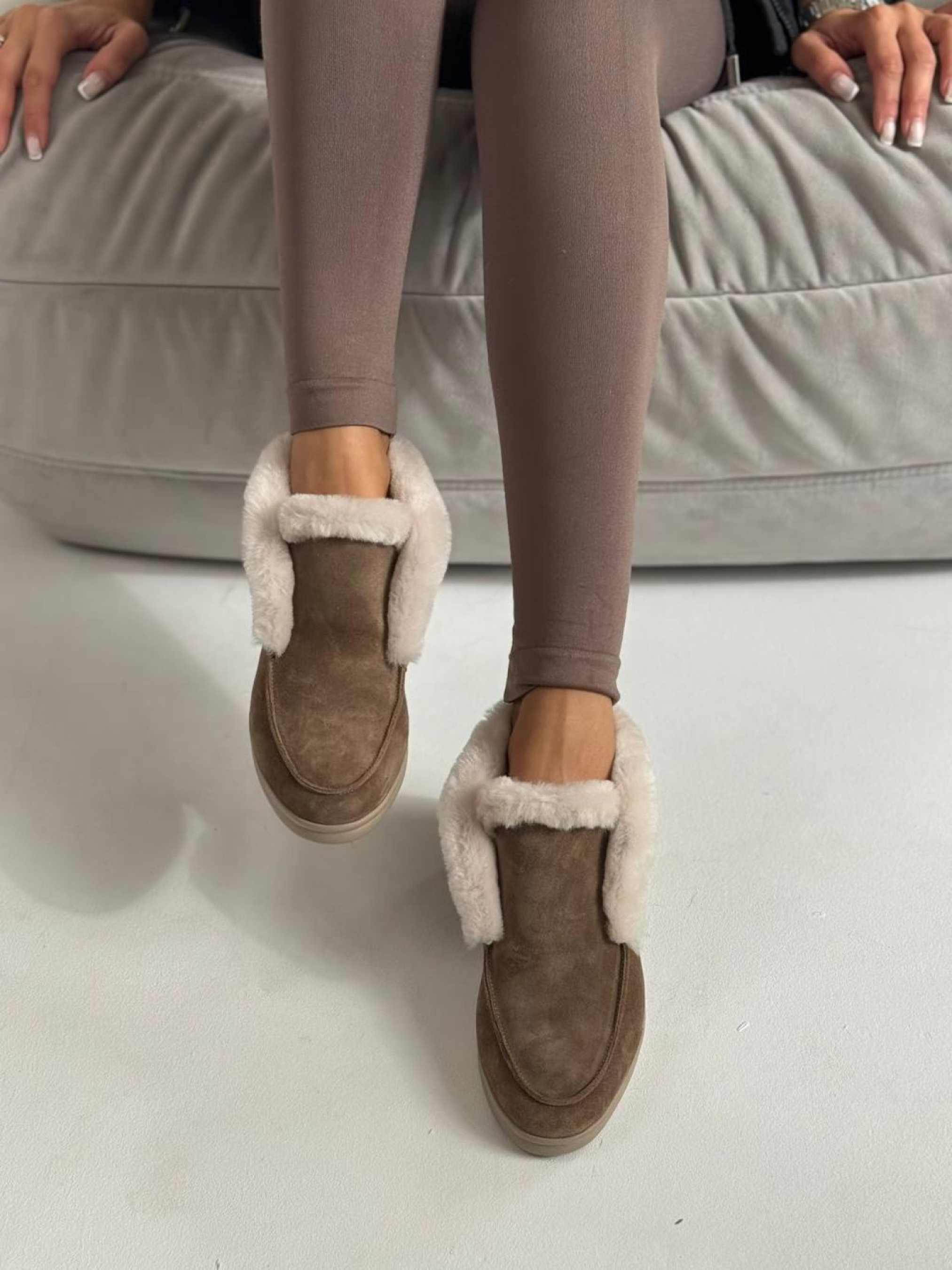 Стильные высокие лоферы с мягкой опушкой — практичная и универсальная модель для холодного сезона. Сдержанный дизайн делает их идеальным дополнением повседневных образов. Верх выполнен из полностью натуральной замши, внутри — тёплая натуральная овчина, которая сохраняет комфорт и тепло. Лёгкая подошва из терморезины обеспечивает устойчивость и удобство при ежедневной носке. Характеристики: Модель: лоферы Материал верха: натуральная замша Подкладка: натуральная овчина Цвет: дерево Высота лофера без подошвы: 8 см Высота подошвы: 1,5–2,5 см Материал подошвы: терморезина Сезон: осень / зима