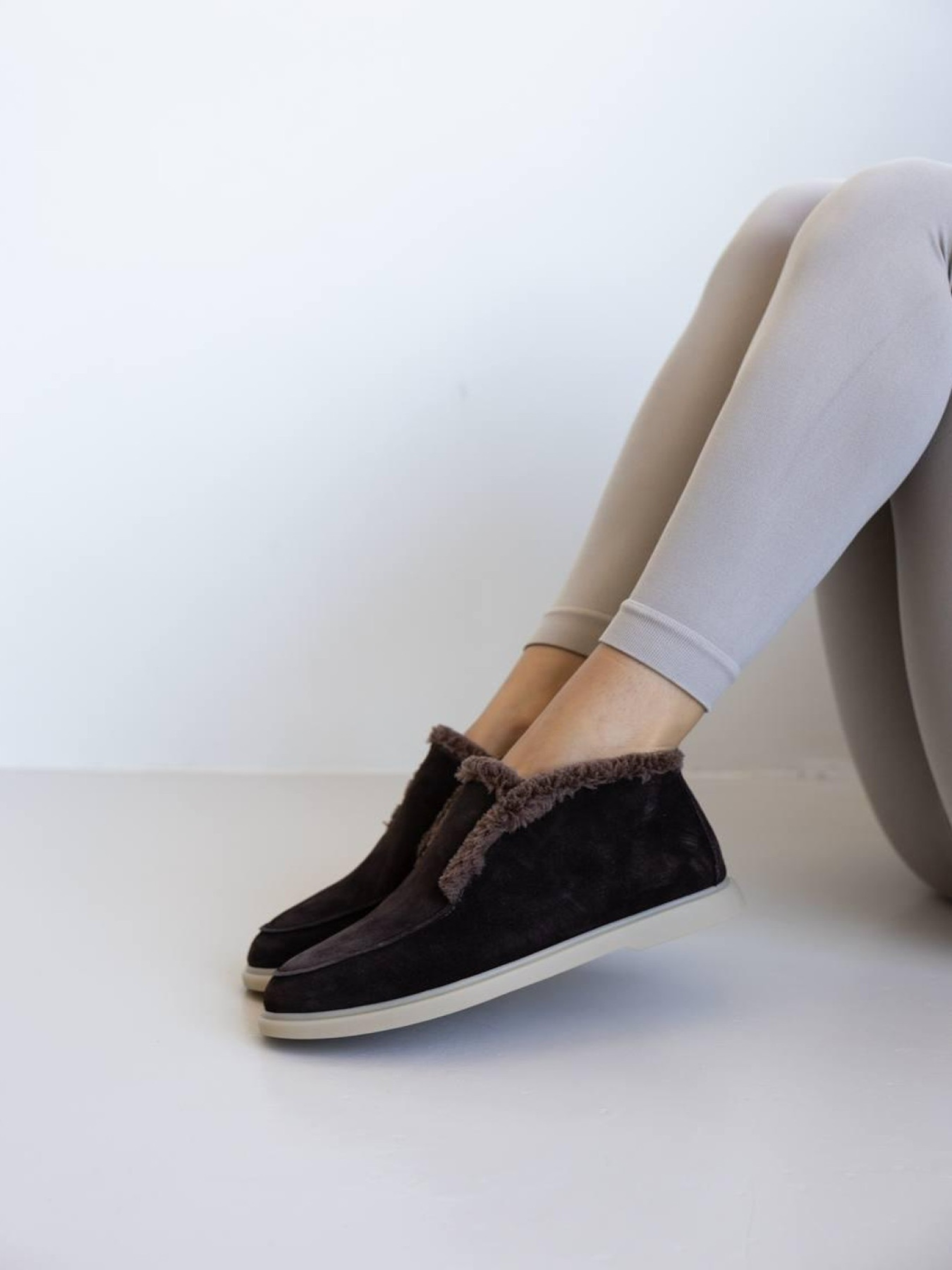 Уютные высокие лоферы с мягкой опушкой — практичная и стильная модель для холодного сезона. Минималистичный дизайн легко вписывается в повседневный гардероб и остаётся актуальным из сезона в сезон. Верх выполнен из полностью натуральной замши, внутри — тёплый меховой подклад даблфейс альпи, который сохраняет тепло и комфорт. Лёгкая подошва из терморезины делает пару удобной для ежедневной носки. Характеристики: Модель: лоферы Материал верха: натуральная замша Подкладка: мех даблфейс альпи Цвет: какао Высота лофера без подошвы: 8 см Высота подошвы: 1,5–2,5 см Материал подошвы: терморезина Сезон: осень / зима