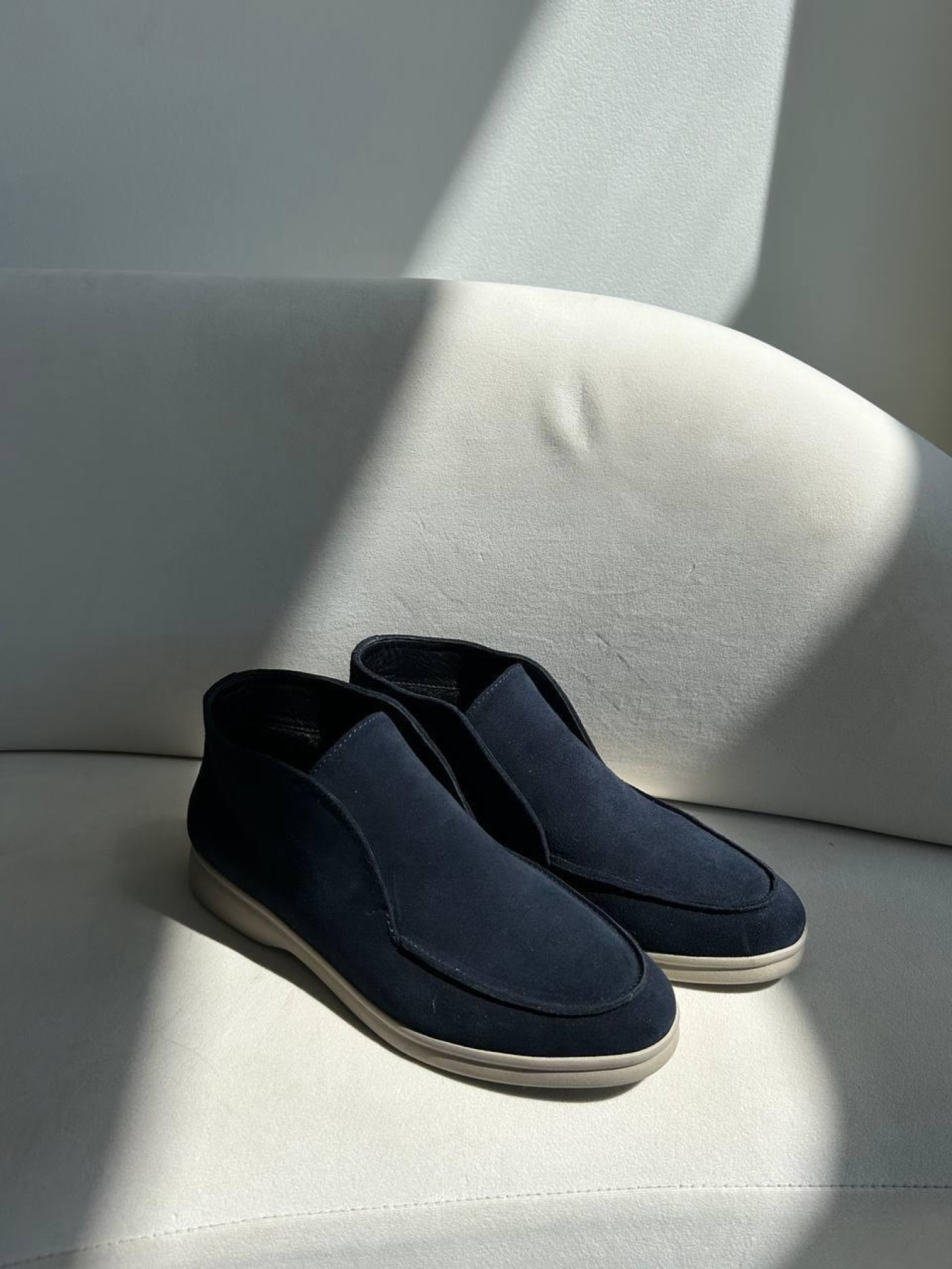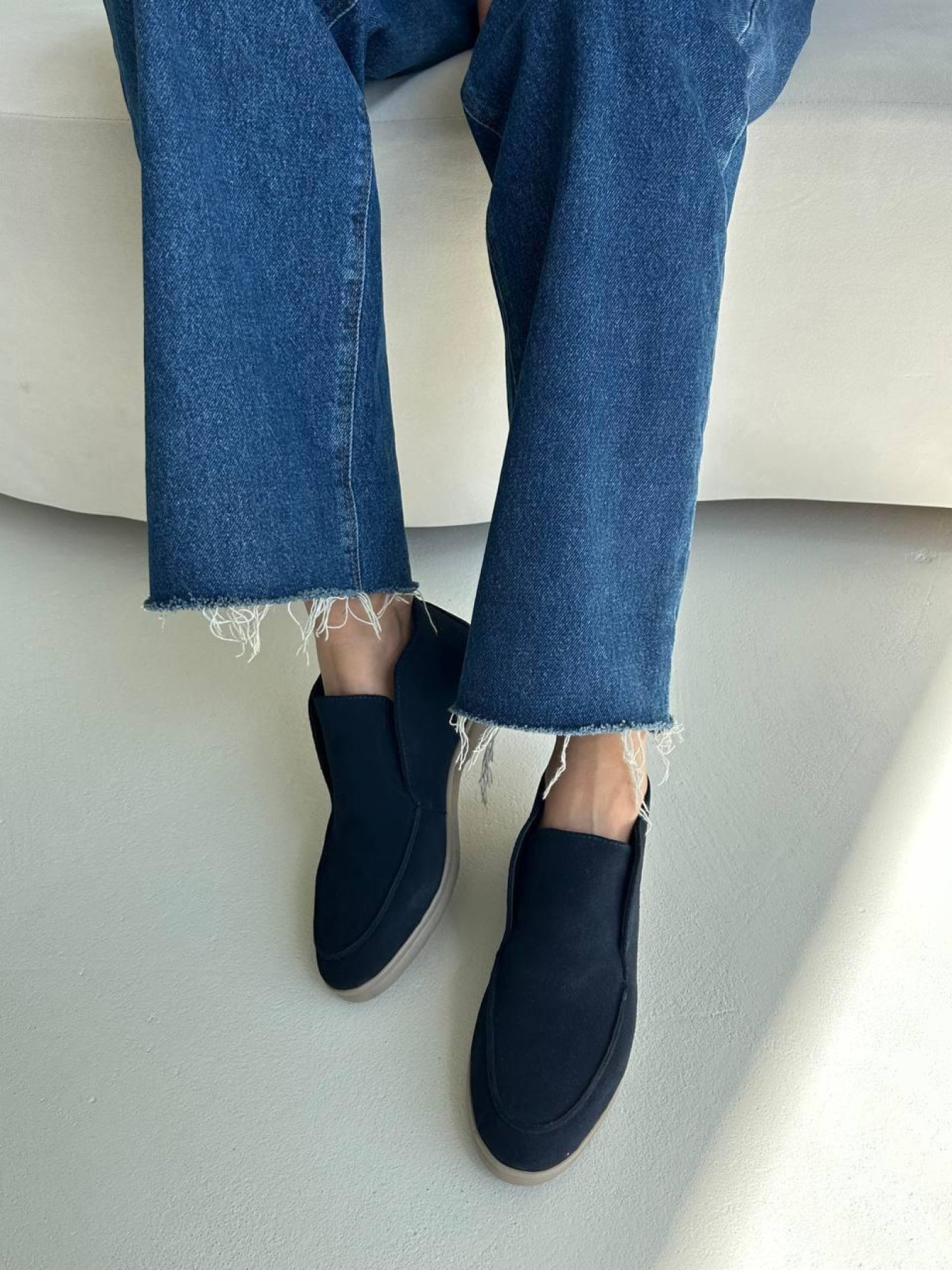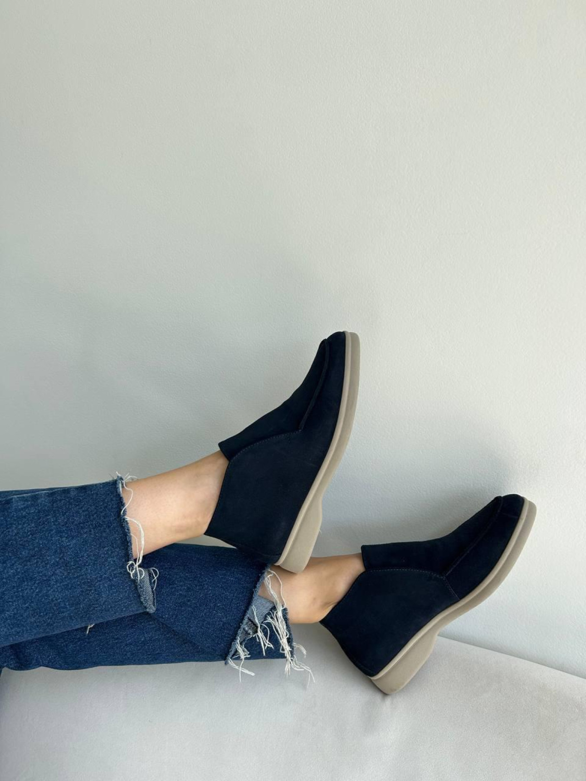 Комфорт и стиль удачно сочетаются в модели высоких замшевых лоферов. Удобная и тёплая пара для повседневной носки, которая легко вписывается в любой гардероб. Модель выполнена из полностью натуральной замши, внутри — натуральная овчина, обеспечивающая тепло и мягкость. Лёгкая и гибкая подошва делает обувь максимально комфортной на каждый день. Характеристики: Модель: лоферы Материал верха: натуральная замша Подкладка: натуральная овчина маус Цвет: тёмно синий Высота лофера без подошвы: 8 см Высота подошвы: 1,5–2,5 см Подошва: лёгкая и гибкая Сезон: осень / зима