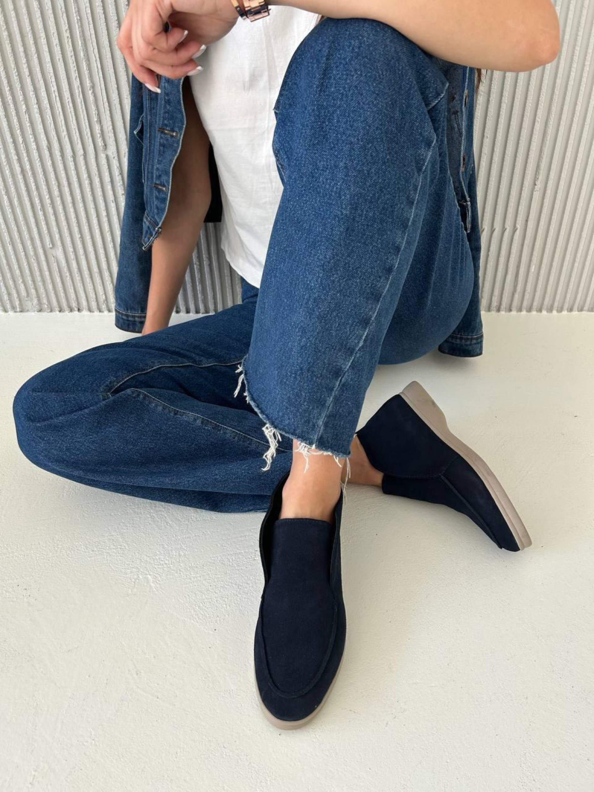 Комфорт и стиль удачно сочетаются в модели высоких замшевых лоферов. Удобная и тёплая пара для повседневной носки, которая легко вписывается в любой гардероб. Модель выполнена из полностью натуральной замши, внутри — натуральная овчина, обеспечивающая тепло и мягкость. Лёгкая и гибкая подошва делает обувь максимально комфортной на каждый день. Характеристики: Модель: лоферы Материал верха: натуральная замша Подкладка: натуральная овчина Цвет: тёмный джинс Высота лофера без подошвы: 8 см Высота подошвы: 1,5–2,5 см Подошва: лёгкая и гибкая Сезон: осень / зима