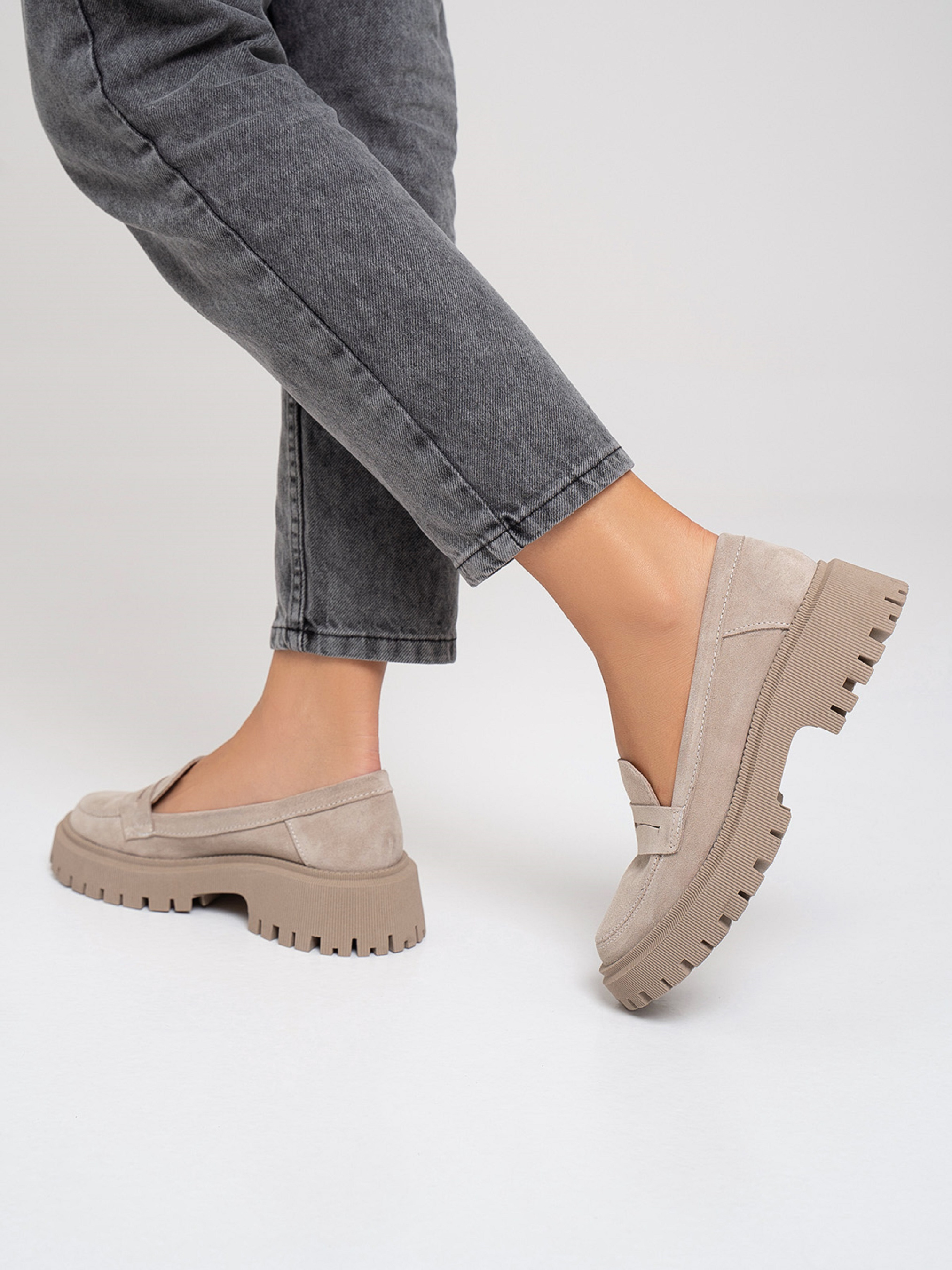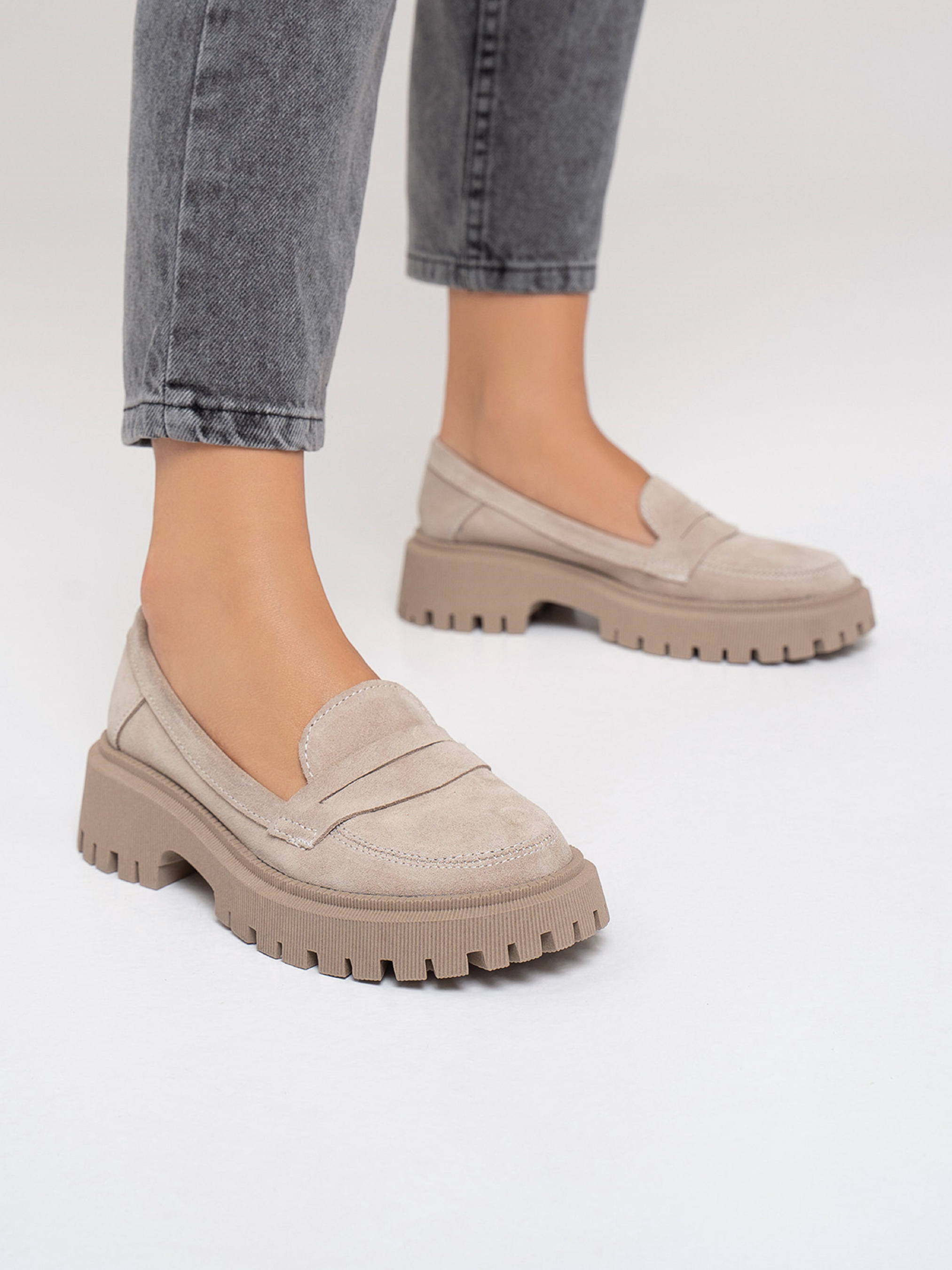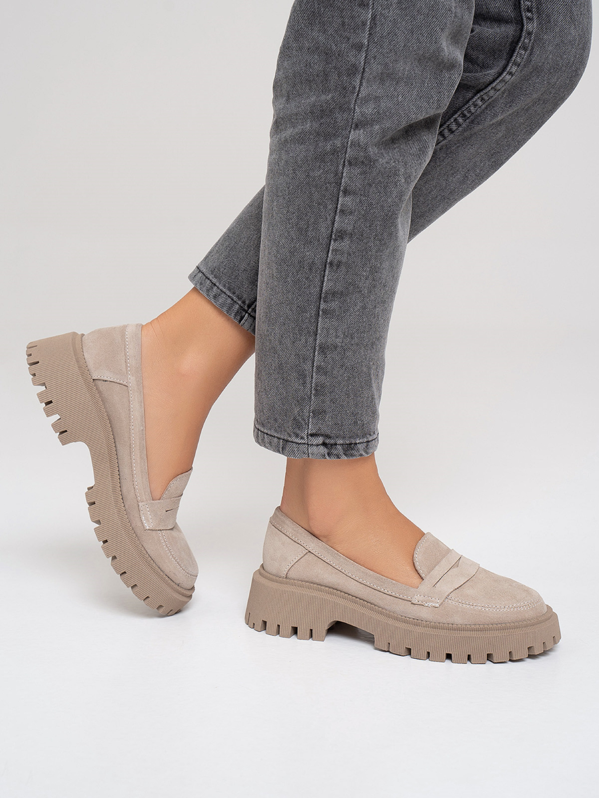 Бежевые демисезонные лоферы на грубой подошве, выполненные из натуральной замши. Модель с кожаным внутренним подкладом. Материал верха: натуральная замша. Подклад: натуральная кожа. Подошва: TR (терморезина). Высота подошвы: 5 см и 2,5 см. Замеры: 36 (23), 37 (23,5), 38 (24), 39 (24,5), 40 (25), 41 (25,5).