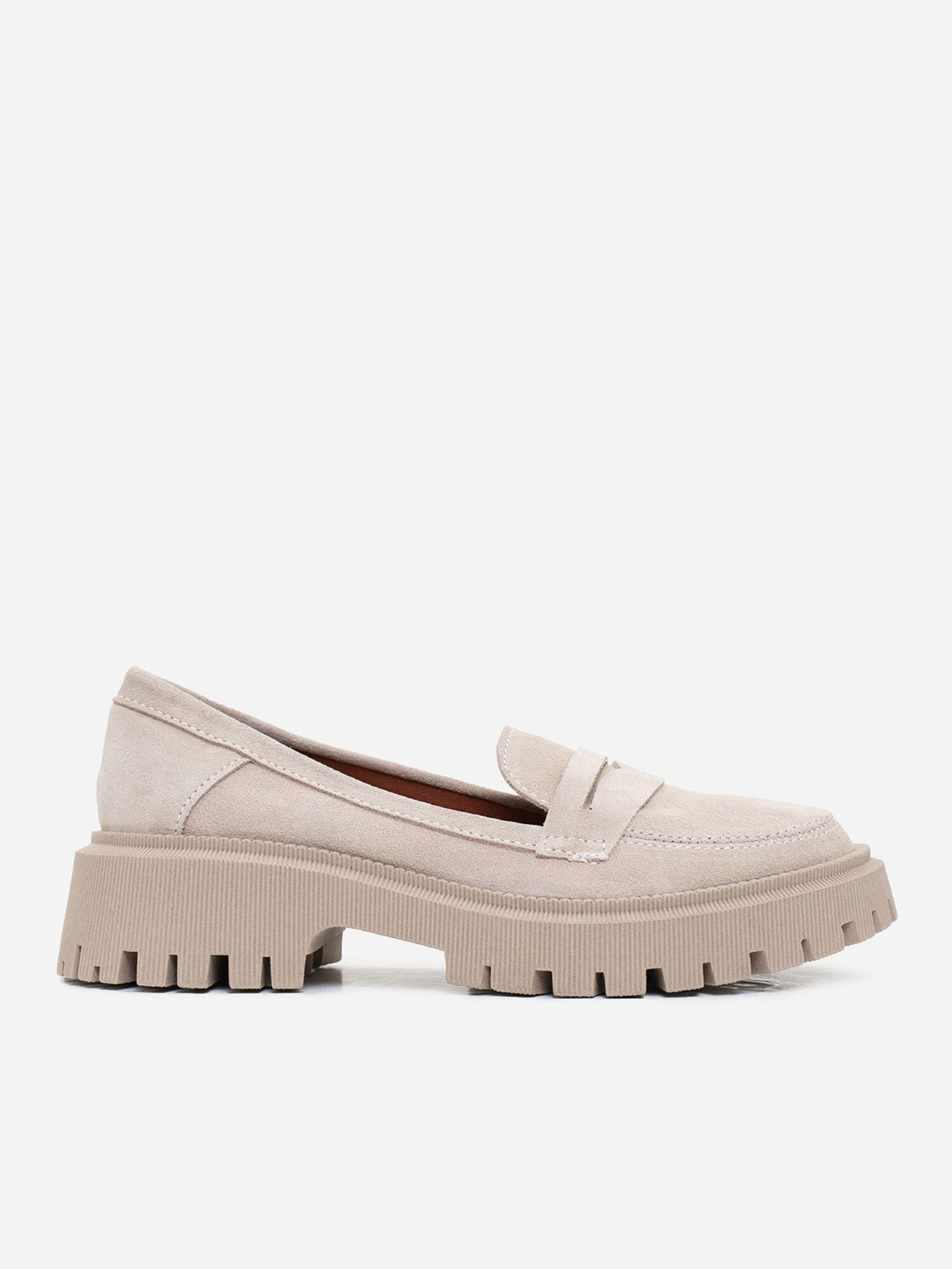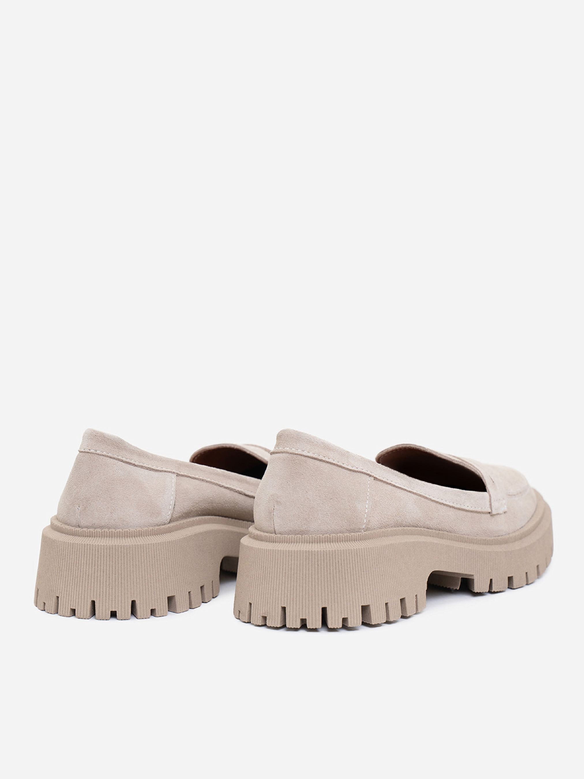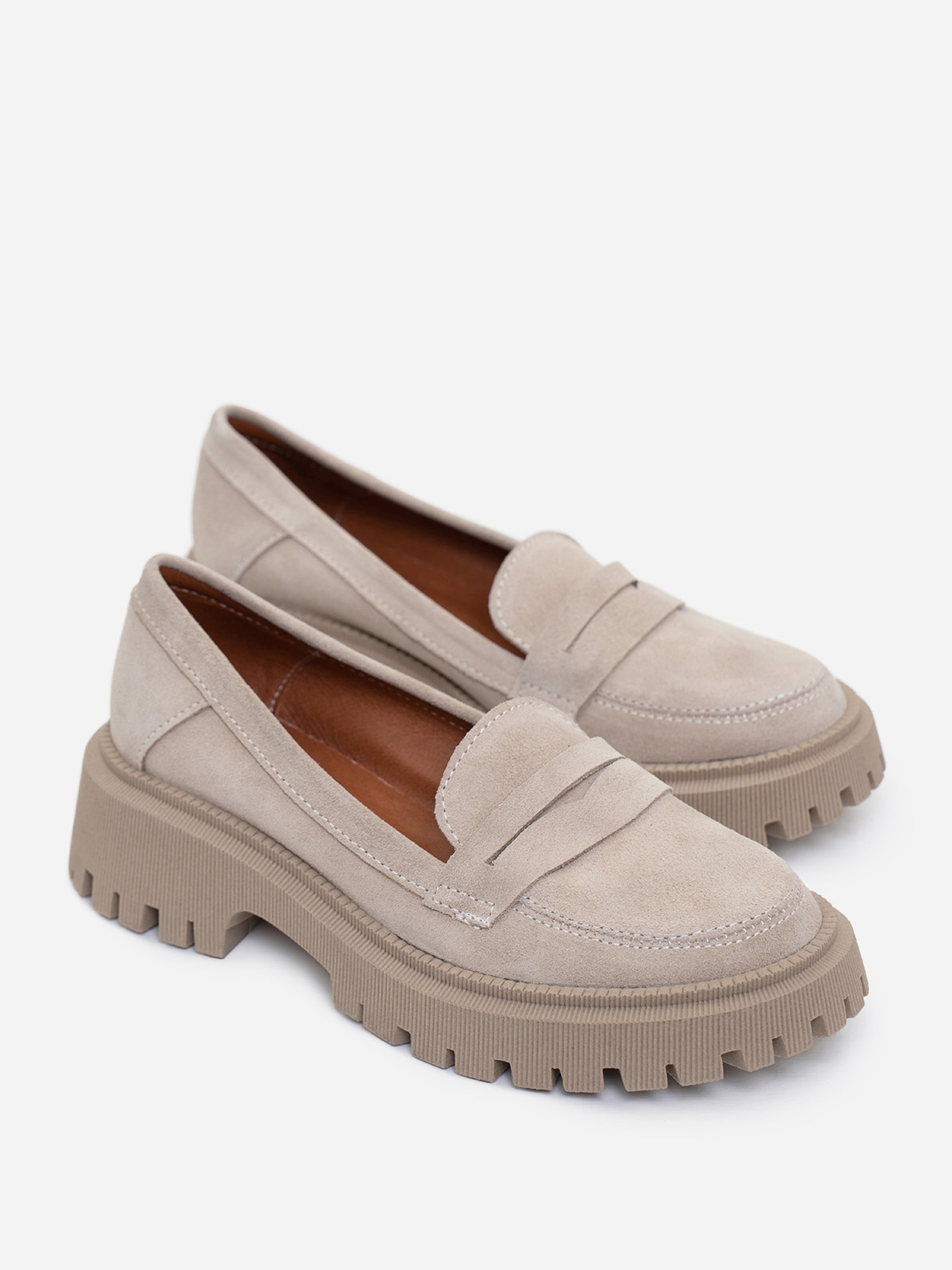 Бежевые демисезонные лоферы на грубой подошве, выполненные из натуральной замши. Модель с кожаным внутренним подкладом. Материал верха: натуральная замша. Подклад: натуральная кожа. Подошва: TR (терморезина). Высота подошвы: 5 см и 2,5 см. Замеры: 36 (23), 37 (23,5), 38 (24), 39 (24,5), 40 (25), 41 (25,5).