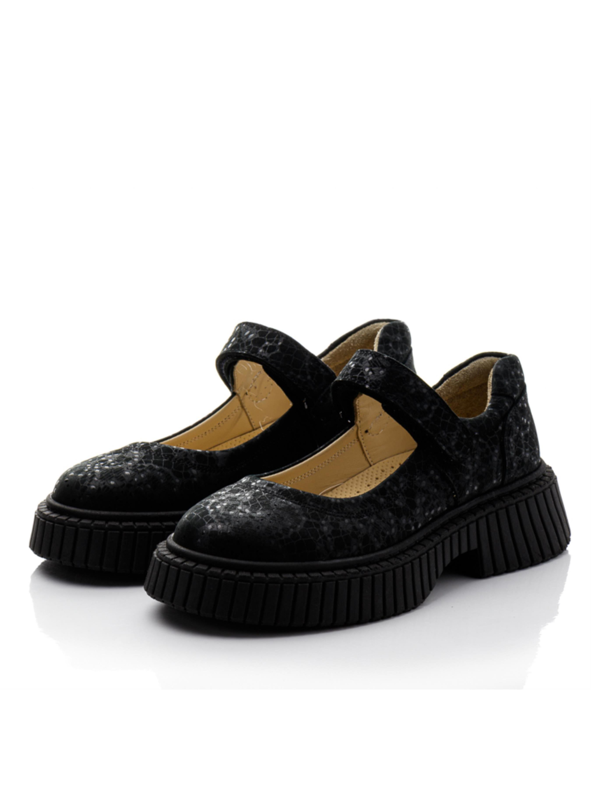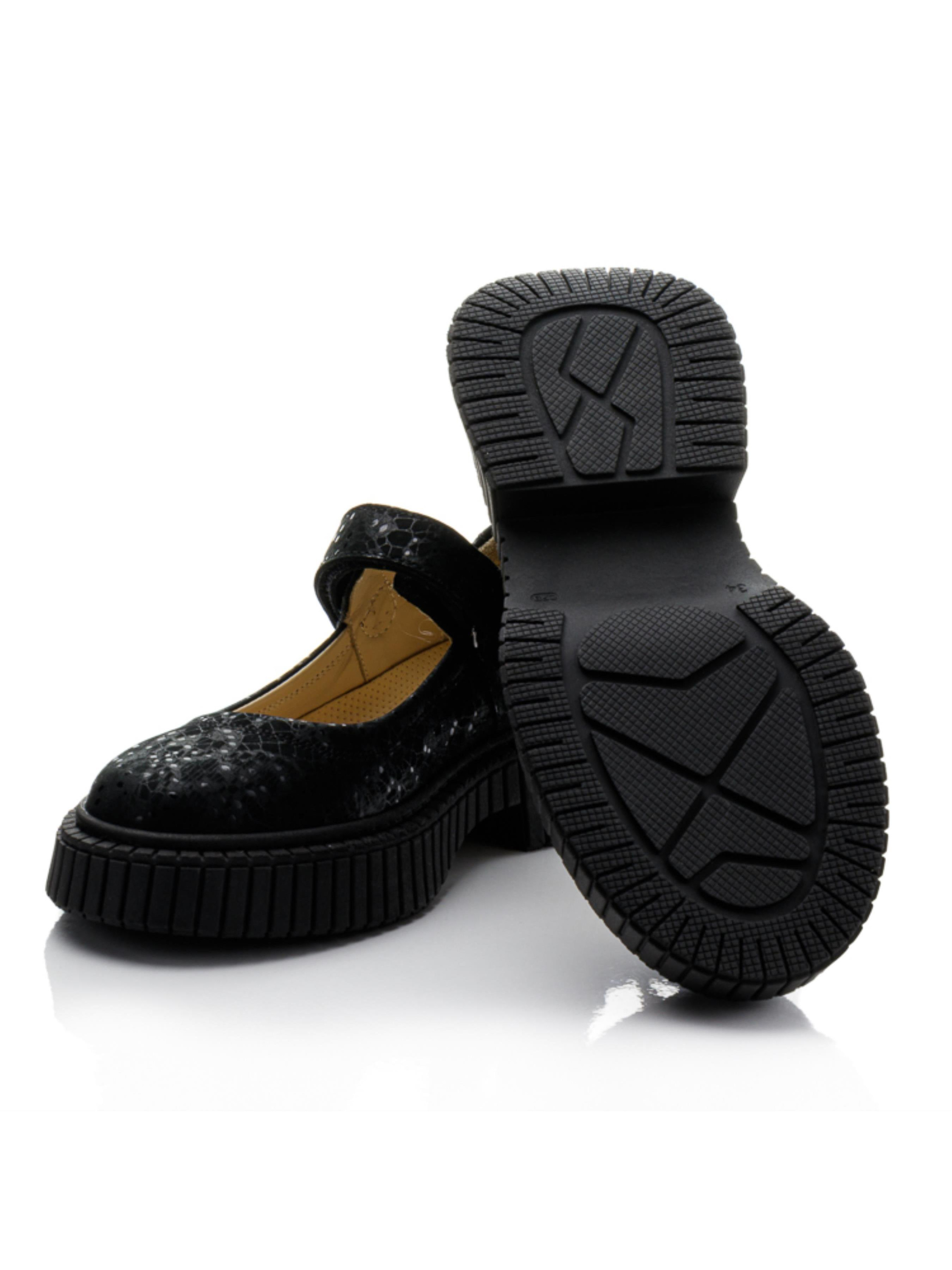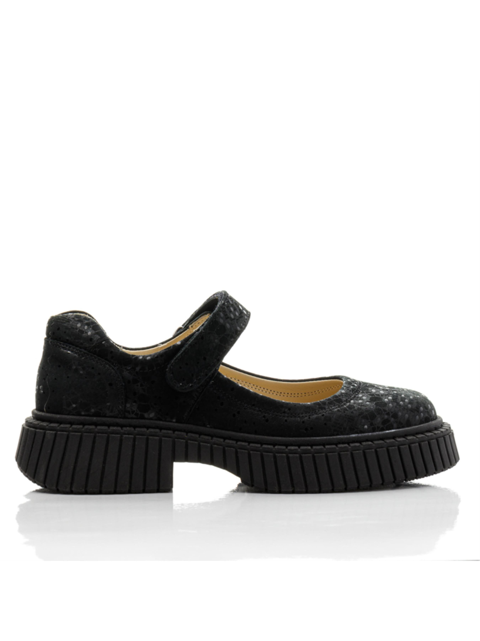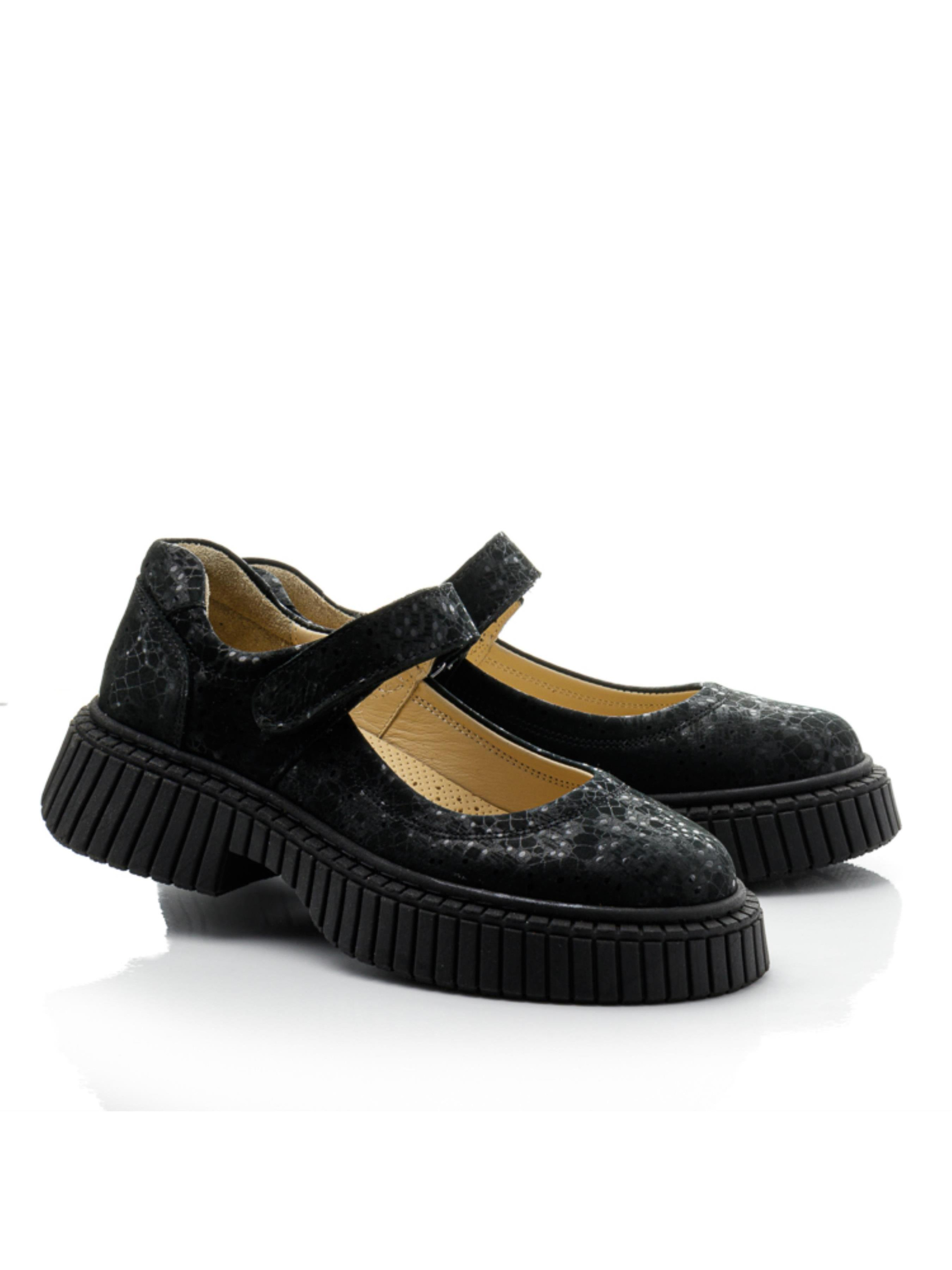 Модные черные туфли из нубука с деликатным перламутровым переливом — отличный выбор для девочек и подростков, которые хотят выглядеть стильно и чувствовать себя комфортно каждый день. Оригинальная текстура материала придаёт образу выразительность, а застёжка на липучке позволяет легко и удобно зафиксировать обувь по объёму стопы. Мягкая кожаная подкладка и удобная анатомическая колодка обеспечивают комфорт в течение всего дня. Рельефная подошва добавляет устойчивости и амортизации. Размеры — от 34 до 39, поэтому модель подойдёт как для школьниц, так и для подростков, а также может быть интересна мамам с небольшим размером ноги. Стильные туфли из натуральной кожи и нубука — это гармония дизайна, практичности и качества.