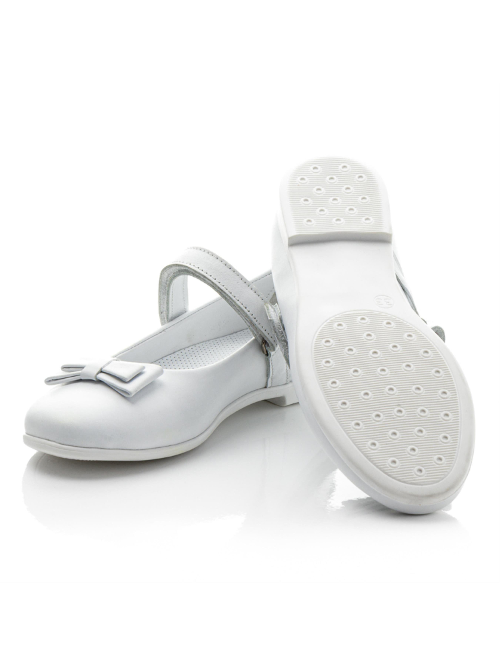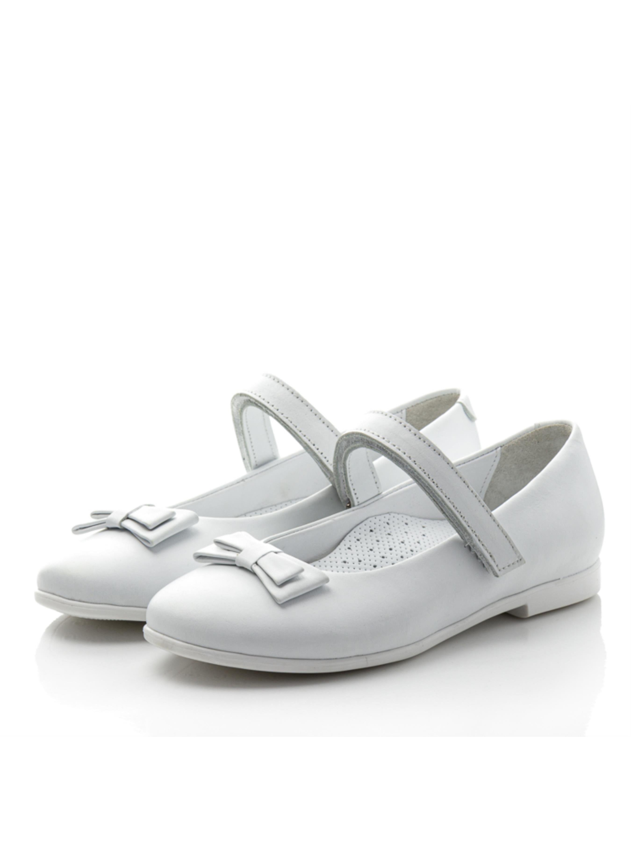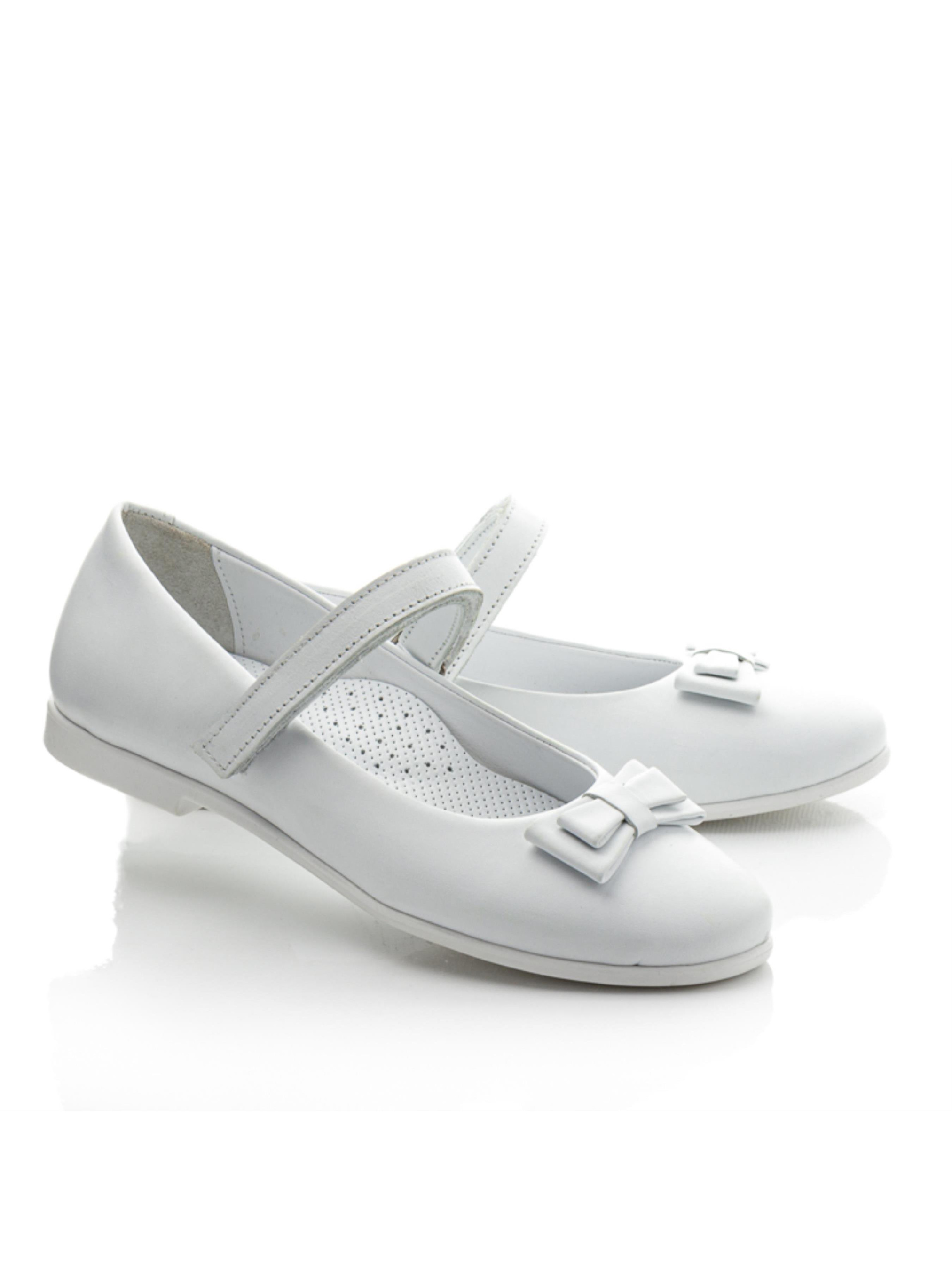 Элегантные туфли-балетки для девочек — стильное и практичное решение для тёплого сезона. Модель выполнена из натуральной белой кожи и дополнена легкой подошвой в тон, что делает её особенно аккуратной и нарядной. Подкладка и стелька из натуральной кожи с супинатором обеспечивают комфорт и поддержку детской стопы в течение всего дня. Застежка-липучка делает обувание быстрым и удобным, а милый бантик на носочке добавляет изящества и нежности. Эти белые балетки станут идеальным вариантом как для торжеств, так и для повседневной носки.