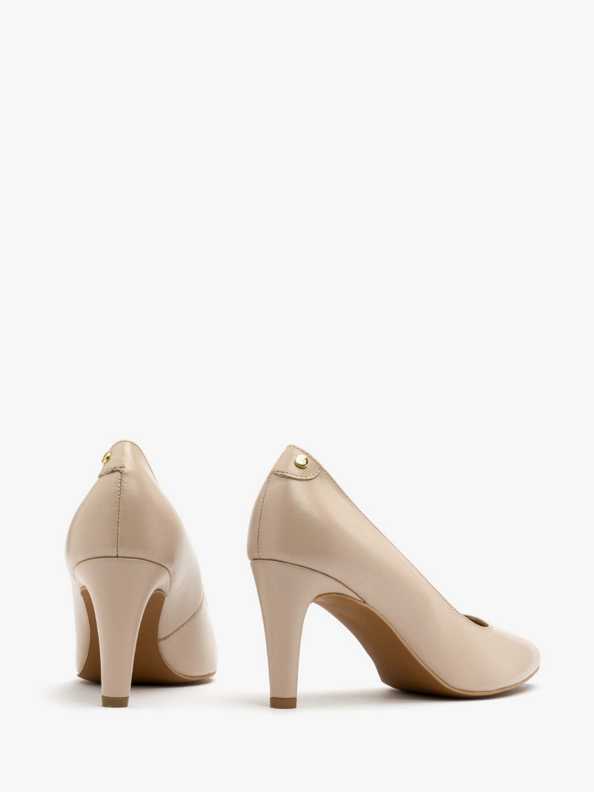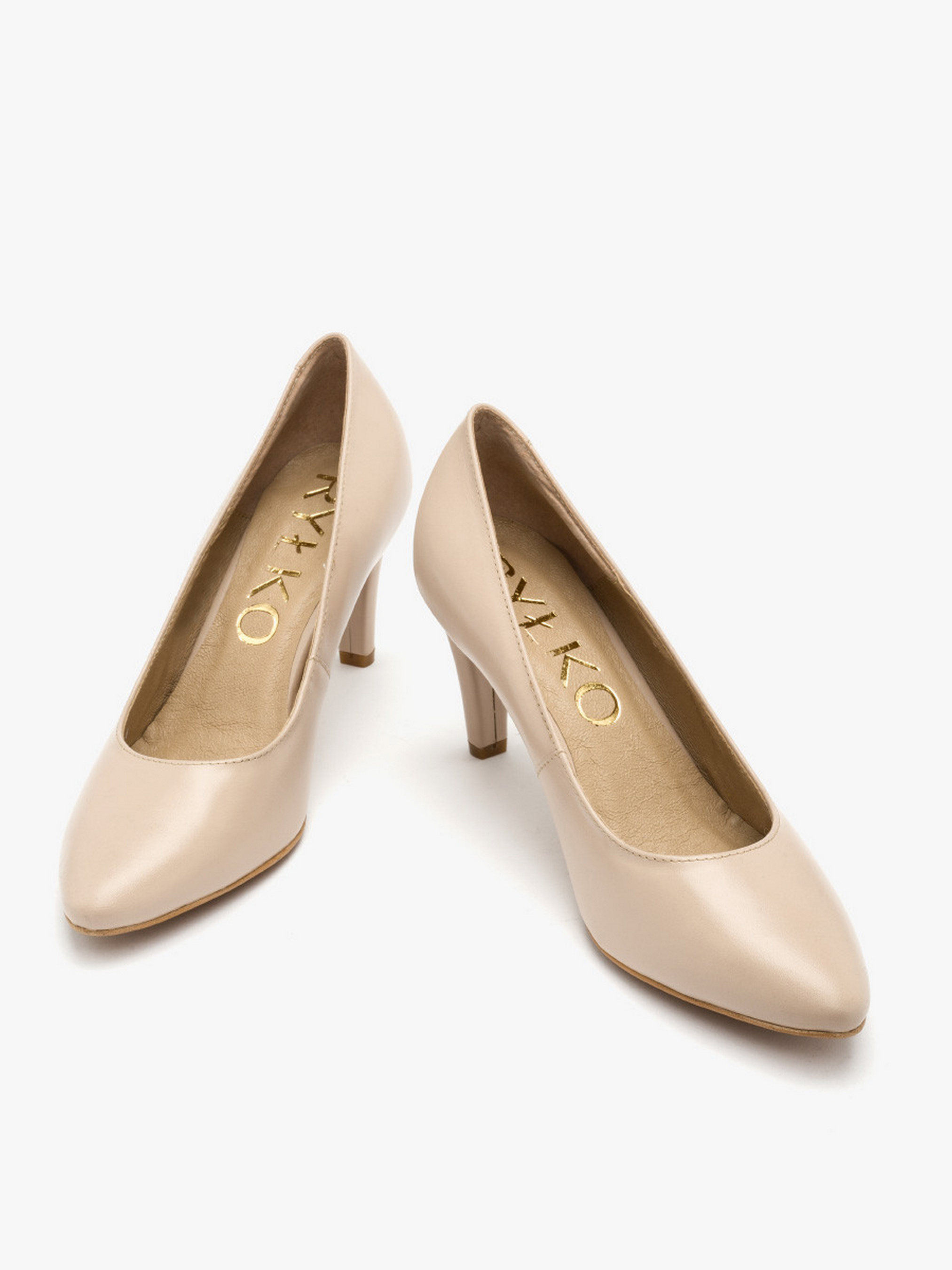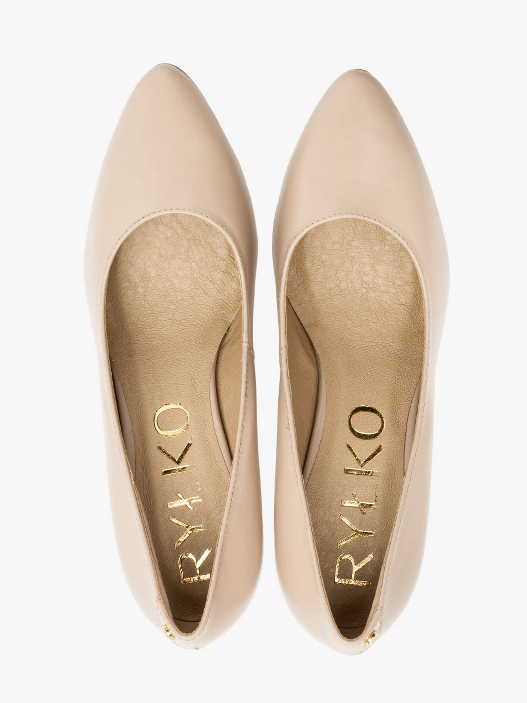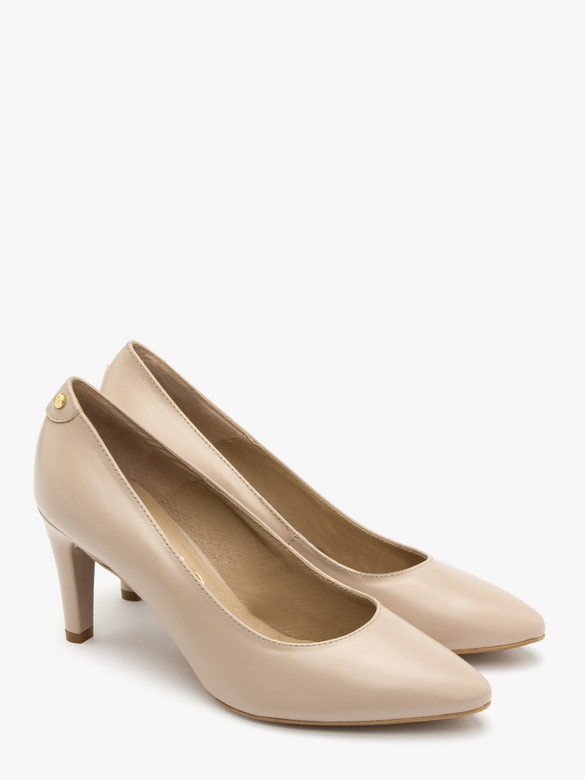 Кожаные туфли-лодочки польского производителя RYLKO светло-бежевого цвета. Модель сделана из лицевой кожи высокого качества. Подходят на стандартную (среднюю) полноту стопы. Внутренние – натуральная кожа. Каблуки средние – высотой 7,5 см, обтянутые кожей. Носок – шпиль. Позади туфли украшены декоративной фурнитурой золотистого цвета с фирменным лого.