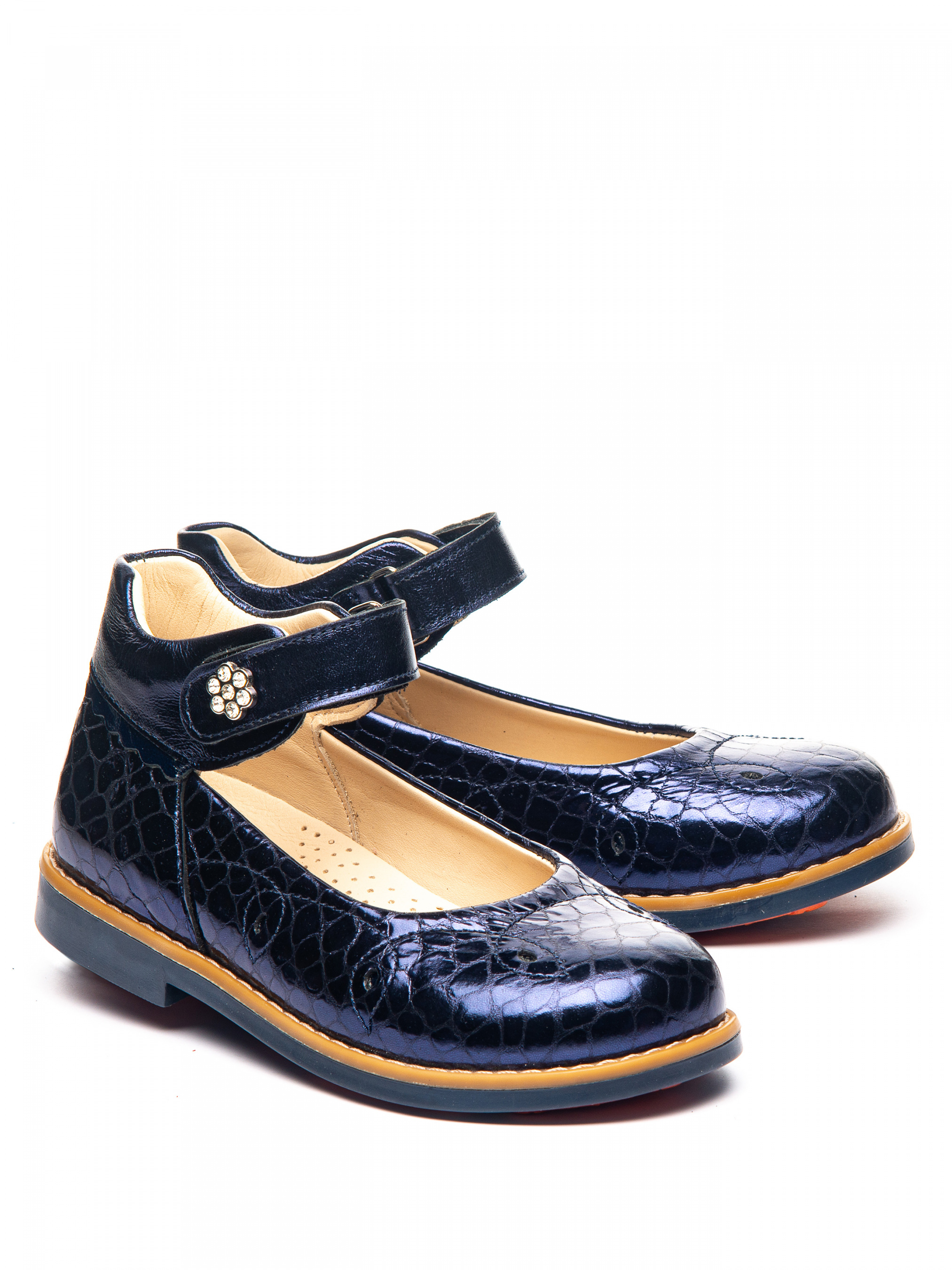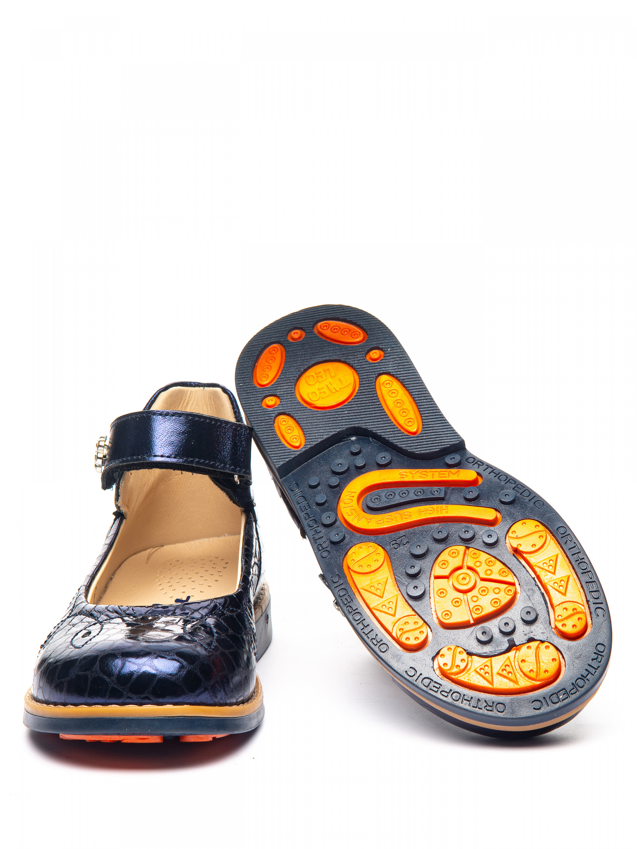 Туфли из лаковой натуральной кожи. Фиксируются с помощью липучки, кожаная подкладка и стелька с анатомическим супинатором. Подошва из термопластиковой резины, не скользящая.