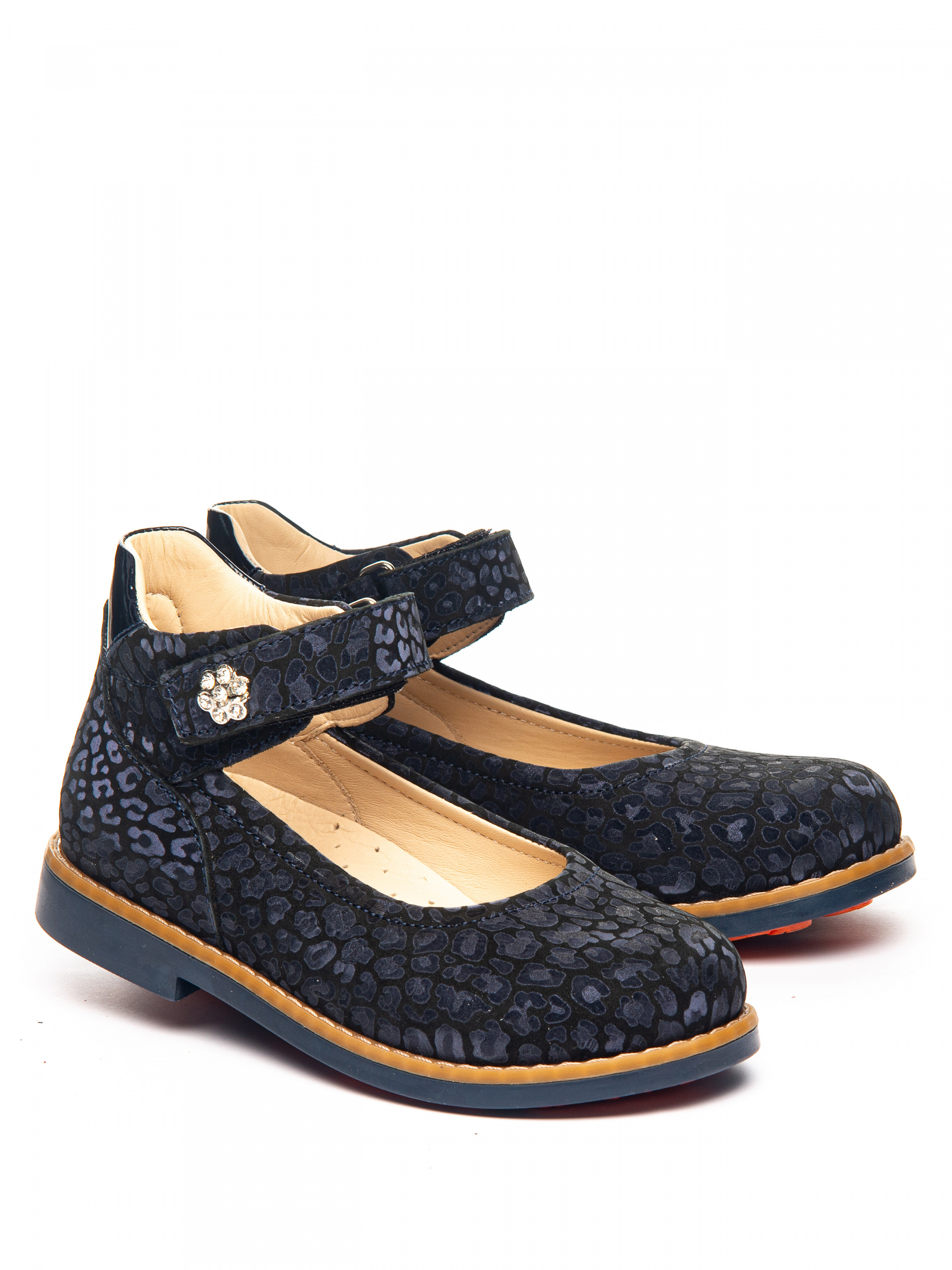 Школьные туфли выполнены из натурального нубука с нанесением принта. Фиксируются на ножке с помощью липучки. Подкладка и стелька изготовлены из натуральной кожи. Подошва из - термопластичной резины. Имеют высокий и жесткий задник, анатомический супинатор и каблук Томаса. 28 р. - 19 см. 29 р. - 19,5 см. 30 р. - 20 см.